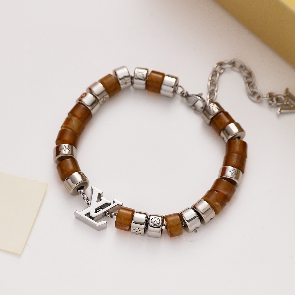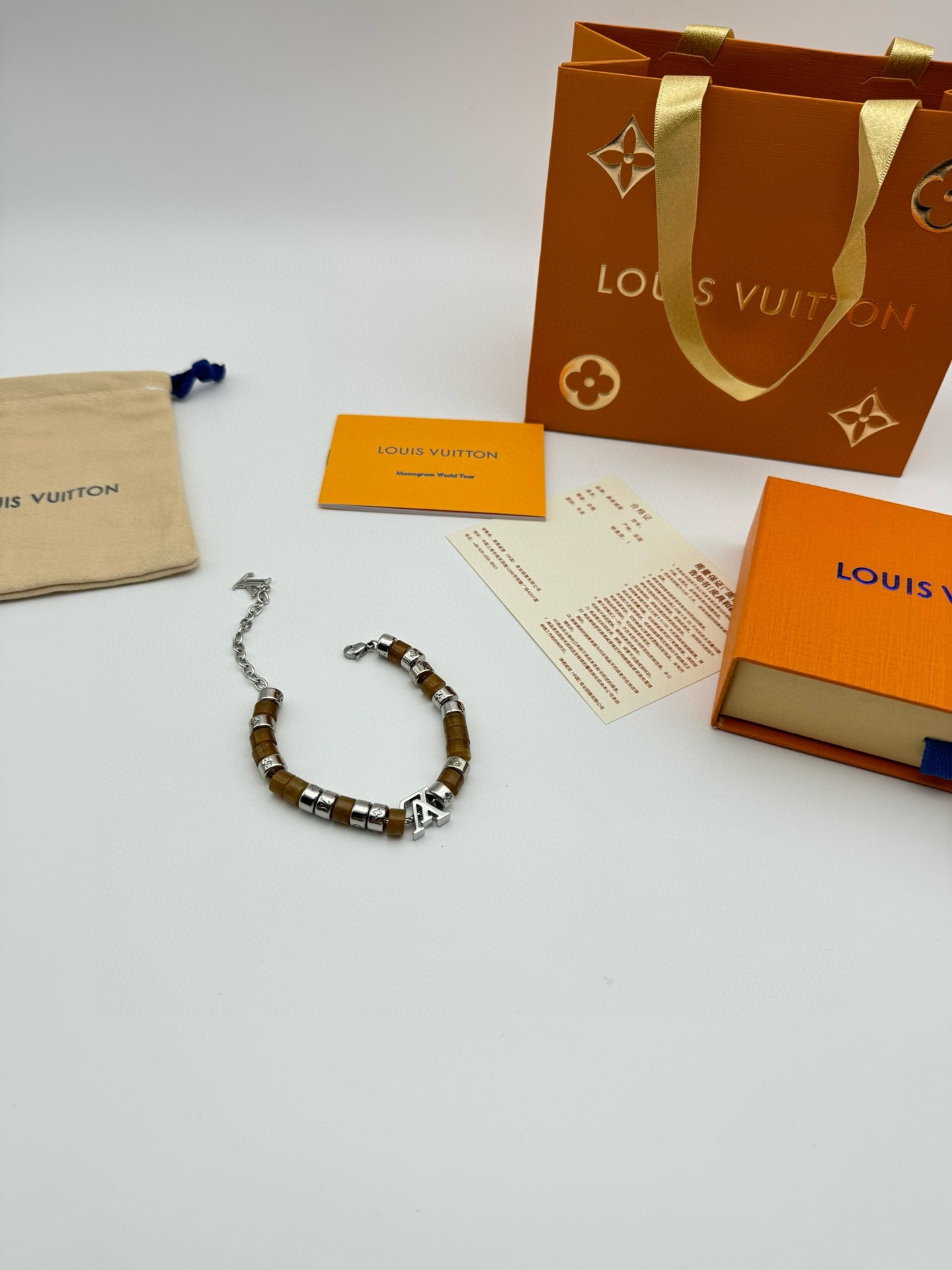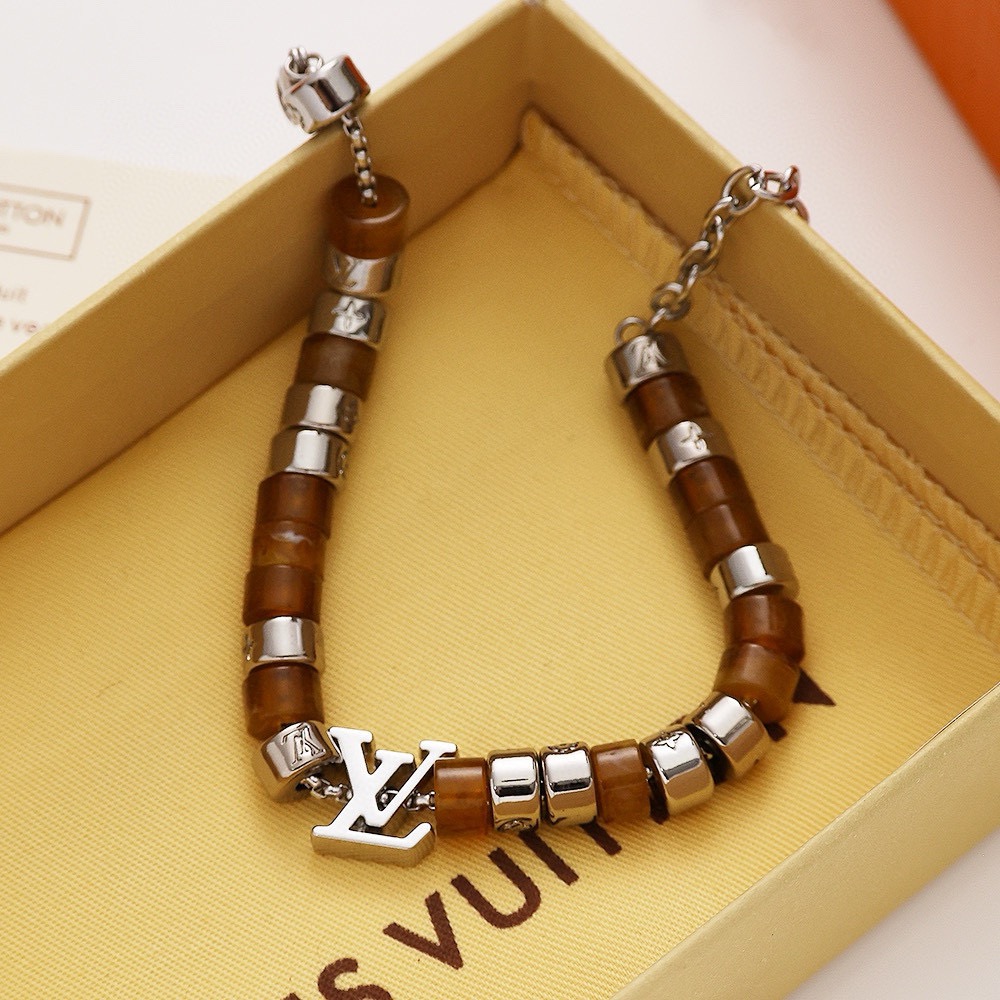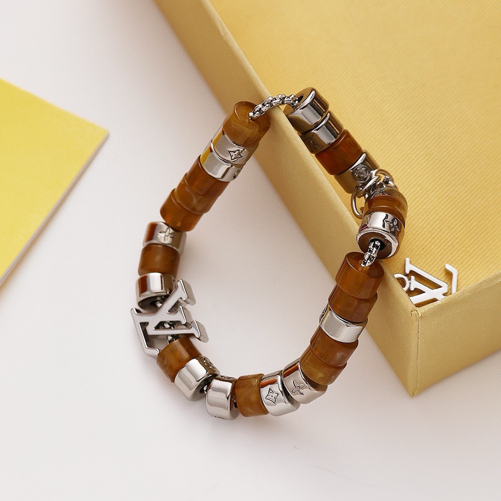 LV路易威登棕色串珠手链 配全套包装 LV Paradise 手链依托细腻匠艺 展现树脂和金属串珠的融合 象征无拘无束的自由心灵 金属链环镂刻 Monogram 图案 可调节棉绳确保舒适佩戴 可为任意着装注入一抹亮采 详细特征