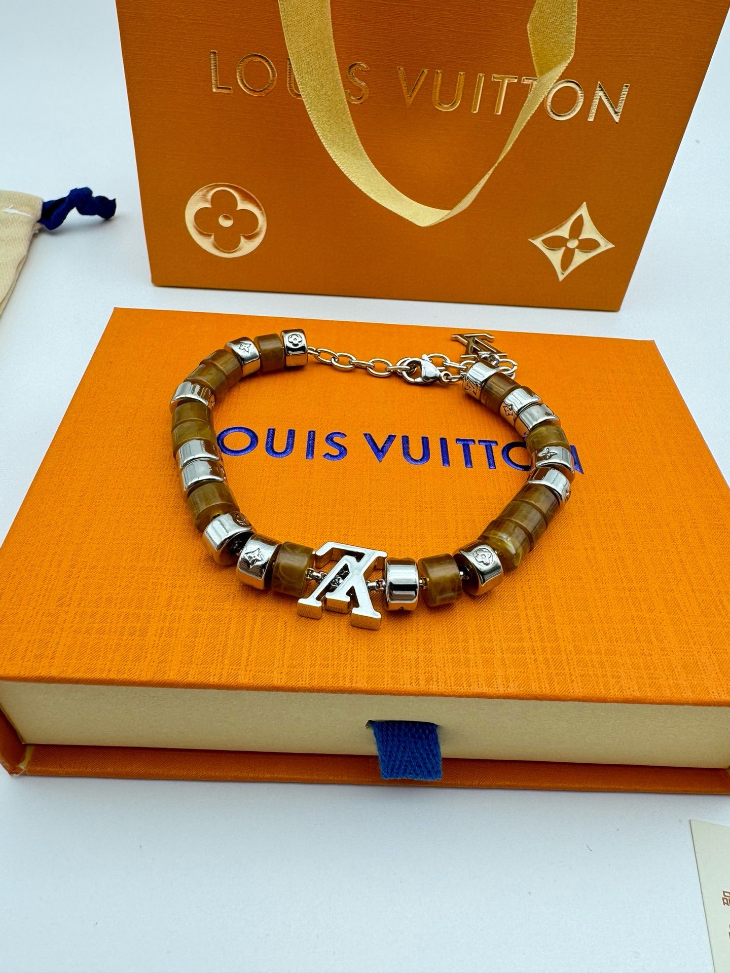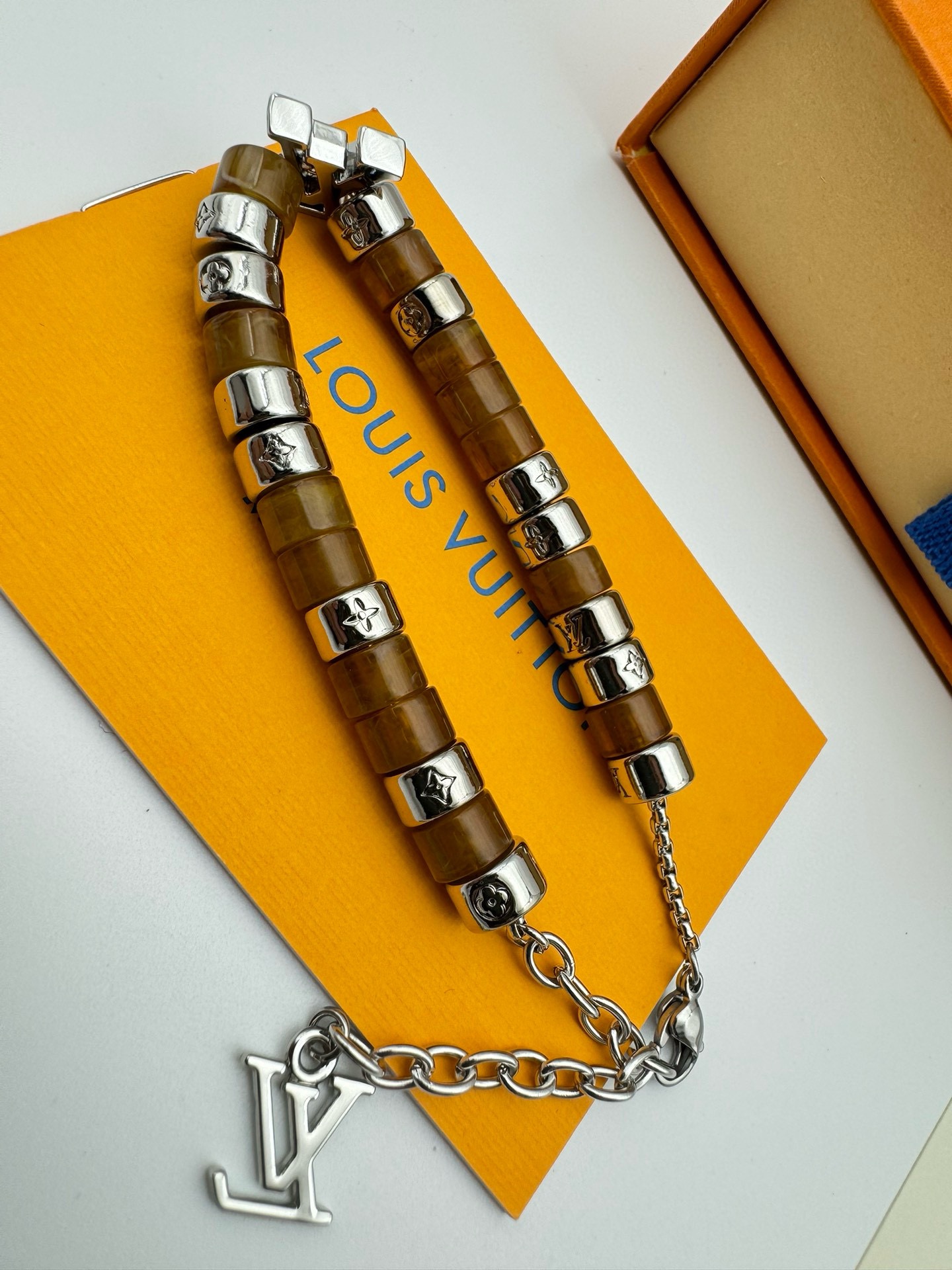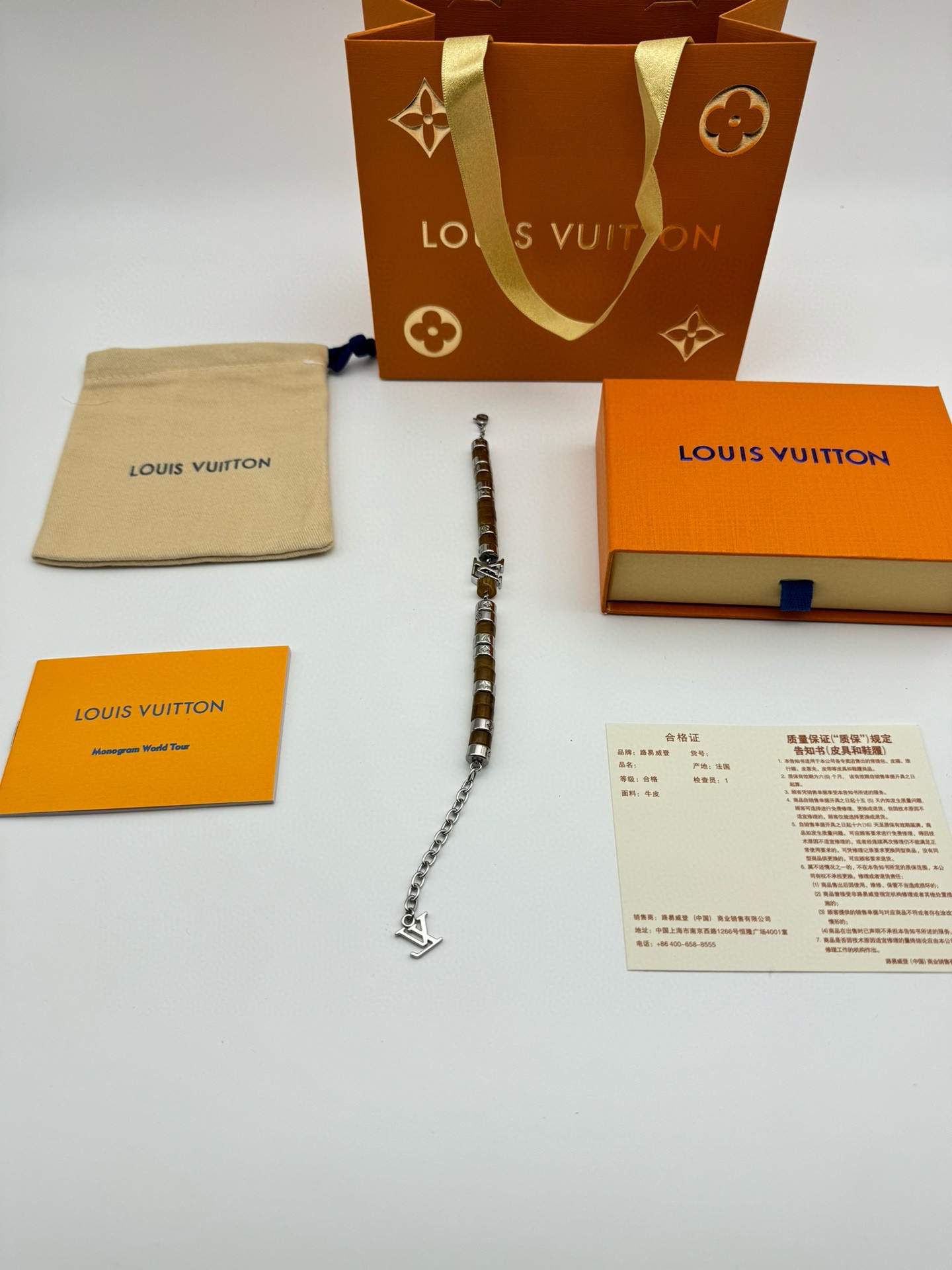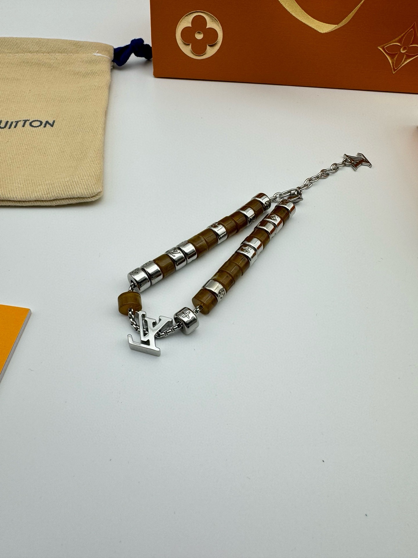 LV路易威登棕色串珠手链 配全套包装 LV Paradise 手链依托细腻匠艺 展现树脂和金属串珠的融合 象征无拘无束的自由心灵 金属链环镂刻 Monogram 图案 可调节棉绳确保舒适佩戴 可为任意着装注入一抹亮采 详细特征
