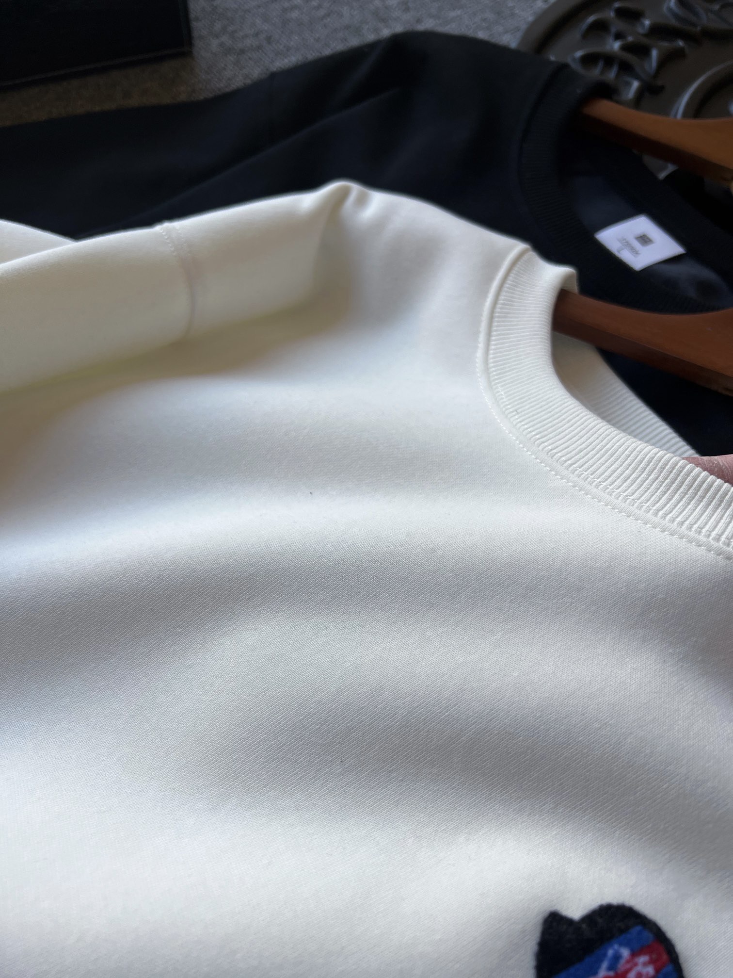 细节细节再细节 蒙口家刺绣毛巾绣彩标加绒加厚圆领卫衣 胸前采用最新3D立体高密彩色毛巾绣工艺 精致蓝红蒙口标识 十分精致 罗纹下摆全部采用三针五线加固锁边工艺 双袖拼接压线细节做工业界天花板