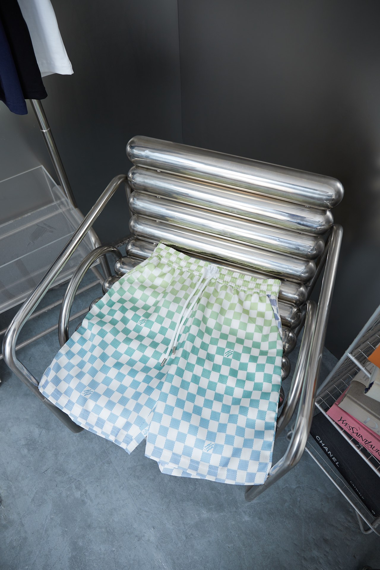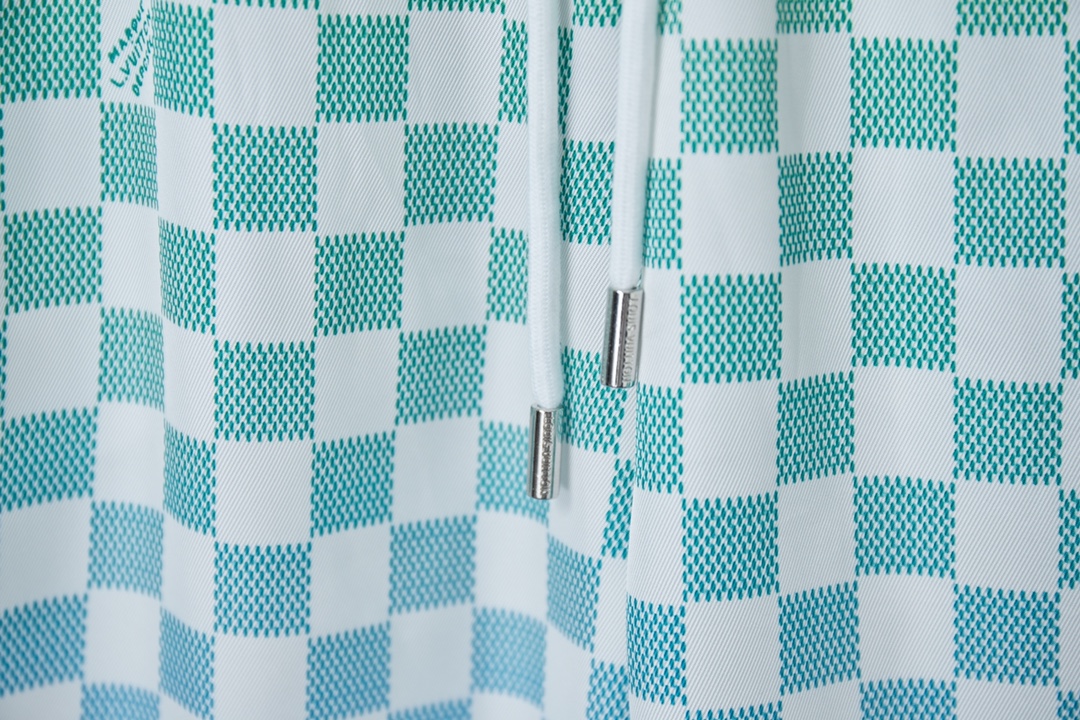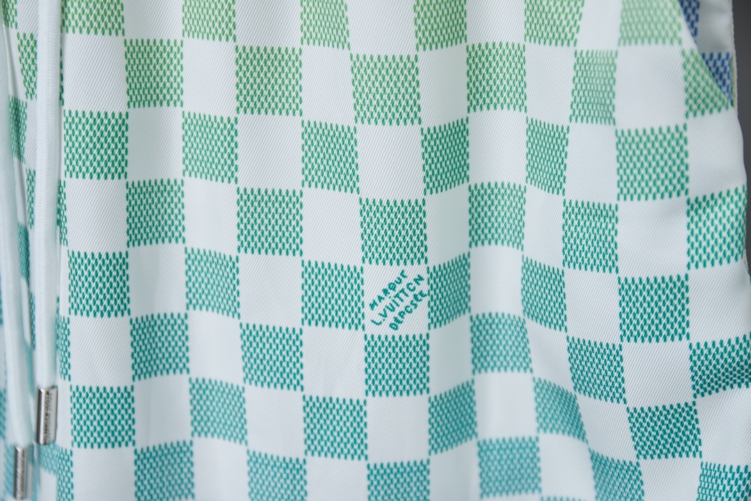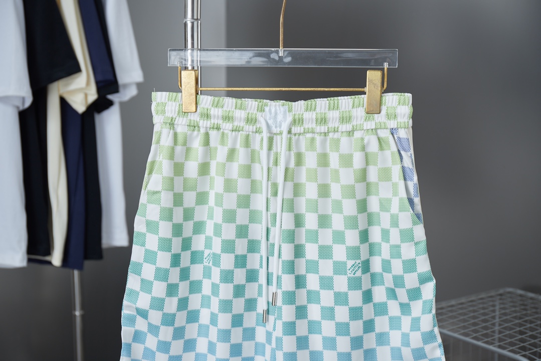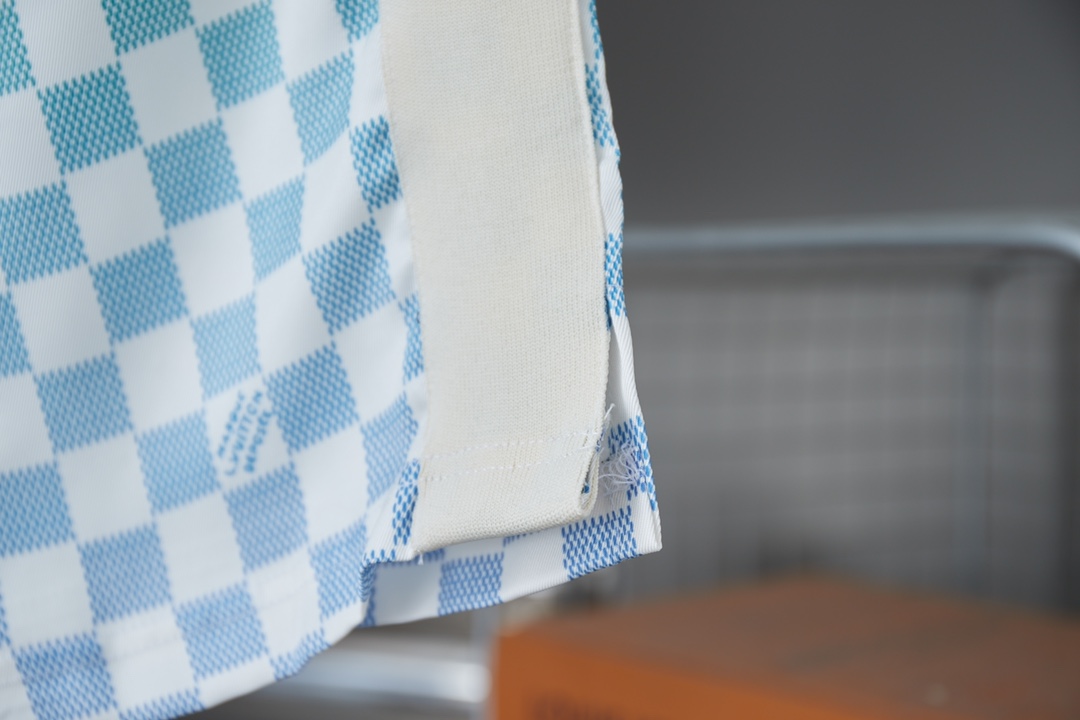 v 25ss新款款 桑蚕丝渐变短裤 效果 Damier 图案融入 Marque L Vuitton Déposée 标识可与同款短裤共筑夏日学院风造型条纹针织衣领和两侧针织嵌饰流露运动气息暗扣前襟和顶部明纽扣营造马球衫般的视觉幻象 男女同款 S M L XL