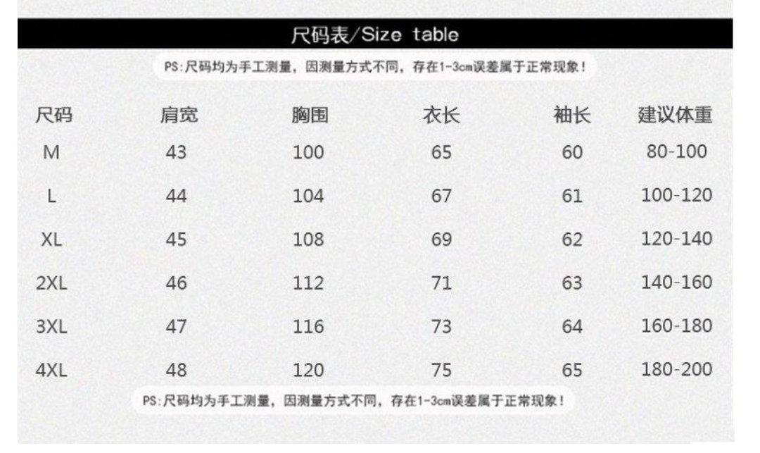 尺码 M 4XL