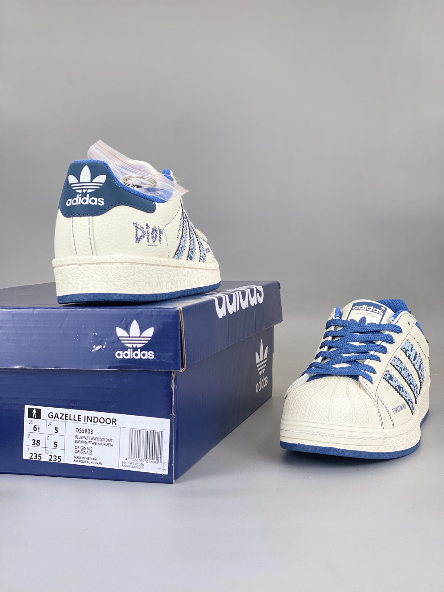 Adidas Superstar Dior联名 米白蓝迪奥印花 经典贝壳头造型 搭配米白与藏蓝的清爽配色 高端定制 低帮休闲板鞋 定制鞋盒 大厂纯原品质出货 超高清洁度 皮料切割干净无任何毛边 细节完美 52o 货号 DS5808 尺码 36 45带半码