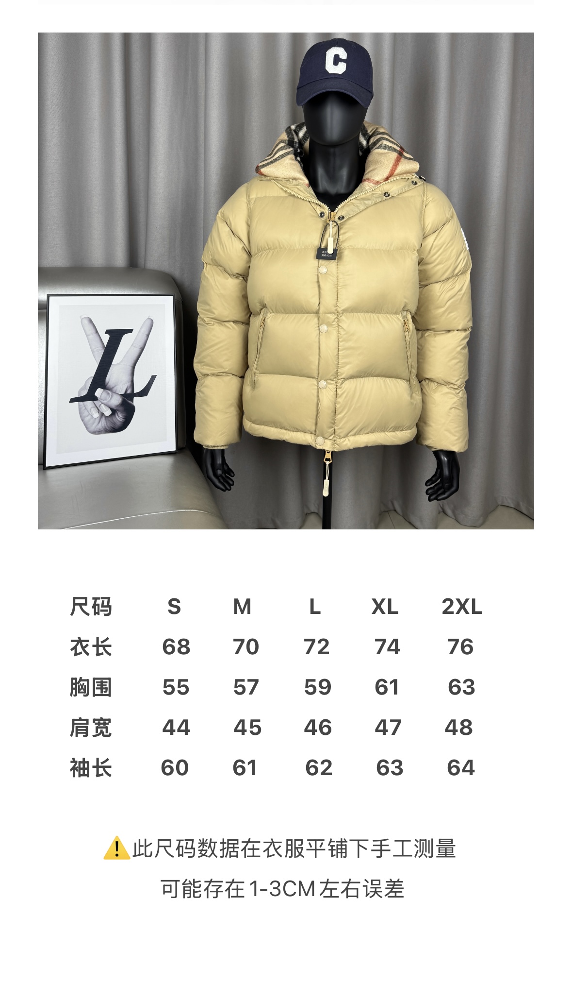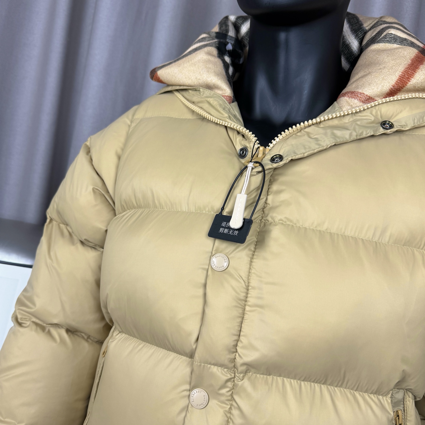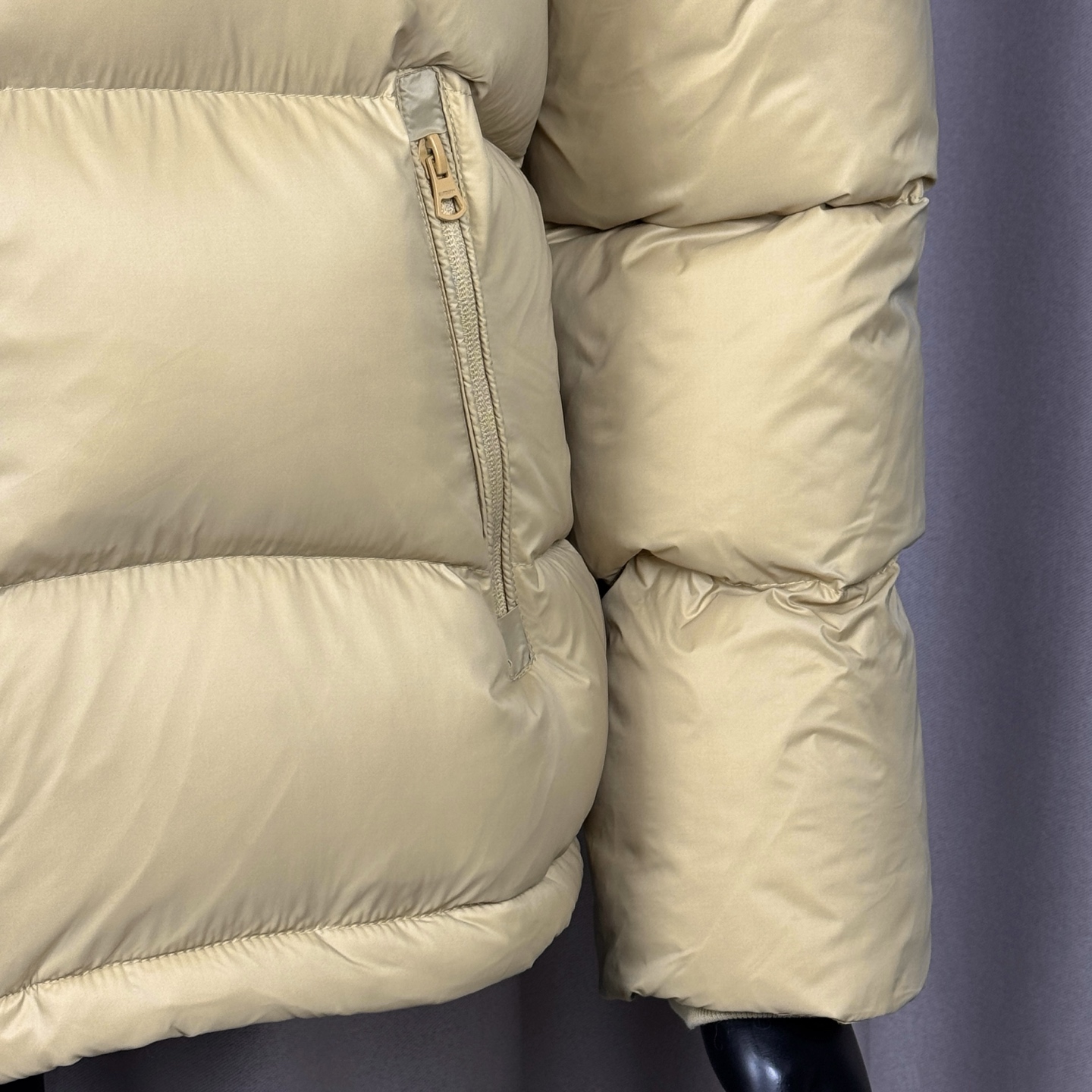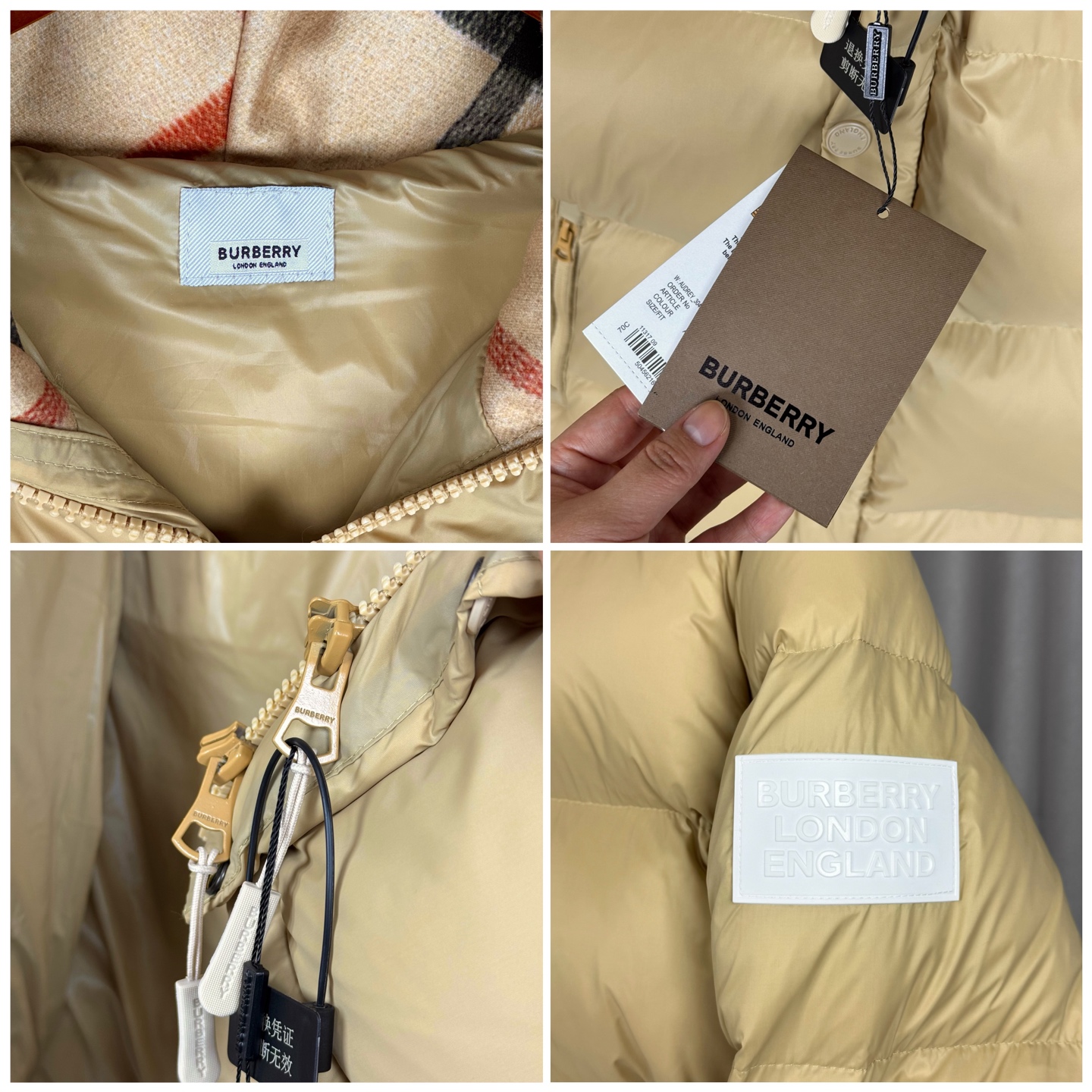 面料采用原版一致的定制防水防静电布料 内里采用尼龙双层封禁设计 光泽平整度和原版放在一起也看不出差别 袖子可拆卸当马甲穿 一衣两穿 分区填充420克80白鸭绒 蓬松度超好轻便不厚重 扣子和拉链全部带有logo 内里有网兜口袋 所有的口袋都带有拉链 方便收纳物品 左袖经典硅胶字母logo和帽子经典毛呢格纹 低调又不失品牌调性 袖口采用防风松紧设计 下摆采用可调节抽绳 使得上身更加保暖