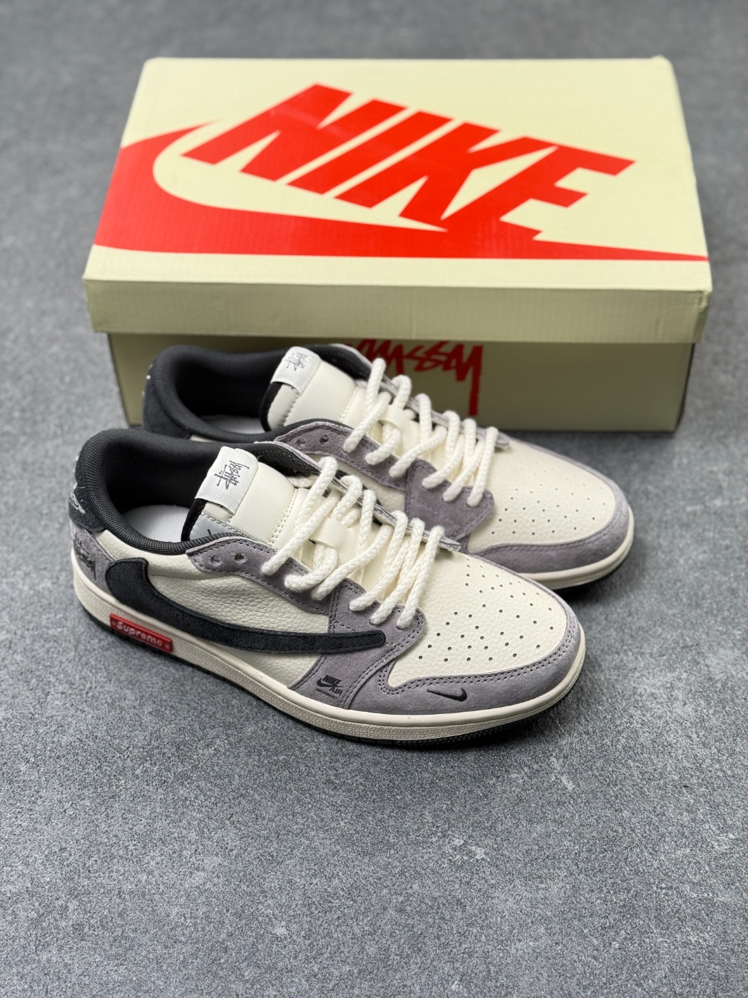 Travis Scott x Fragment Design x Jordan Air Jordan 1 Low OG SP Supreme斯图西联名 双拼米灰红标 多方联名合作融合了Travi翻毛蓝勾s Scott 独特的音乐风格 藤原浩个性的设计风格以及Jordan品牌的经典元素 使其成为一双具有独特身份和价值的鞋子 清新而立体的外观加上联名标识更突出了其独特身份 这种配色方案显示出活力和时尚感 在视觉上引人注目 鞋身的质感和细腻的细节处理使其显得高端而格调十足 这款 倒钩 联名是设计与创意完美结合 融合多方的个性风格是一款备受瞩目的潮流鞋款 低帮休闲板鞋 定制鞋盒 大厂纯原品质出货 超高清洁度 皮料切割干净无任何毛边 细节完美