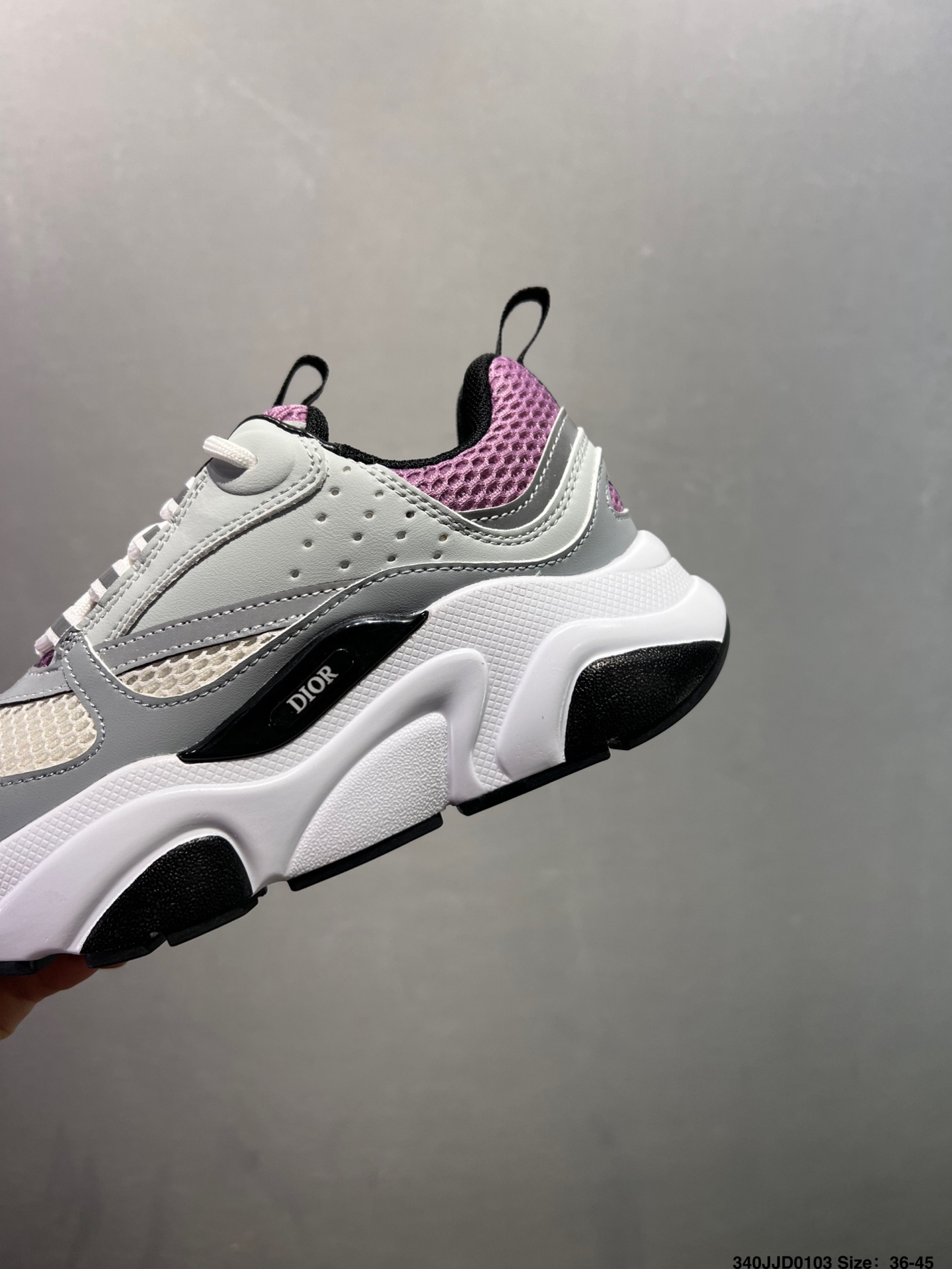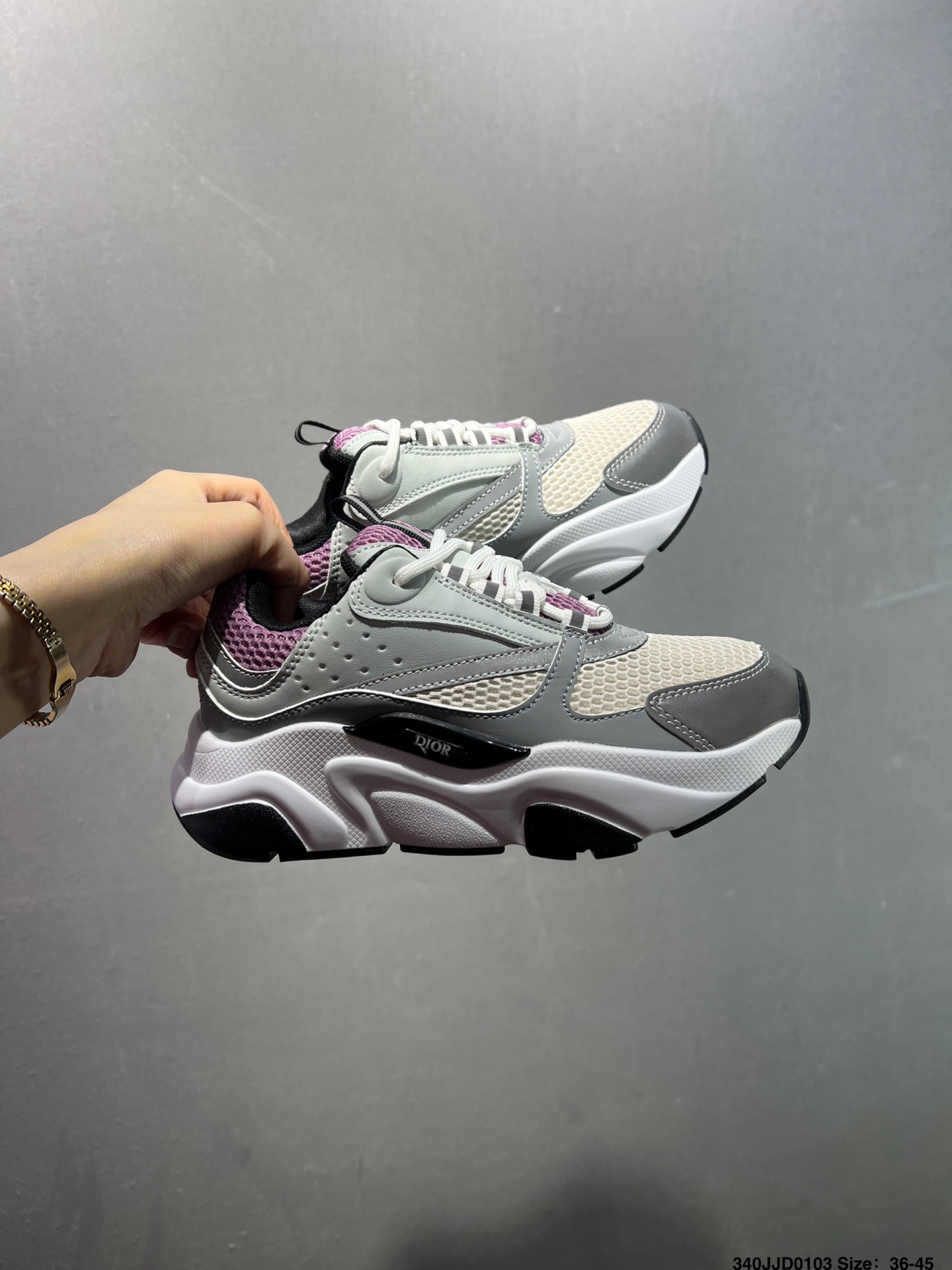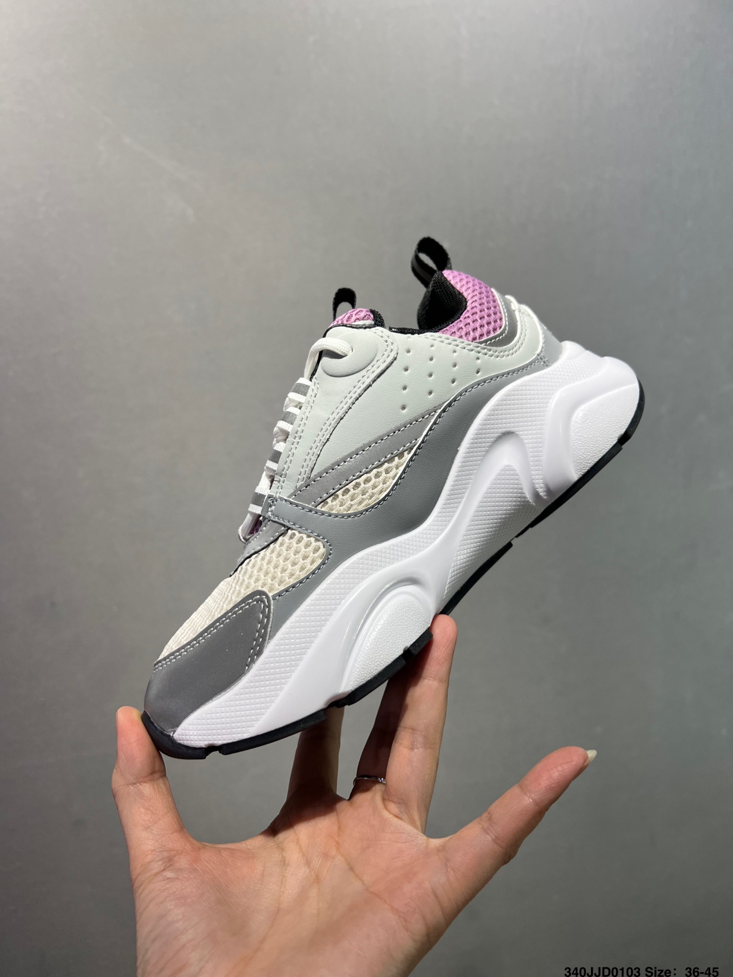 顺应复古市场的趋势的 Dad Shoes风格鞋款鞋舌上的Dior标志 也注明了这双鞋是B30的型号 B30运用了质感细腻的皮革和网眼布面材质拼接成鞋身 鞋身两侧有显眼的字母CD 表明身份 鞋身多处线条勾勒细节 让鞋子看起来不那么单调 复古味十足
