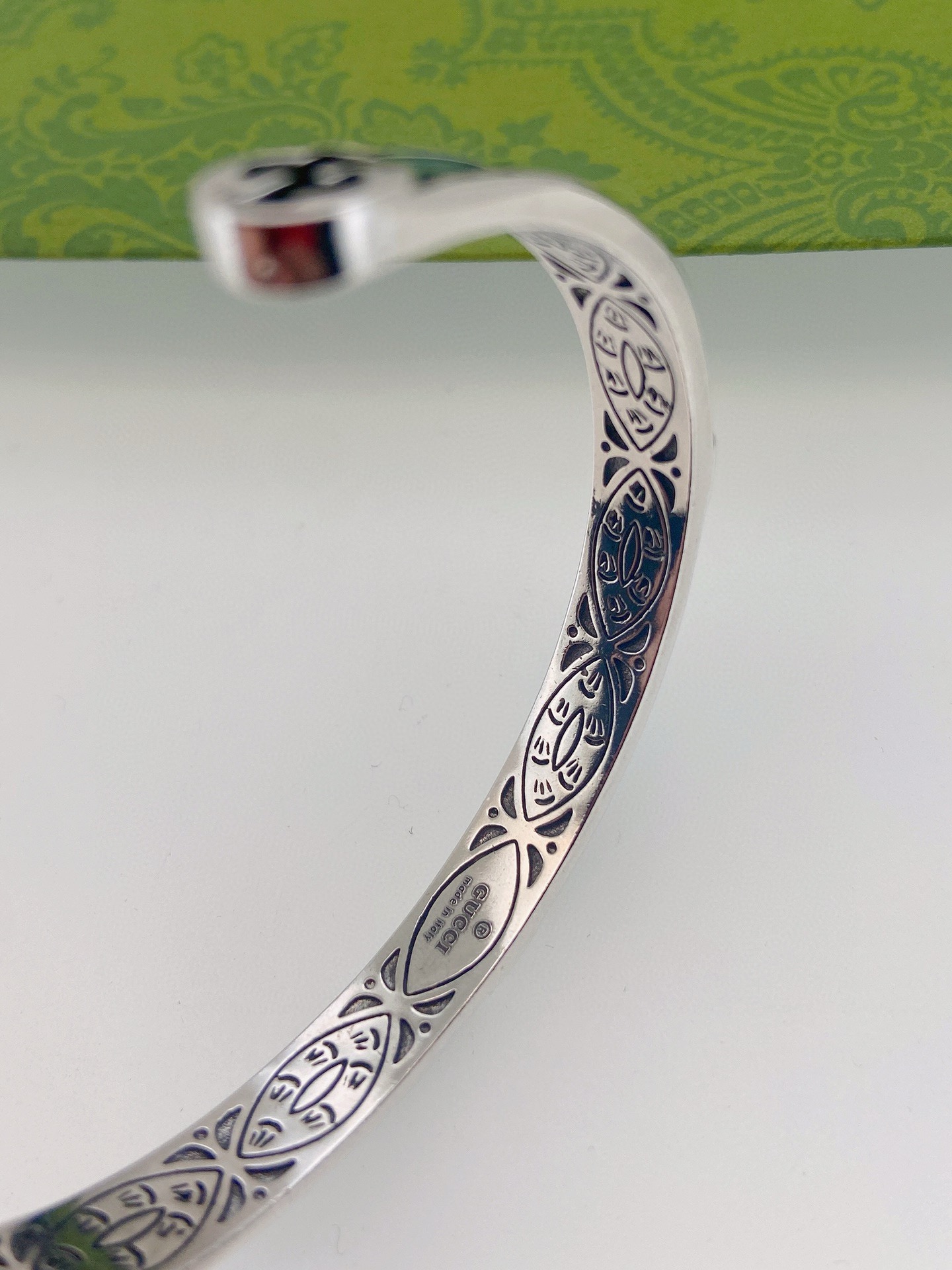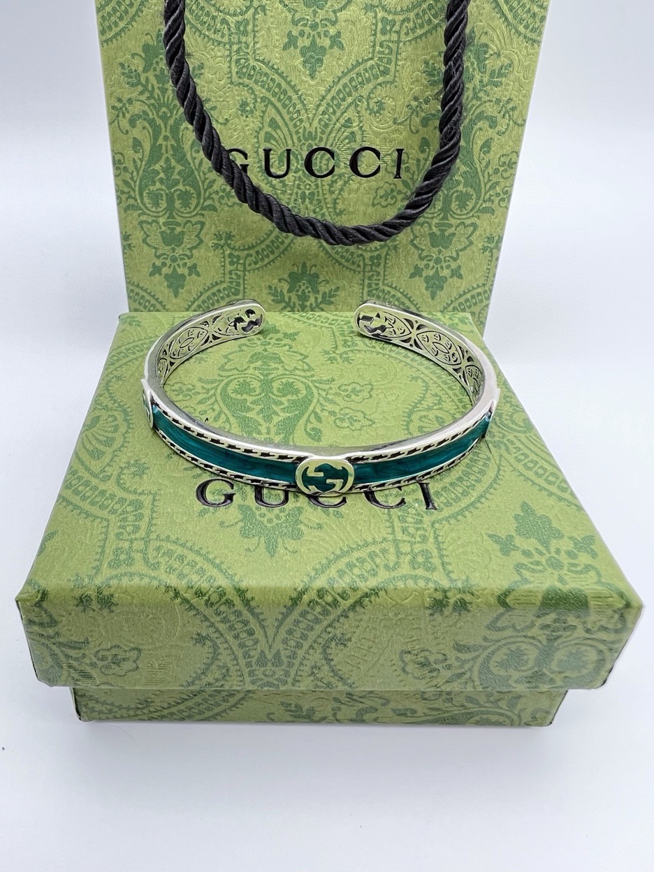 创始人Guccio Gucci姓名的首字母以互扣式双G形式呈现在这款手链上 Epilogue系列让高辨识度的品牌符号元素回归时尚前沿 传达了时尚永不落幕的理念 这款手链采用泰银制作 饰以鲜艳的宝石绿色珐琅和织纹滚边