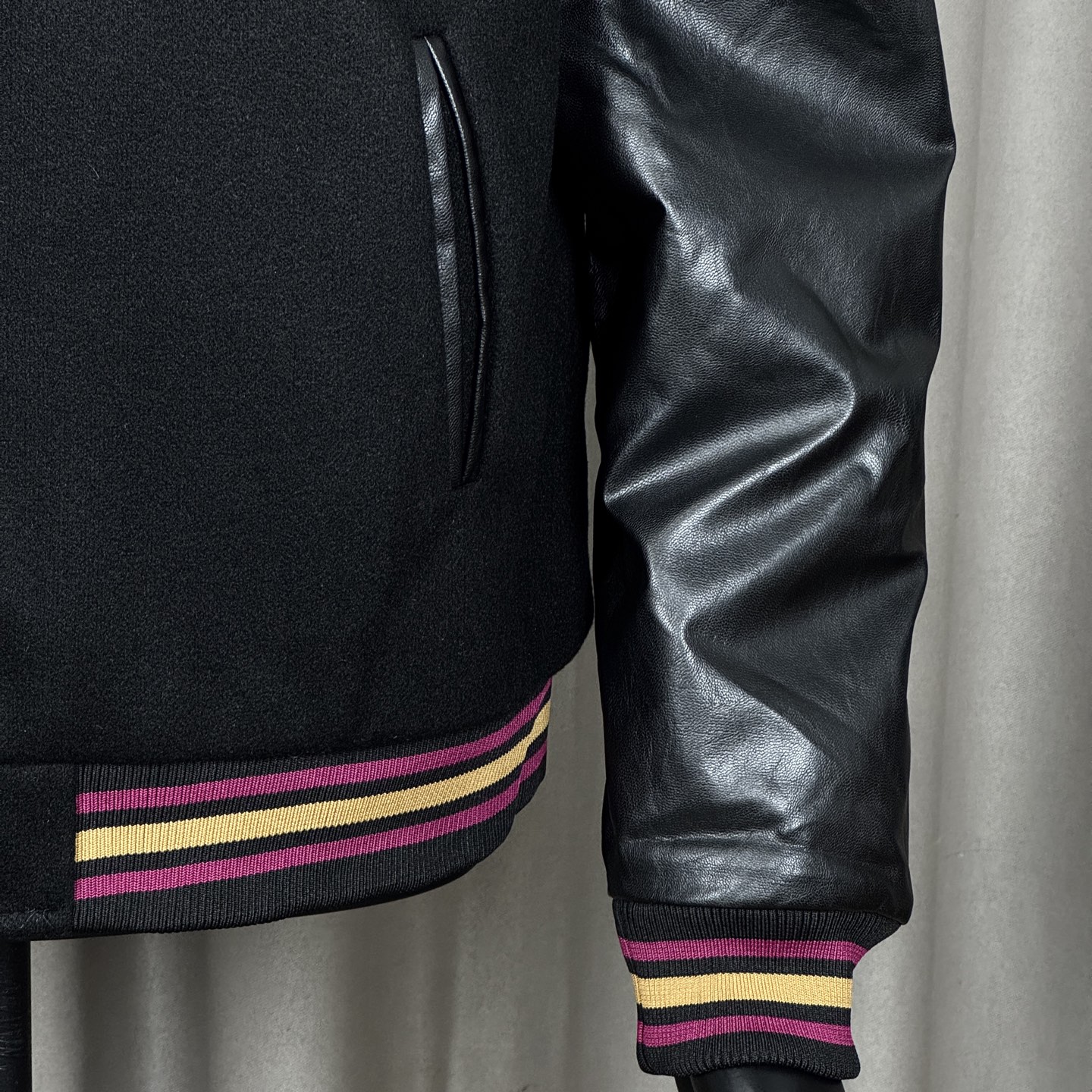 面料采用高克重毛呢面料拼接荔枝纹皮料 领口袖子和下摆全部针织加密加宽厚实拼色螺纹 防风保暖 搭配内里菱格夹棉 帅气又不失温度 重磅刺绣和贴布章仔图案 给整件衣服增添了几分色彩和质感 内里配备口袋 棒球服经典按扣设计 宽松的版型男女都好穿