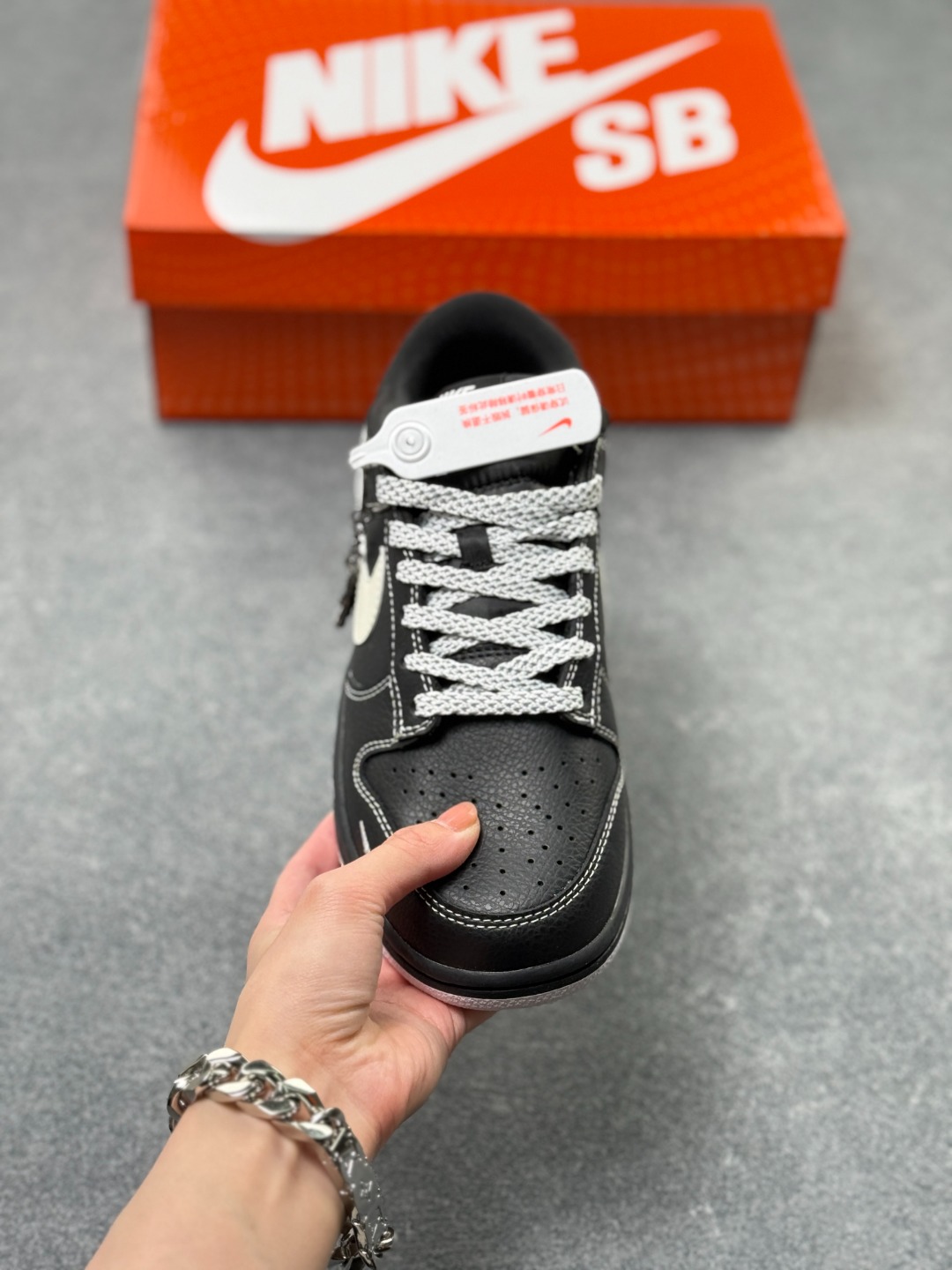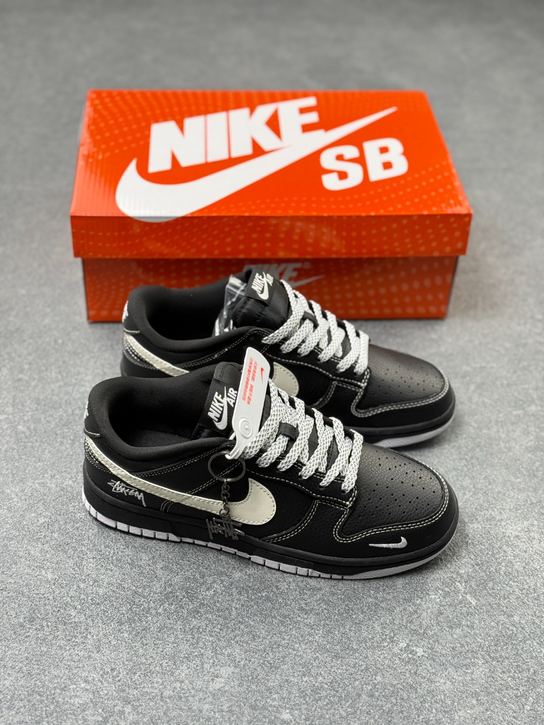 细节藏满彩蛋 鞋侧 Stussy 手写涂鸦 Logo 迷你刺绣小勾 还挂着金属链条吊饰 连鞋盒都是 SB 系列专属橙盒 仪式感直接拉满
