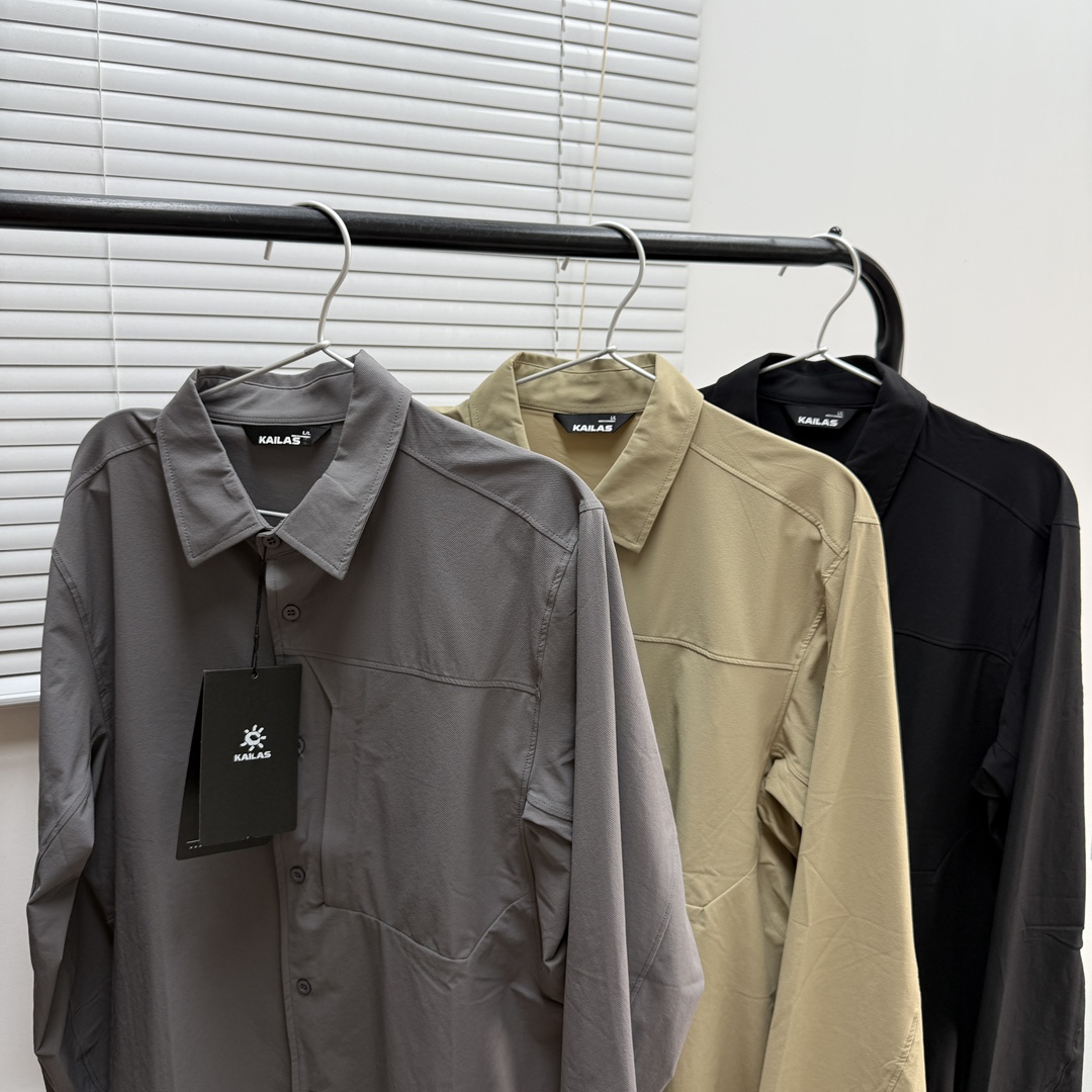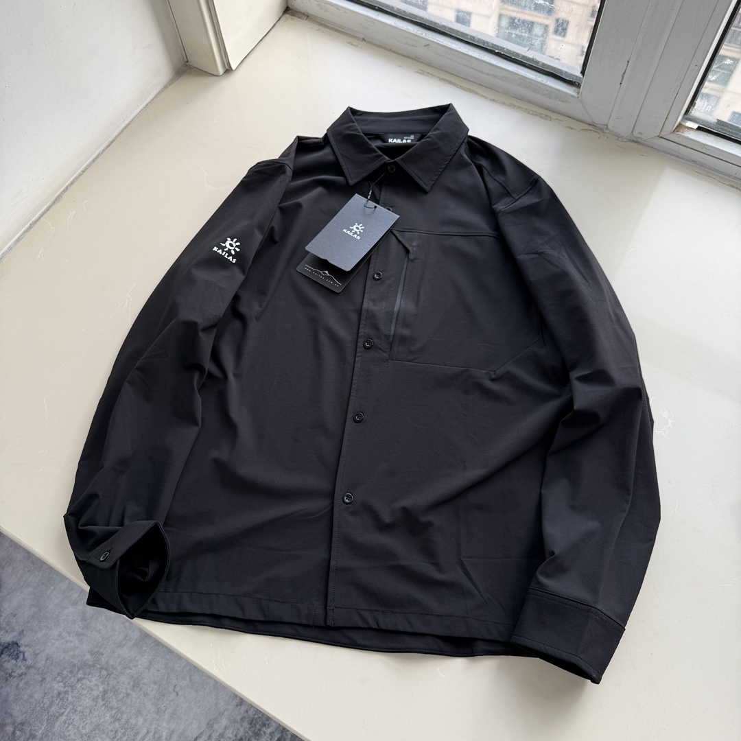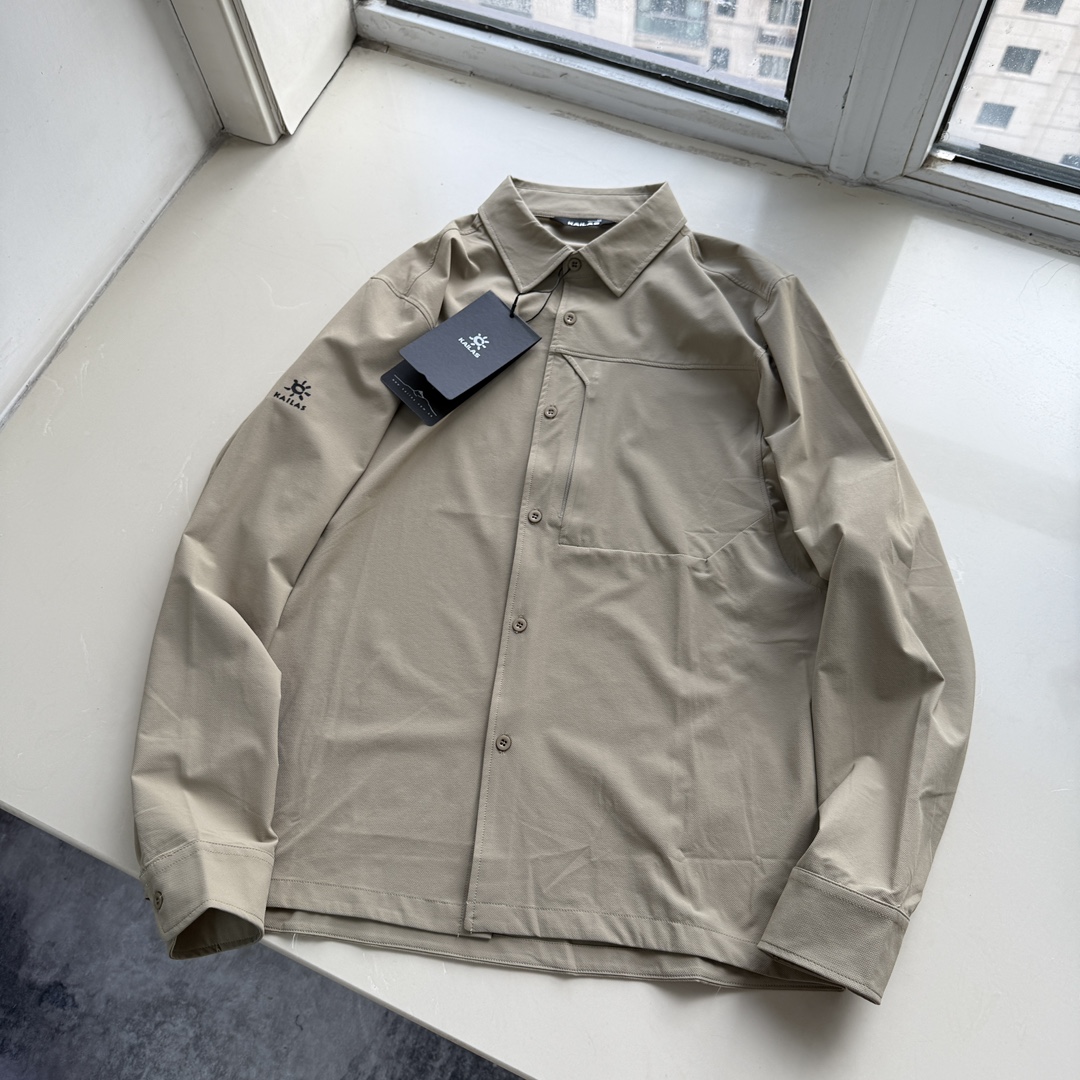 2025 KAILAS 凯乐石秋季新品 男士户外长袖衬衫 户外运动 功能性单排开襟衬衫 非常有质感的一款衬衫 日常通勤男士休闲衬衫款式特征 采用翻领设计 单排扣开襟 左侧有一个带拉链的口袋 整体剪裁偏休闲且具一定功能性 袖子上带有太阳logo 硅胶 面料具有一定垂坠感的合成纤维材质 可能具备易打理 速干等特性 适合日常通勤或轻度户外场景穿着 宽松版型 搭配牛仔裤休闲裤都可以驾驭 厚薄适中 春秋穿着非常舒适的一款衬衫 单穿非常户外 你值得拥有更好的衬衫 微弹性面料 胖瘦都可以穿 三色可选 五个尺码
