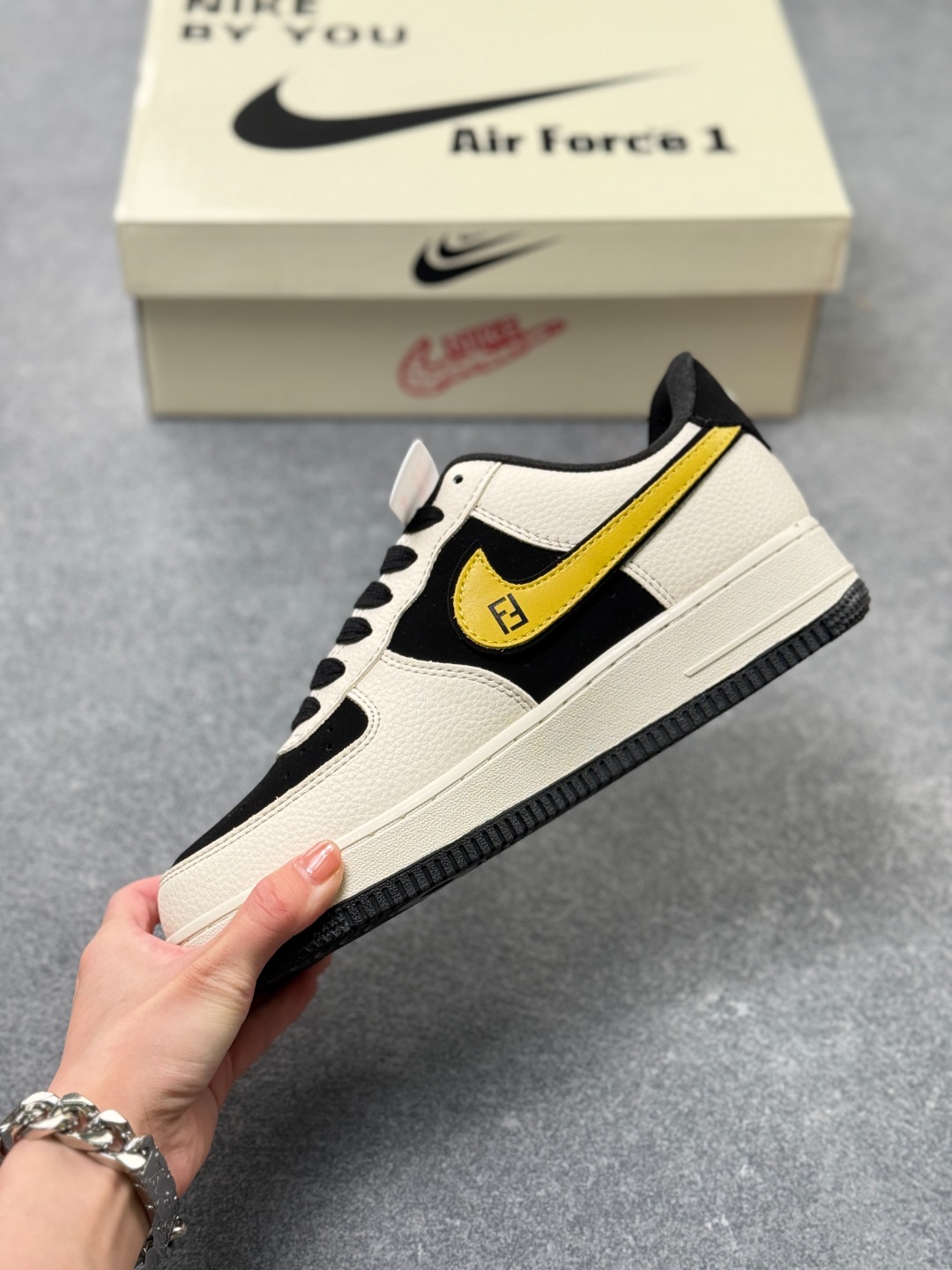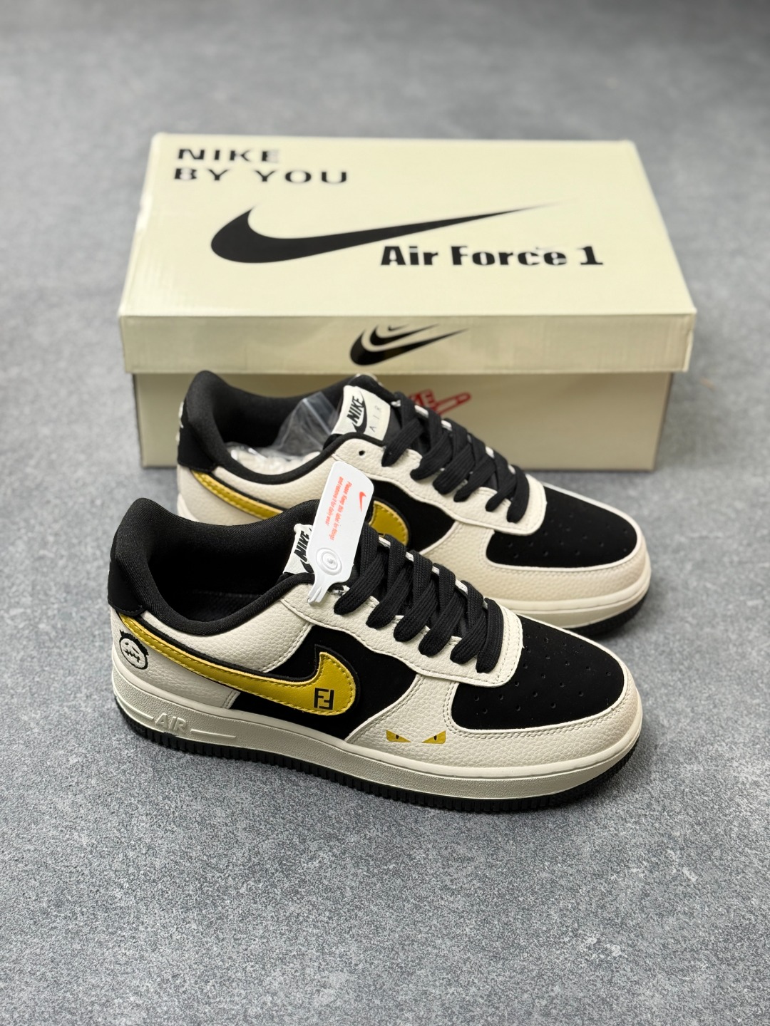 米白 黑 金三色撞色 主色调为米白色 辅以黑色框架和金色 Swoosh 点缀 鞋身带有卡通笑脸涂鸦 专属标识及芬迪装饰元素
