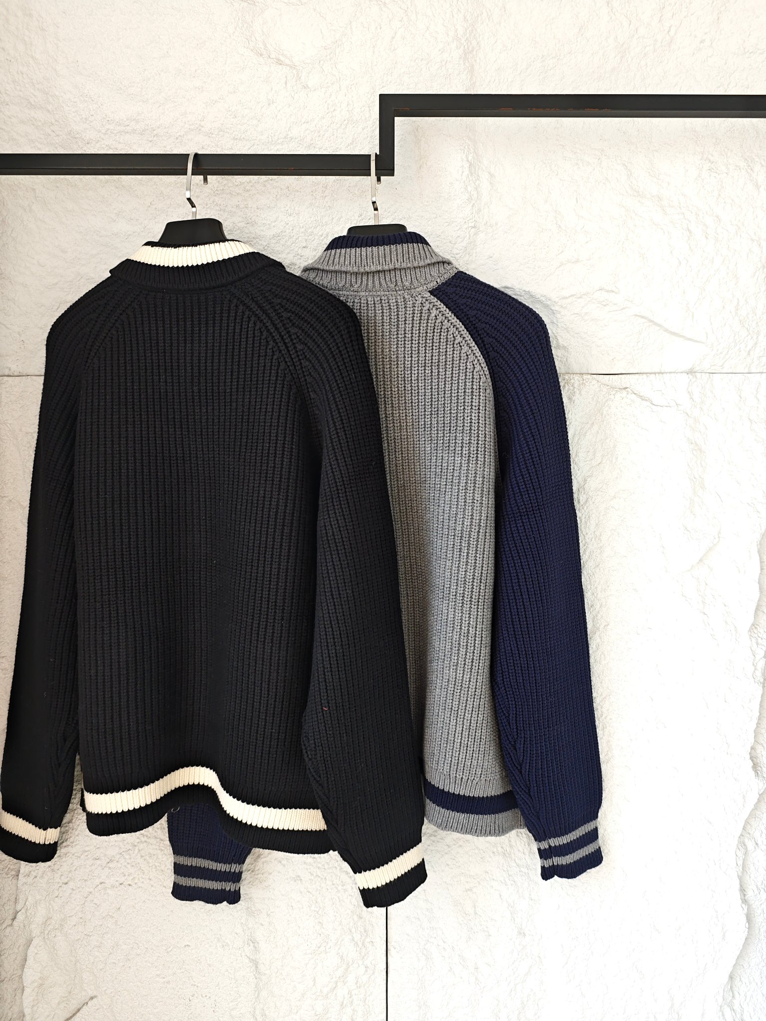 元宝针肌理自带暖糯骨感 贴肤软和还抗风 撞色拼接戳中复古心巴 立体毛巾绣五条杠干净利落 灰蓝拼色款裹着低饱和高级感 单件超1公斤 软糯厚实