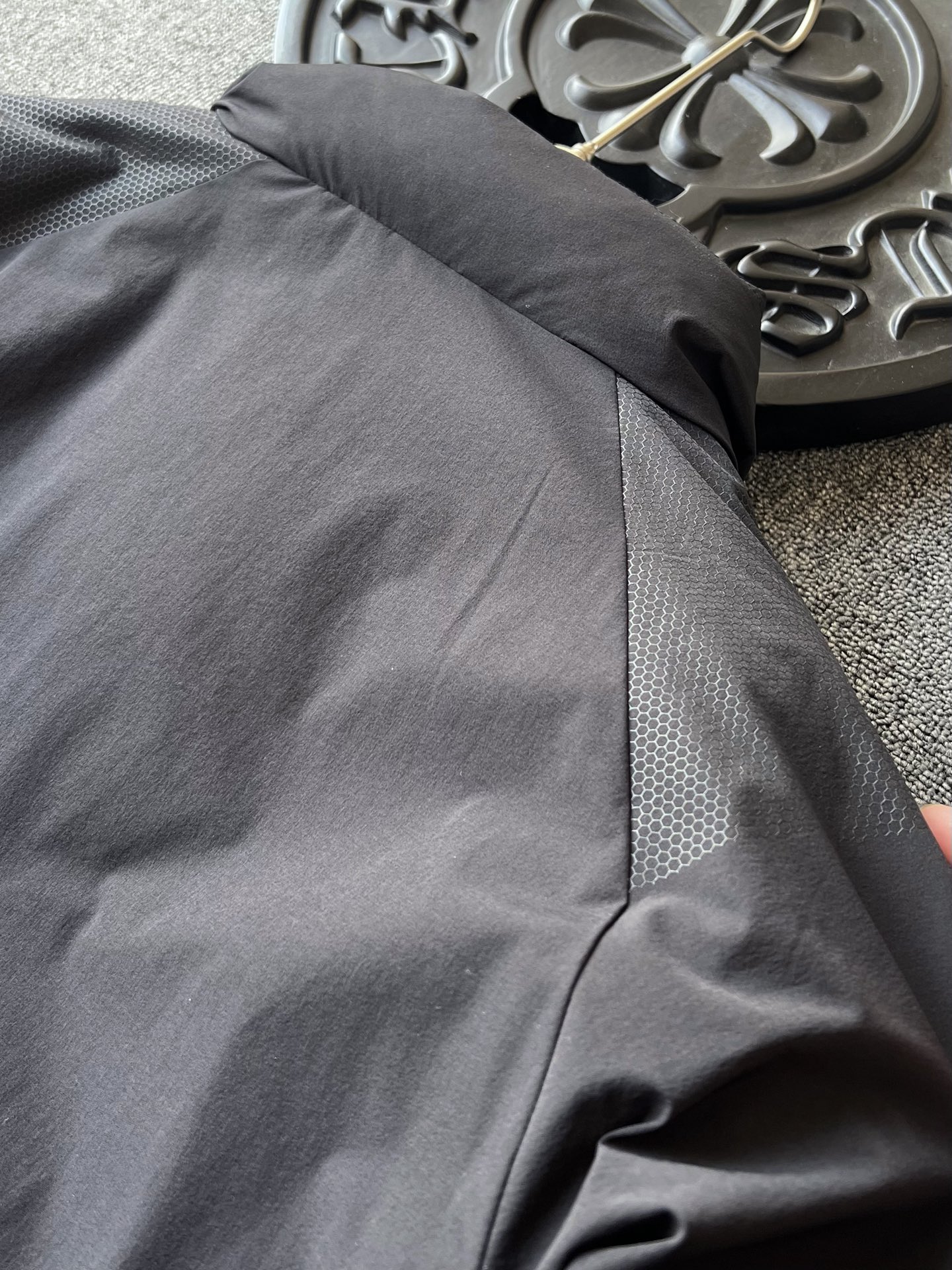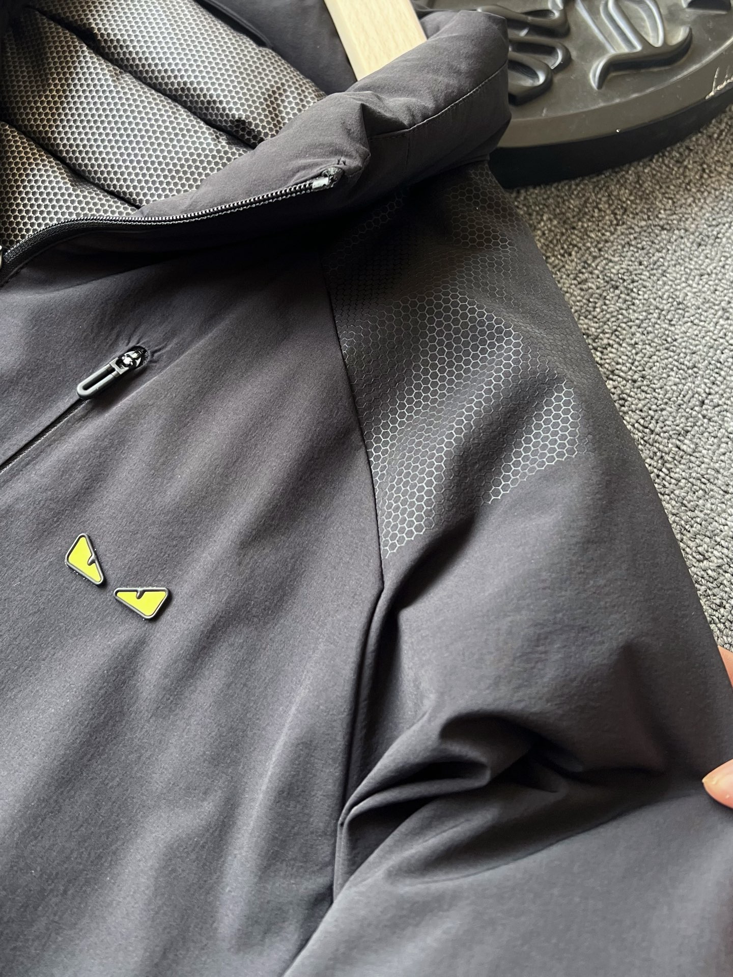 细节细节再细节 Fendi家商场新款高奢羽绒服 插肩袖设计 彰显运动活力 双肩双袖以及双侧都做了软硅胶蜂窝设计 摸起来质感很好又能增加细节质感 胸前浮雕双层黑黄组合凹凸硅胶芬迪小眼睛 十分简约精致 后背做了石墨烯分仓锁绒工艺 持续发热高效锁温 具有保护肩颈的功能性