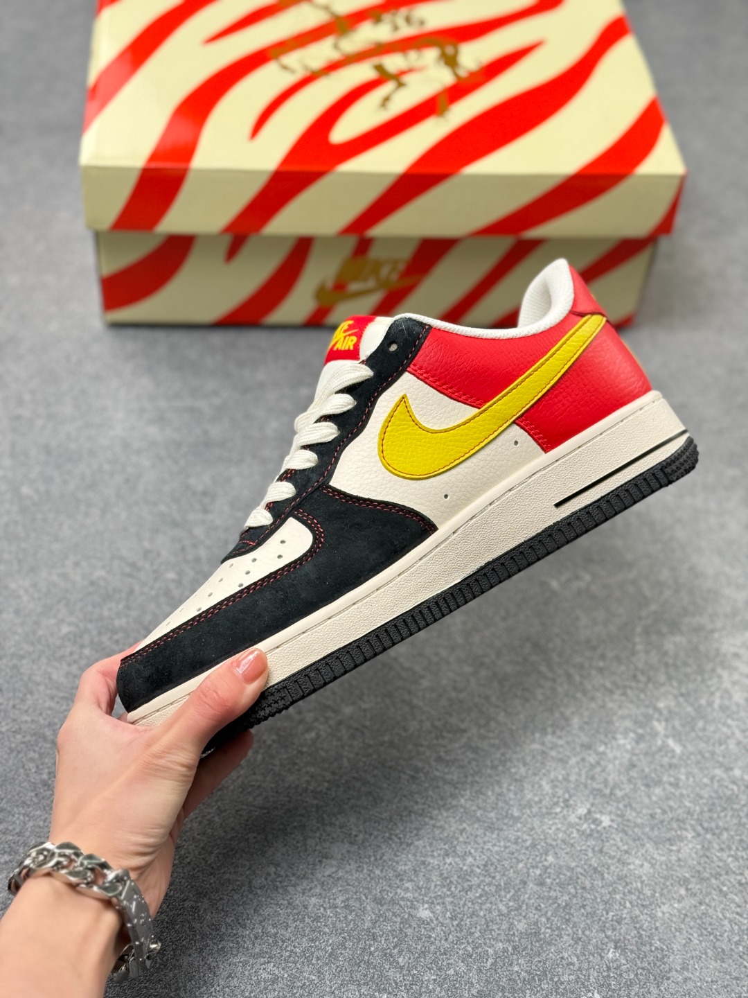 马年限定海外爆款限量发售 高端定制Nike Air Force 1 07 Low 马年限定 红金刺绣 高端定制 采用皮革 麂皮复合拼接 鞋头 鞋身主体为细腻皮革 保证挺括度 鞋侧及后跟区域用藏青色麂皮 提升质感与复古氛围 不同材质通过精密车线锁边 接缝处做了包边处理 避免边缘磨损 鞋身拼接白 藏青 正红三色 麂皮 皮革材质质感拉满 低帮休闲板鞋 定制鞋盒 大厂纯原品质出货 超高清洁度 皮料切割干净无任何毛边 细节完美