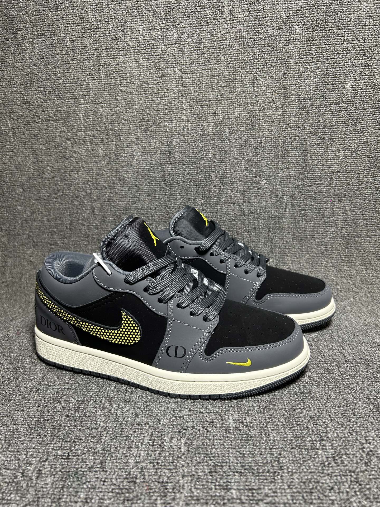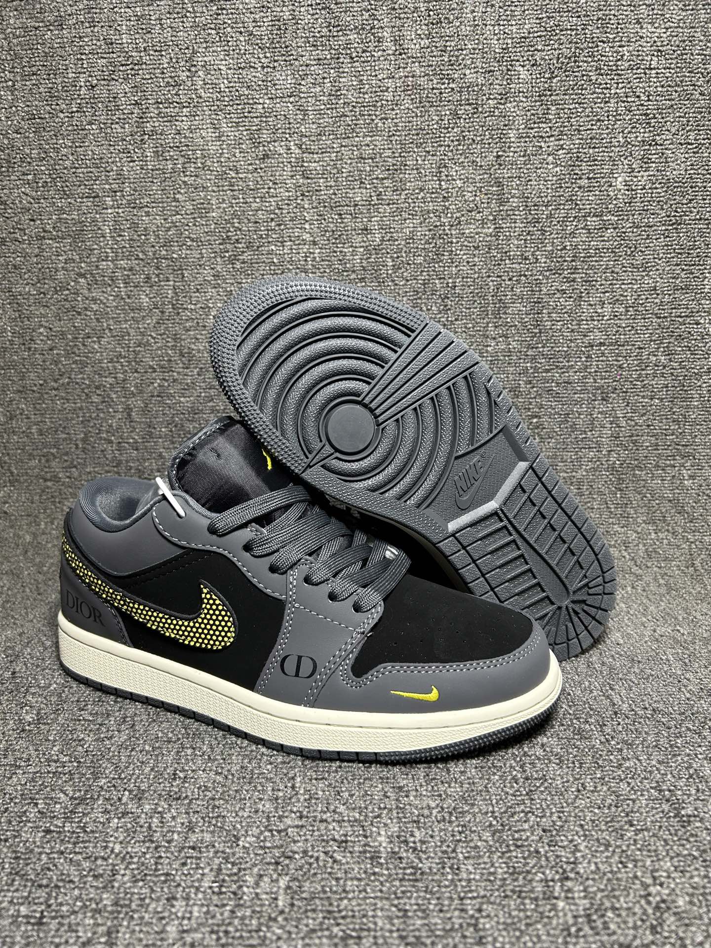 以深灰 黑色为主调 Swoosh标志采用金色点状纹理装饰 鞋身印有 DIOR 标识