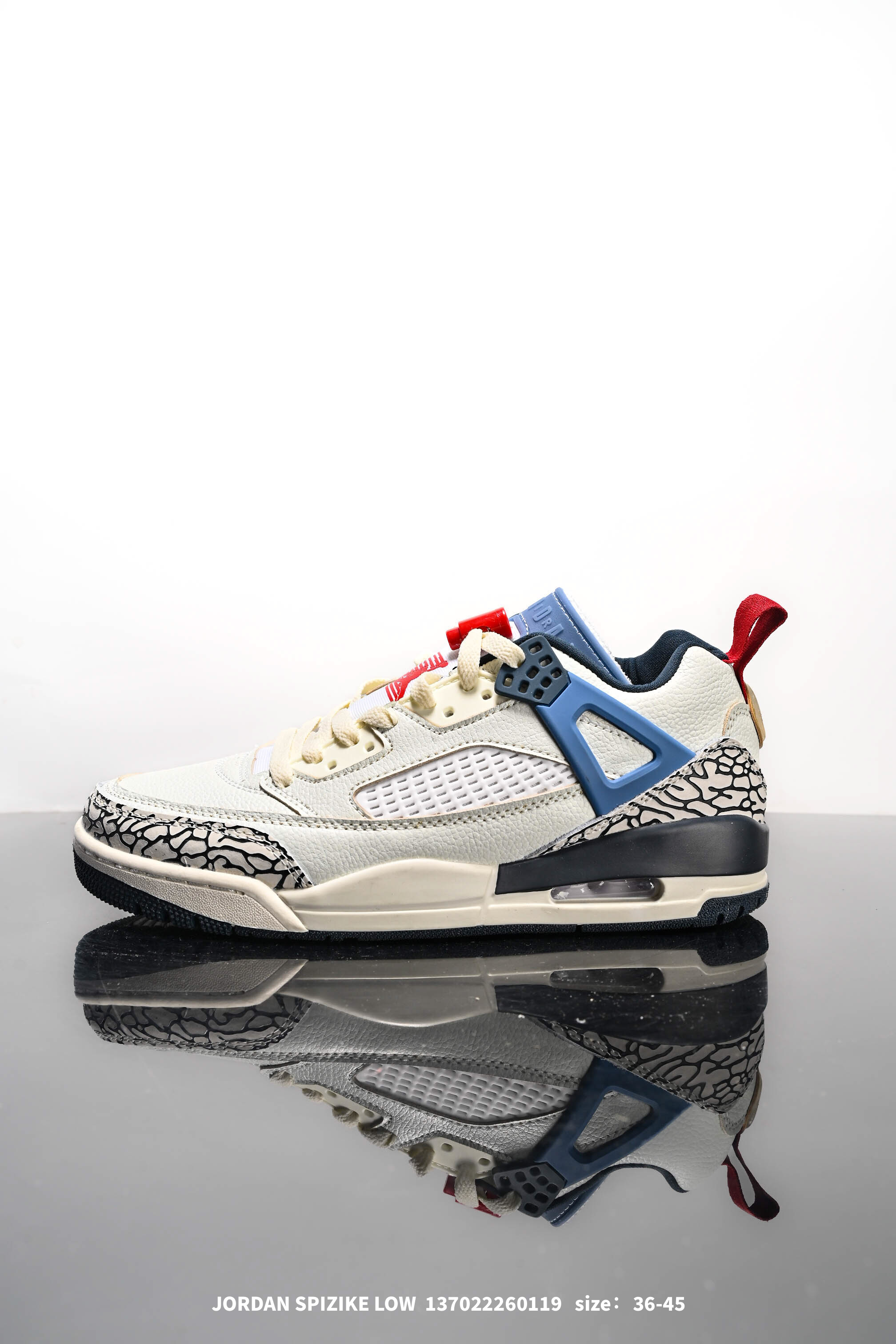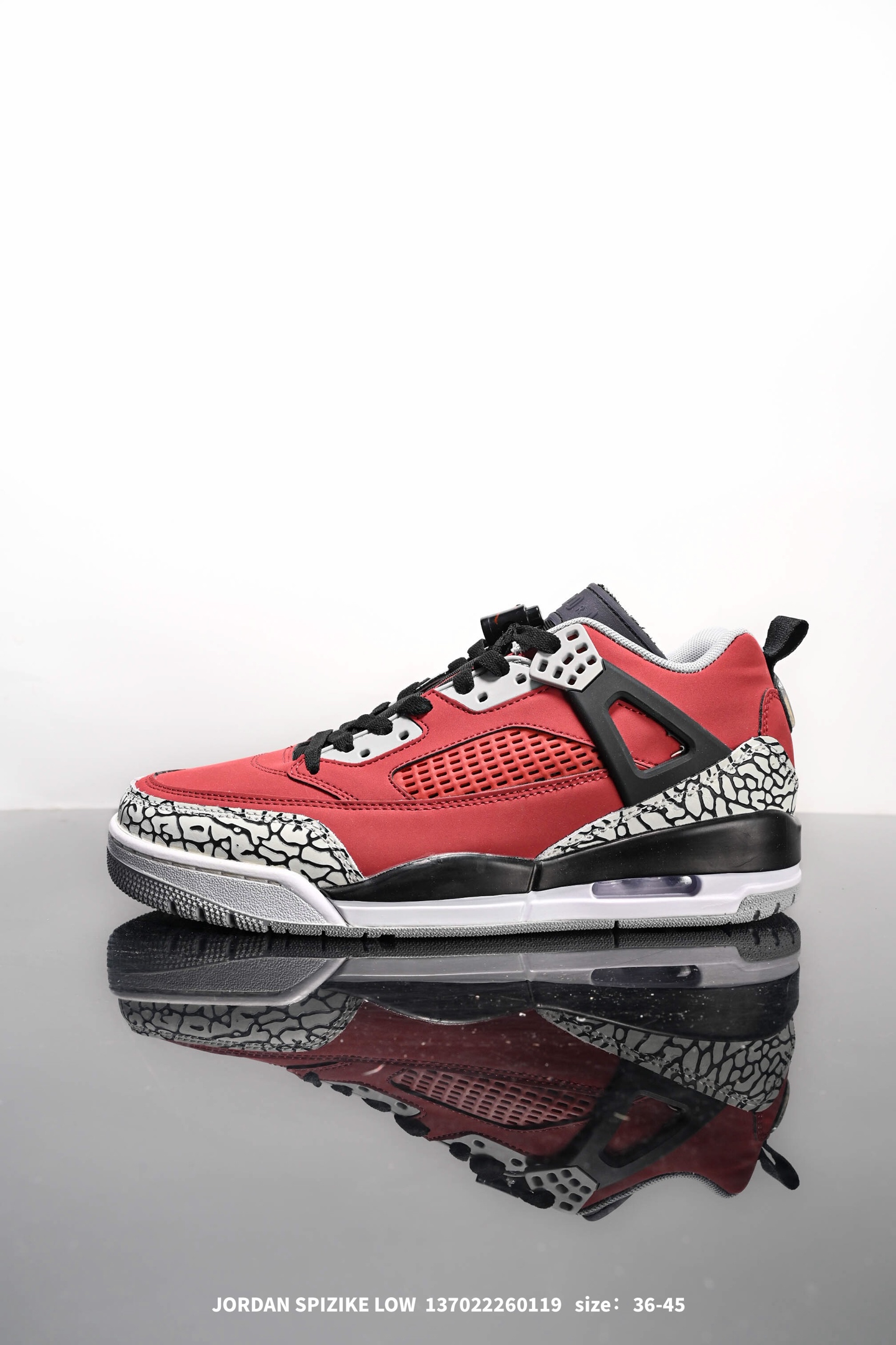 真标 耐克 NIKE JORDAN SPIZIKE LOW 经典爆裂纹复古运动篮球鞋 全新低帮造型吸睛 整双鞋在融合了 AIr Jordan 经典鞋款中的标志性元素之后 此番将以低帮鞋型进行呈现 采用独特的配色 向标志性的休斯顿油人队致敬 鞋身设计中依旧带有大象爆裂纹 鞋侧束带 塑胶网布等经典元素 之后 在鞋舌 内衬以及鞋底等位置缀以大学红和黑曜石蓝搭配 带来全新造型 与较高的鞋款相比 Jordan Spizike Low 在设计上并没有那么大的不同 除了较短且稍作修改的鞋领外 其结构与原鞋基本相同 所有相同部件均借鉴自标志性 Air Jordan 鞋款