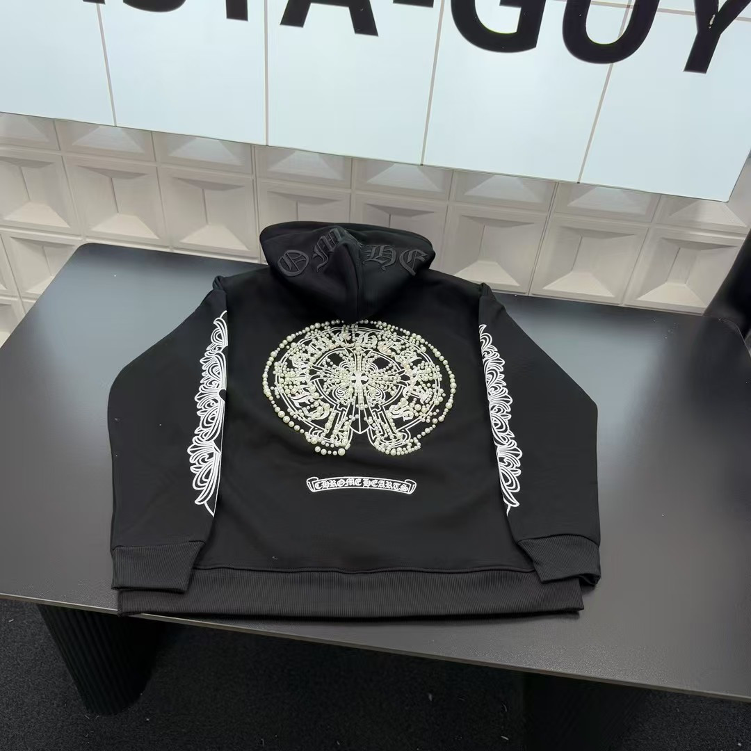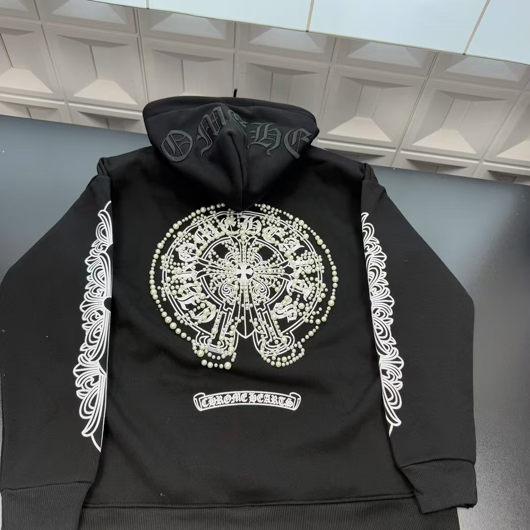 现货主推款热销爆款克罗心加绒连帽卫衣 满印珍珠钉珠Logo 钢印 植绒梵文图案 三标齐全官网一致 放大看细节原相机实物拍摄 颜色 黑色 尺码 L 4xl L 80 105斤 XL 105 120斤 2XL 120 140斤 3XL 140 160斤 4XL 160 180斤