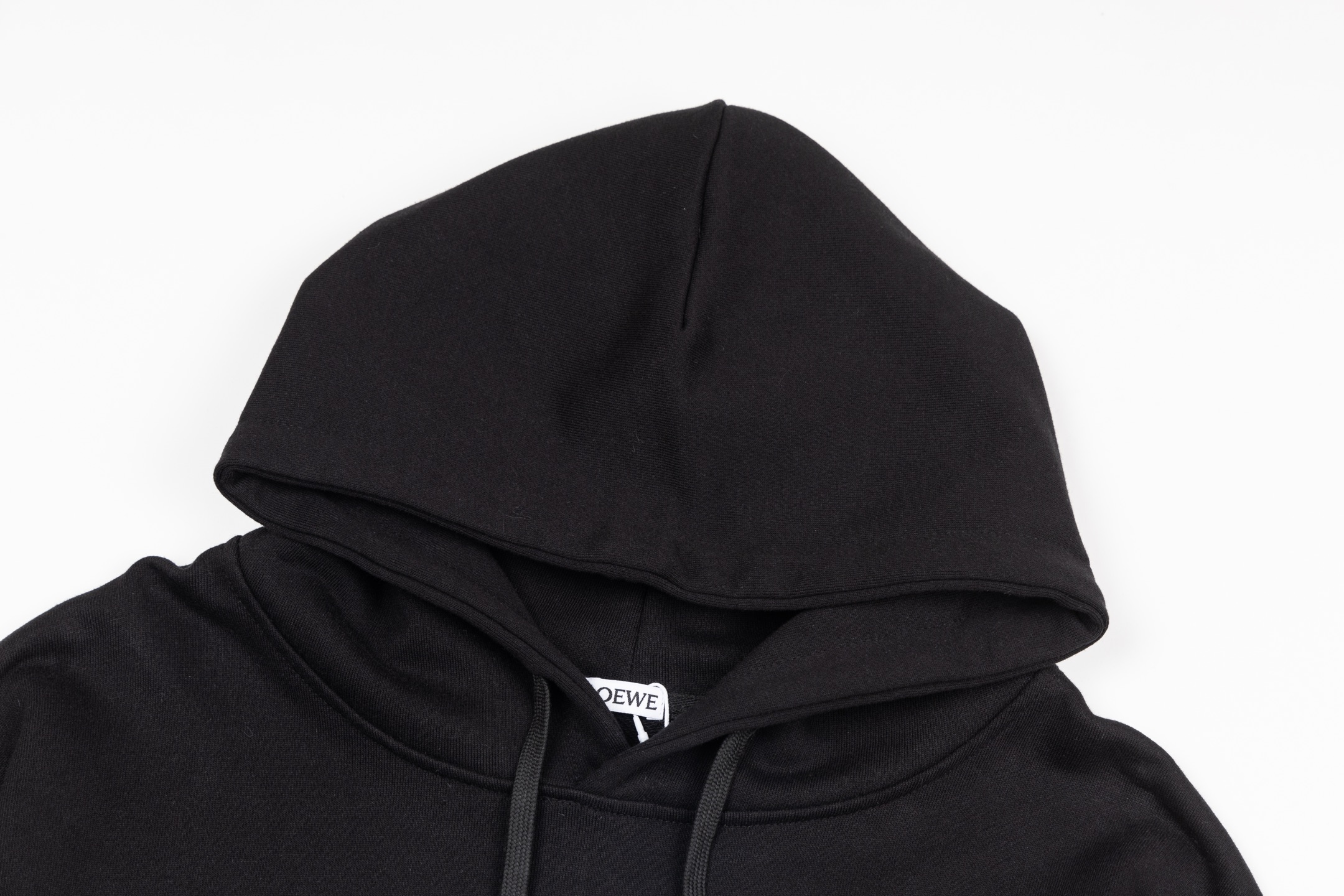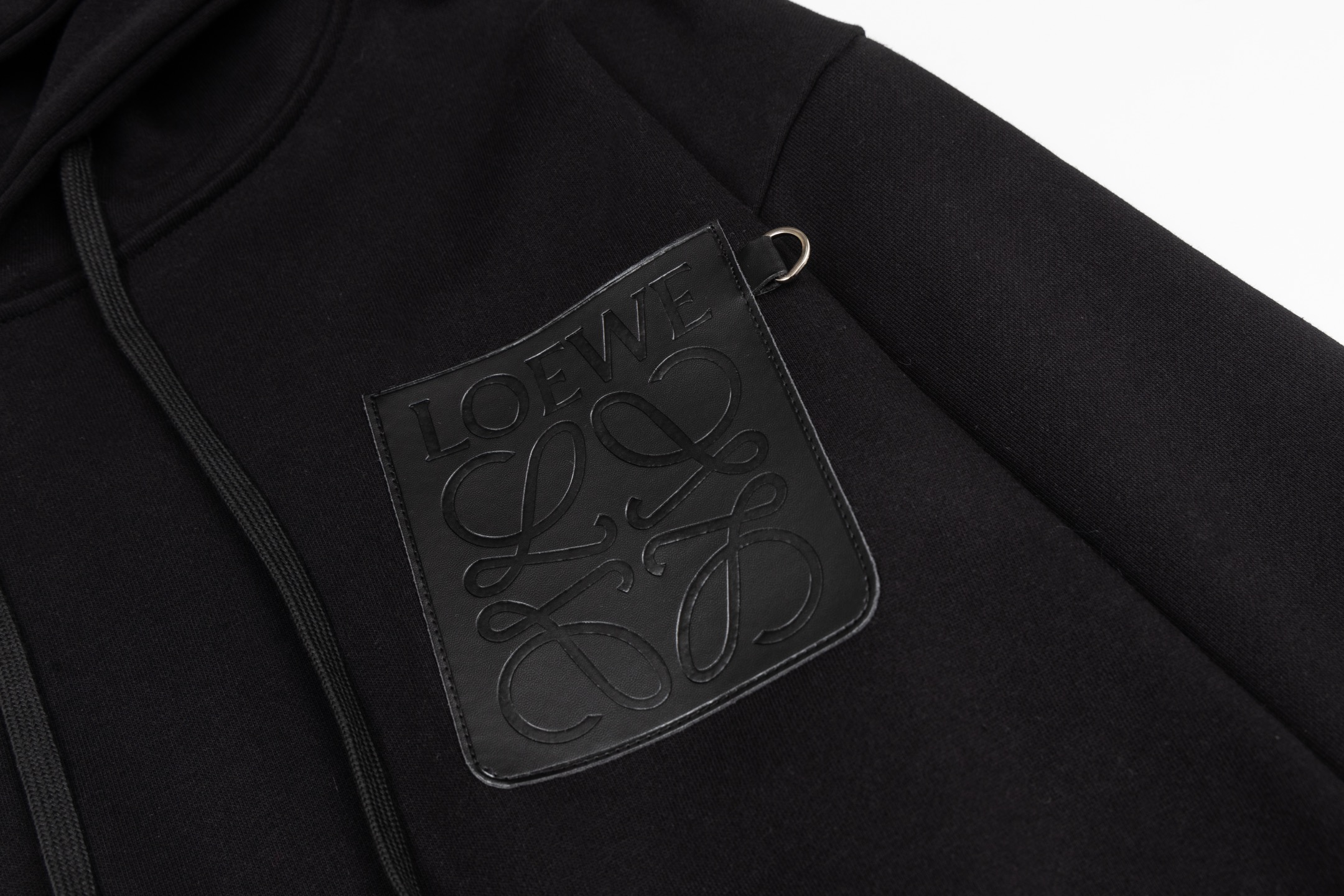 款号 SL374 LOEWE罗意威胸口皮标刺绣连帽卫衣 面料采用400克毛圈高克重95棉5氢纶1 1双纱洗一辈子都不会变形的 男女同款 官网细节一致 全套包装 三标齐全 防潮纸 区别市场通货 随意对比 OS版型 最大可穿220斤无压力 上身舒服有型 颜色 黑 尺码 S XL