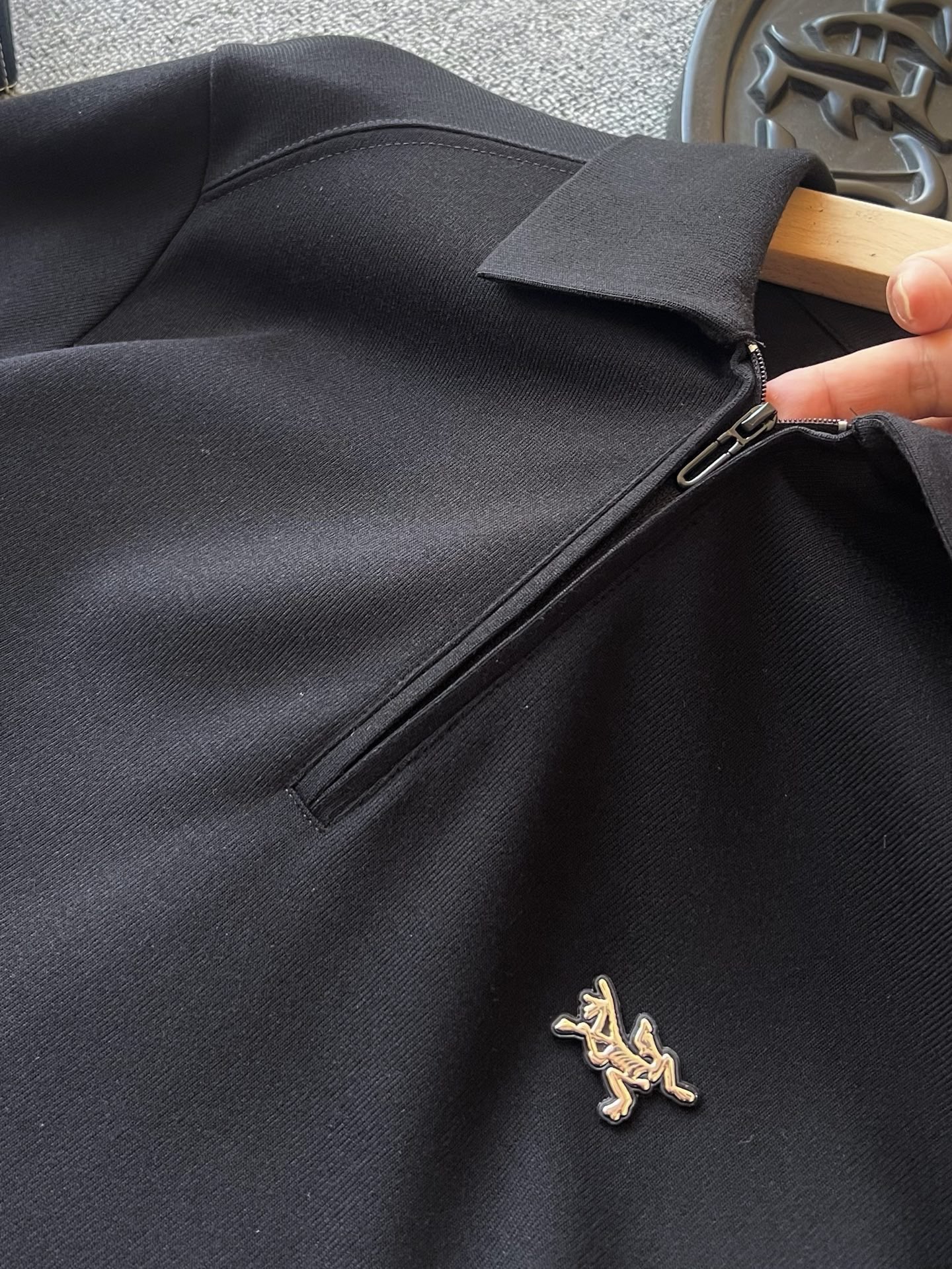 细节细节再细节 ARC TERYX家商场新款卫衣款长袖翻领Polo衫 半拉链设计 非常有味道 YKK代工哑光烤漆金属拉手袢 胸前亚格力钨钢金属始祖鸟小标 轮廓镶嵌硅胶环绕 十分精致 双肩下方做了拼接以及双针压线 高端设计
