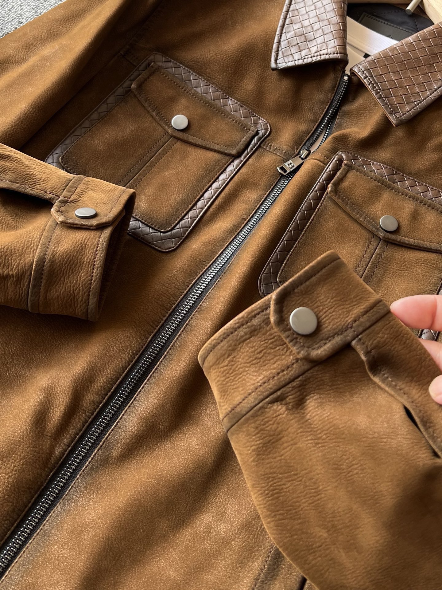 细节细节再细节 Zegna家商场新品三色羊皮加厚外套翻领皮衣 胸前双工装口袋设计 做了双层拼接工艺 领口钢印压花肌理 和口袋轮廓形成很好的立体感 内里做了热熔加固棉层设计 具有很好的锁温以及单向透气排湿性