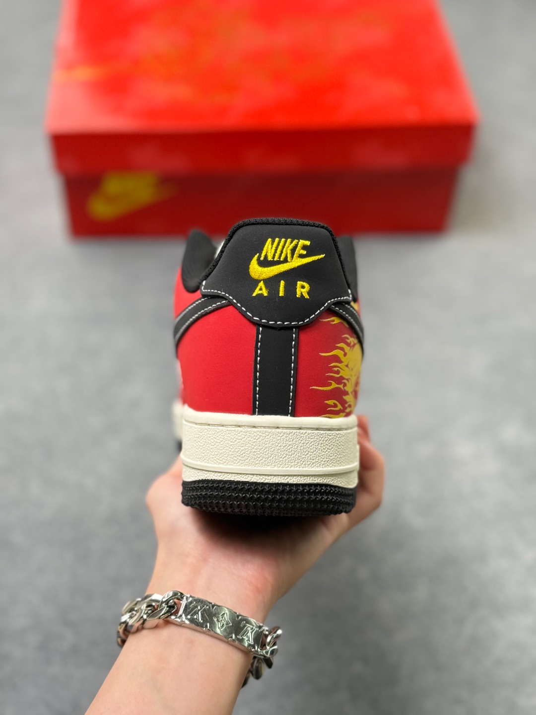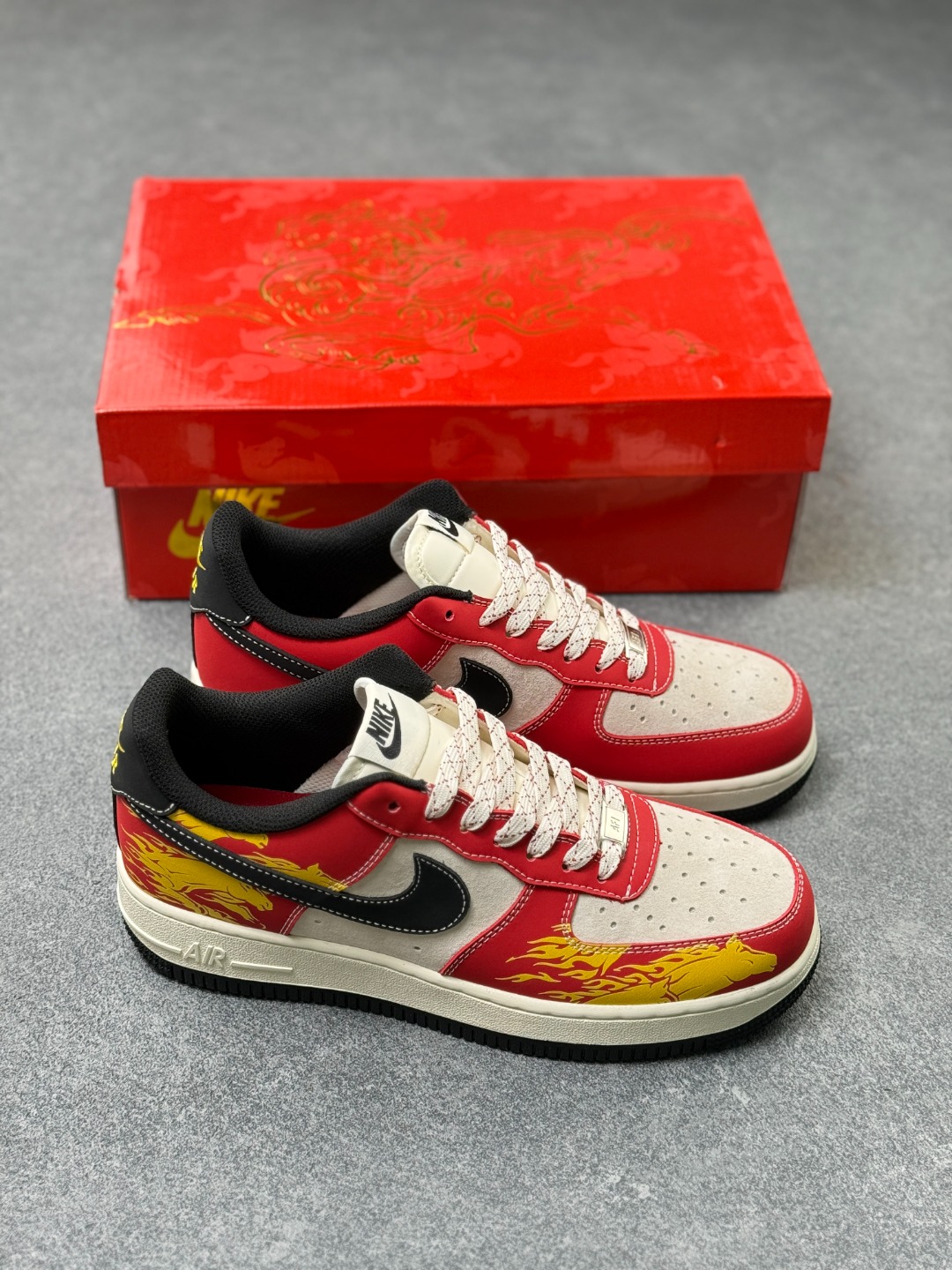 鞋身印有 火焰马 图案 直接呼应生肖主题 采用红 黄 黑为主色调 契合中国新年的喜庆调性 视觉张力强且富有节日仪式感 强化了生肖主题的文化辨识度 鞋面以皮革 麂皮拼接为主 兼顾穿着质感与日常耐用性 火焰马 图案通过印花工艺呈现 黑色 Swoosh 标识与主色调形成视觉对比 提升了鞋款的主题表现力与视觉层次