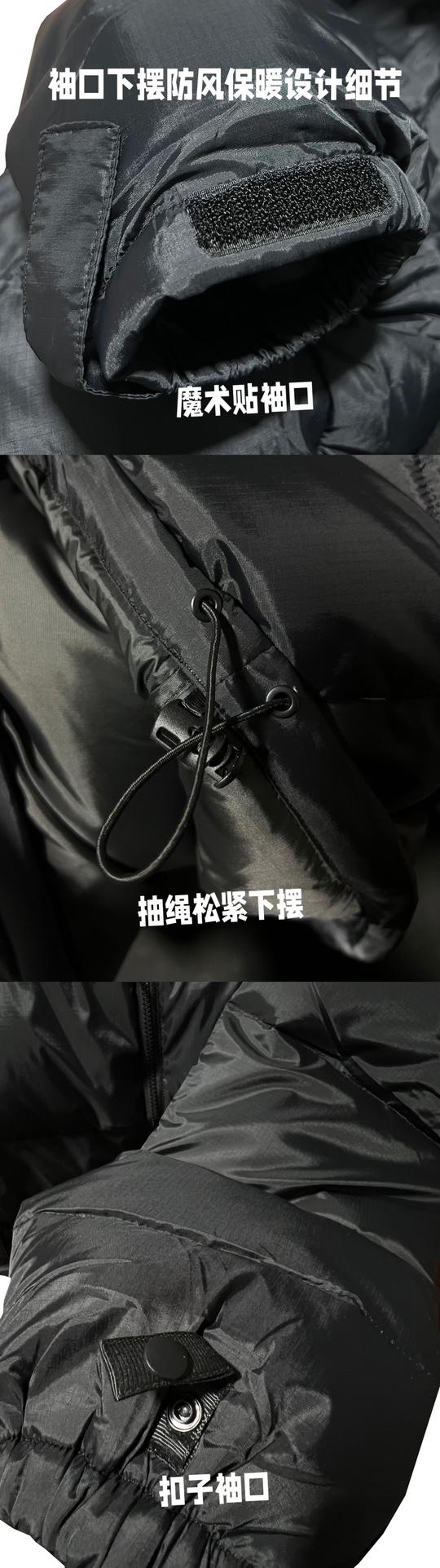 内置隐藏帽子 可防风防水 内置大口袋 方便携带随身物品 出行无忧 袖口下摆防风保暖设计 满满的细节