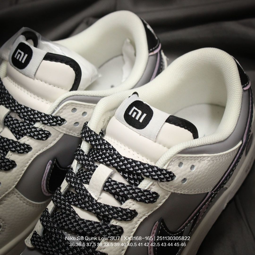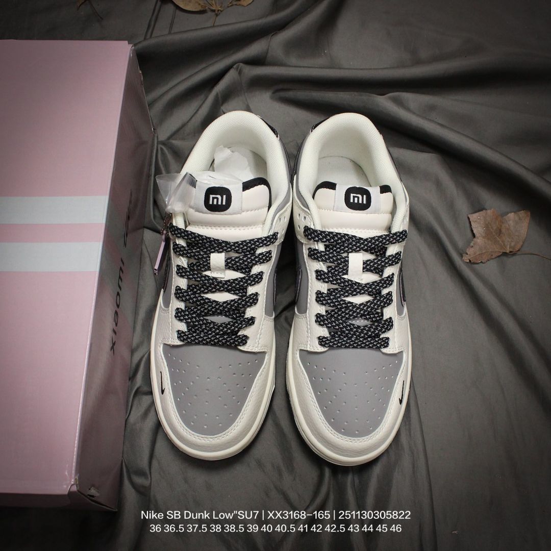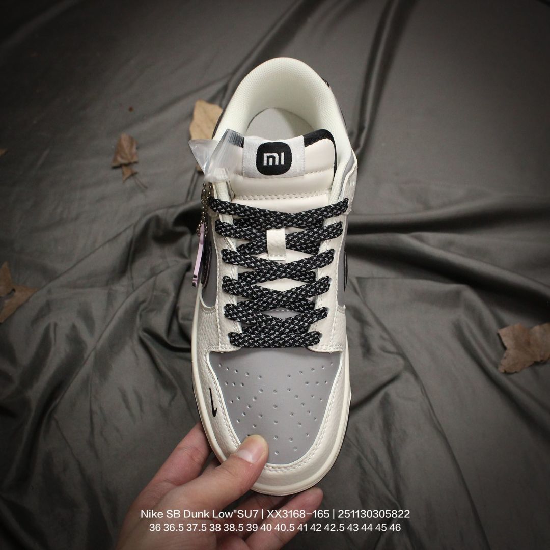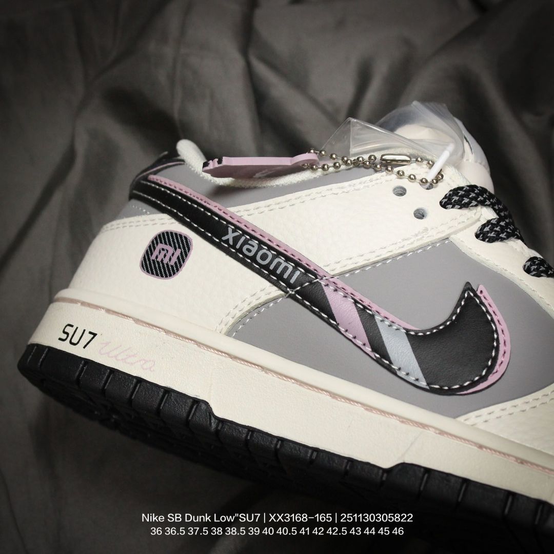 Nike 耐克 男女鞋半码制 更新数据窄楦翘头版型 采用荔枝纹牛剖革组合磨砂革鞋面材质 鞋垫嵌EVA缓震物料 窄版翘头耐磨橡胶大底创意定制小米汽车旗下纯电动轿车SU7 Ultra联名配色 耐克Nike SB Dunk Low SU7 Ultra 扣篮系列低帮休闲运动滑板板鞋 米白灰黑红小米汽车涂鸦 XX3168 165
