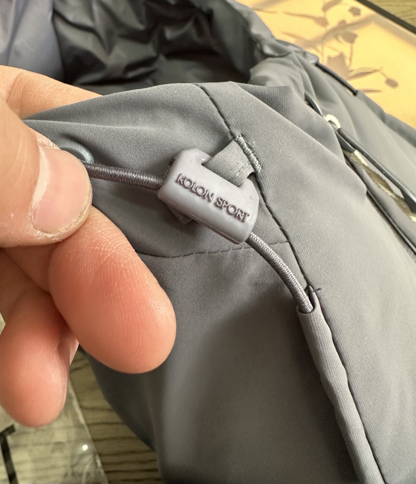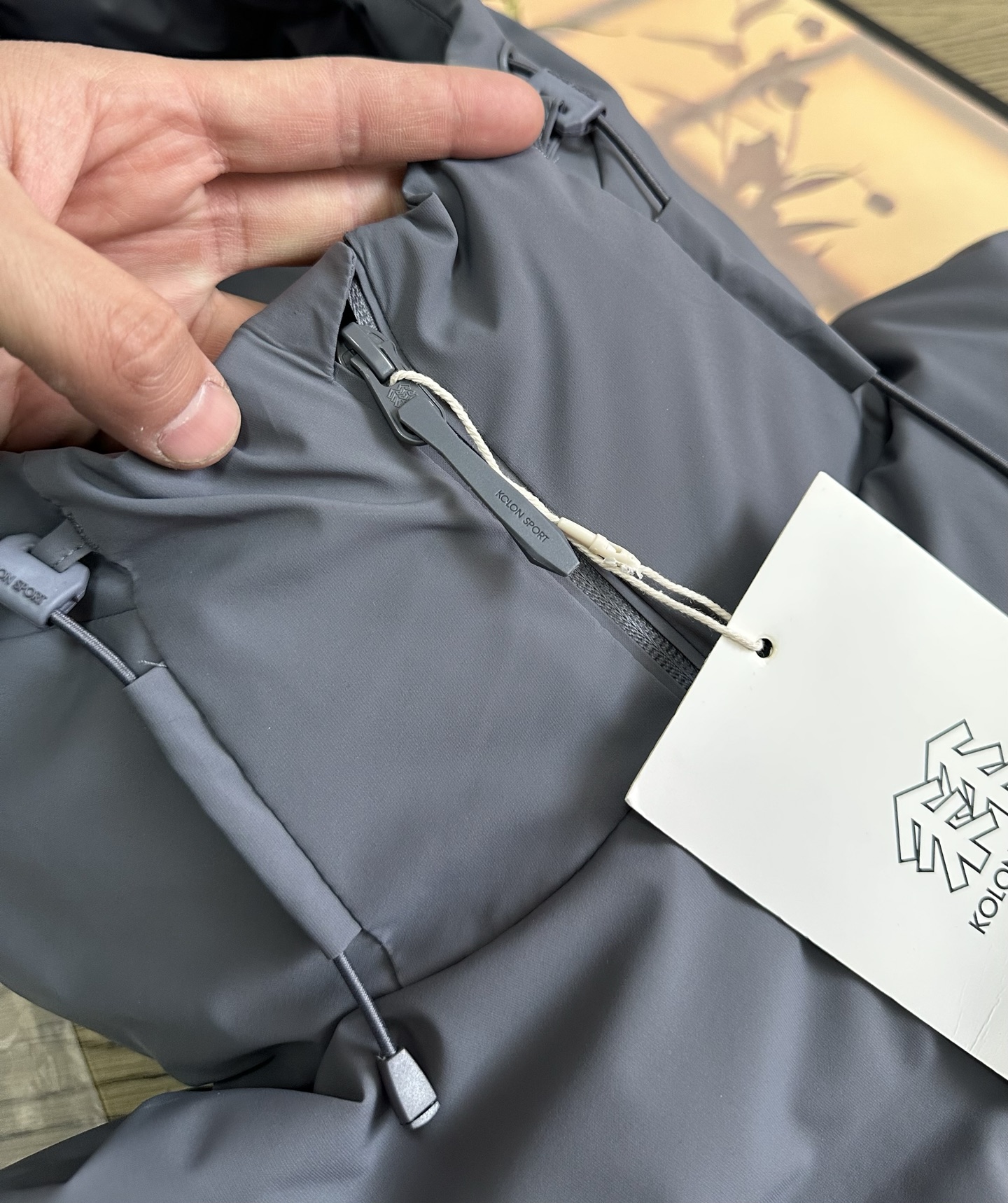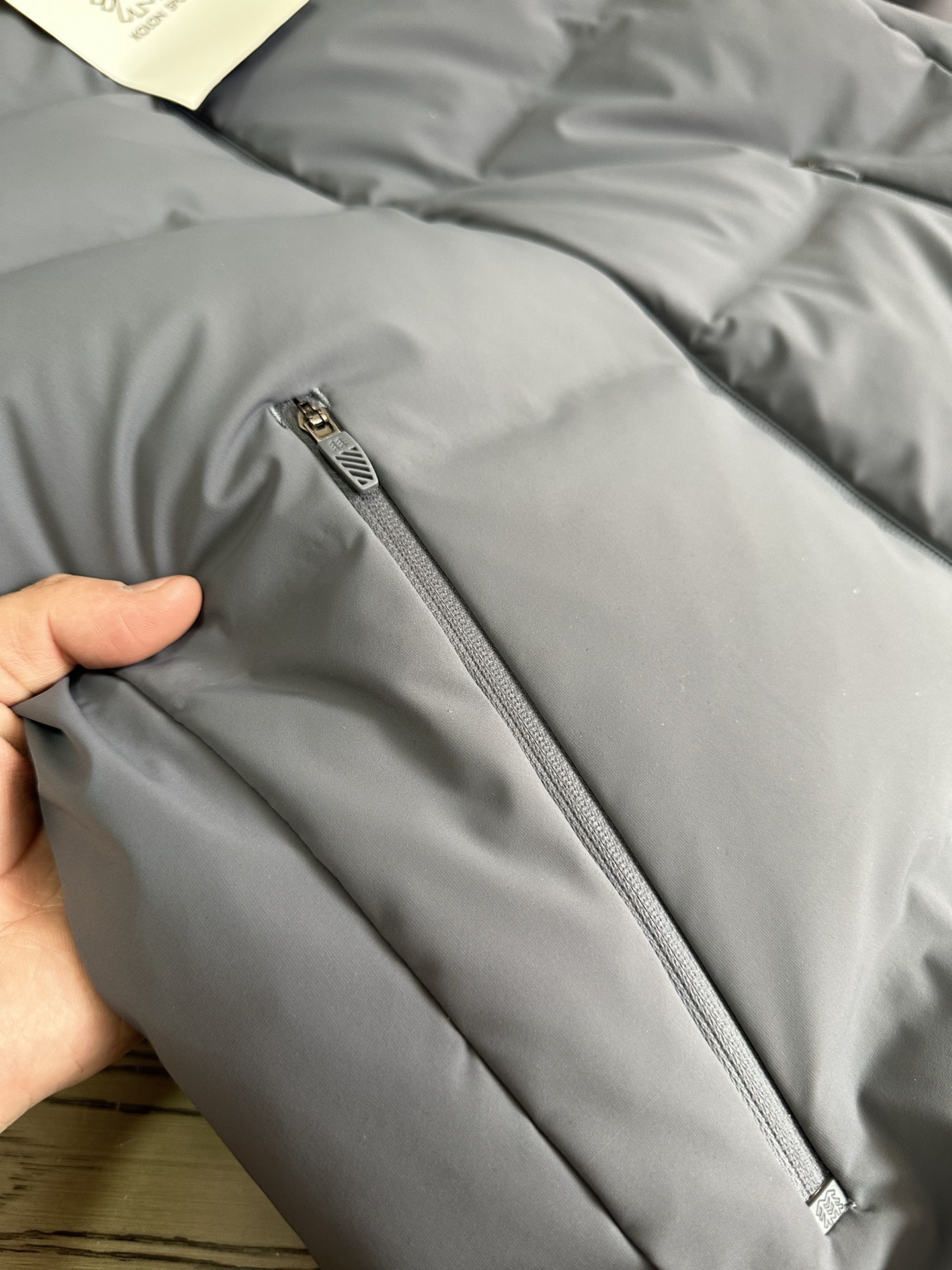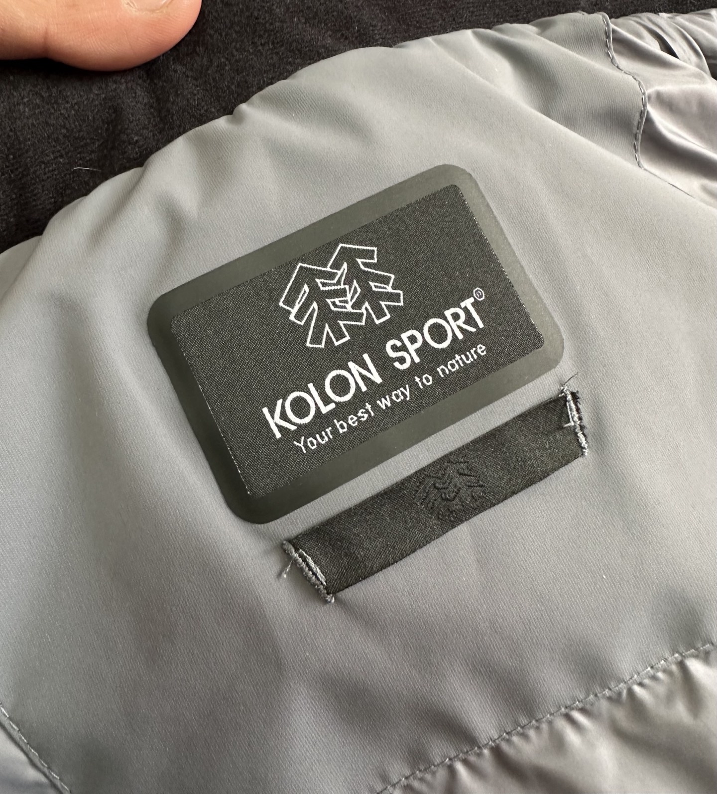 大部分缝线处采用热压处理 美观的同时 减少因缝线产生的钻绒及漏绒现象 帽子外檐采用凸印式KOLON SPORT
