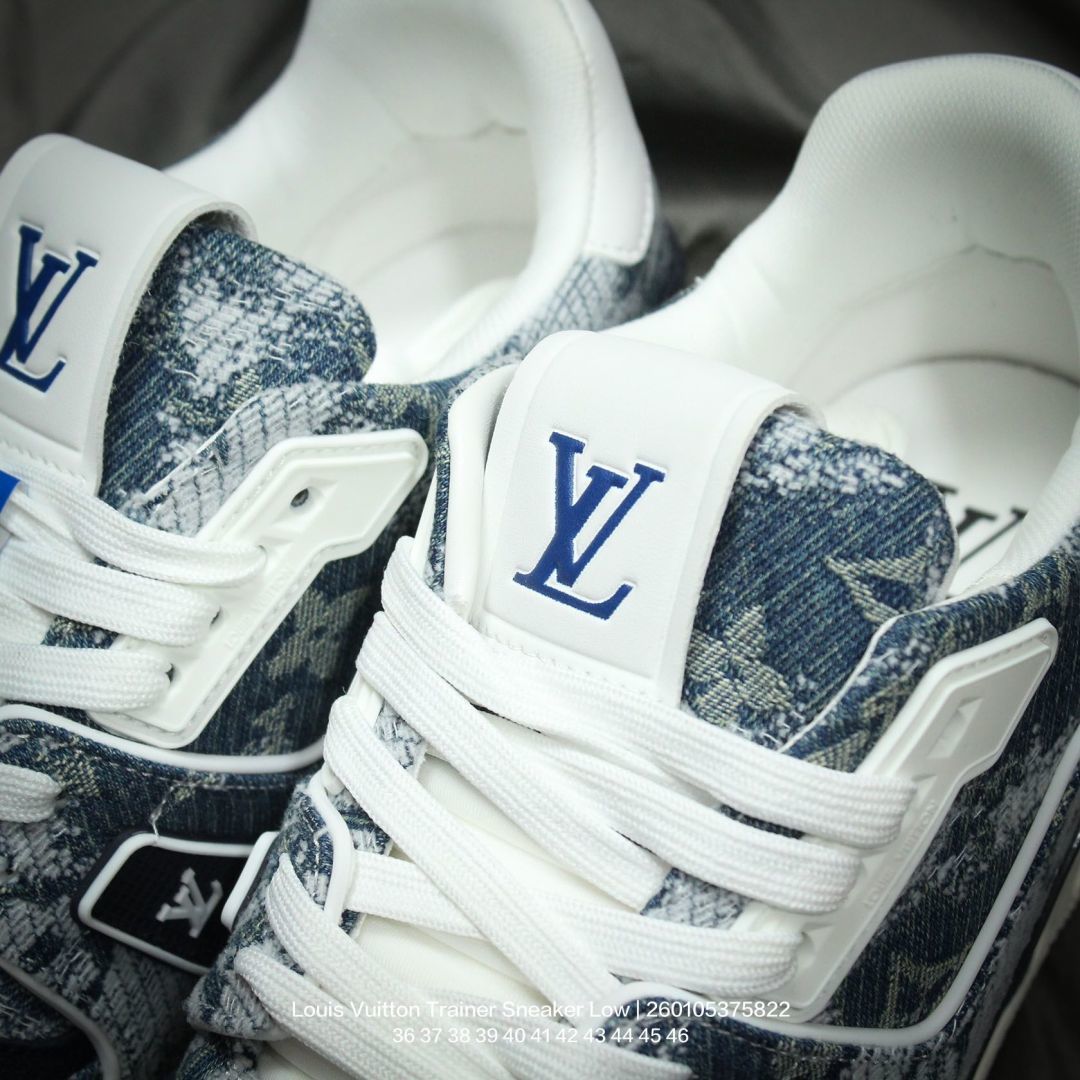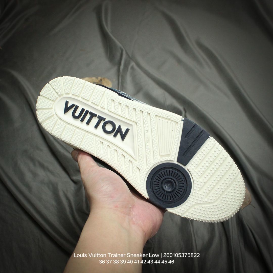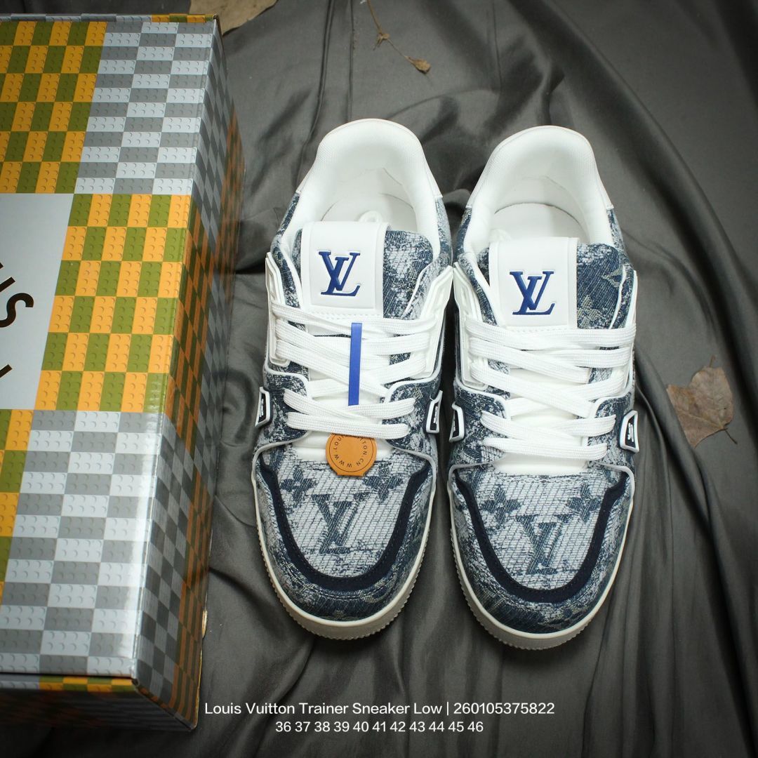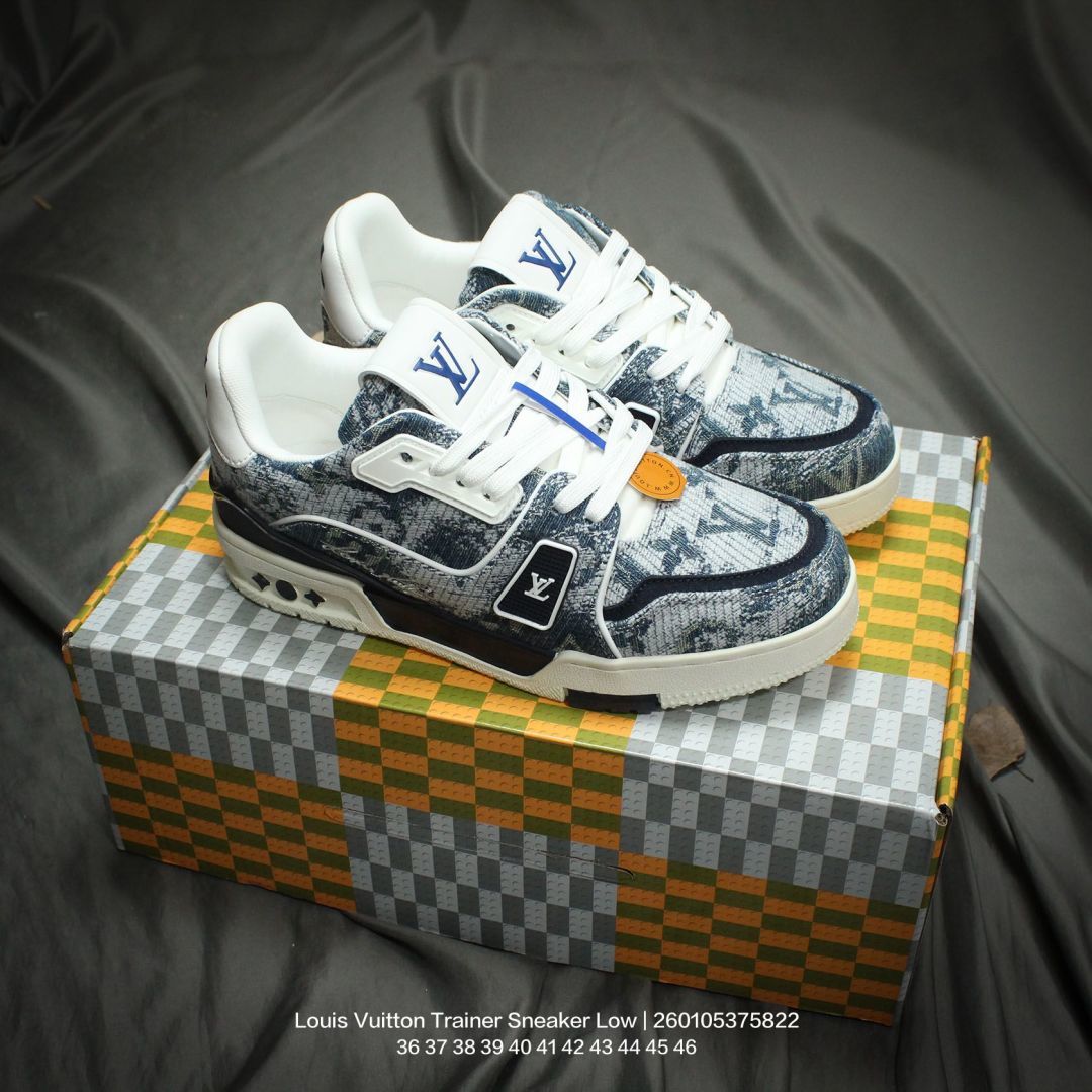 Louis Vuitton 路易威登 男女鞋配置厚实抽屉礼品鞋盒 采用荔枝纹二层牛剖革组合粒面牛剖革鞋面材质 鞋垫嵌入软脚感EVA物料 外置TPR光泽隔色鞋底法国巴黎百年奢侈品牌LV路易威登Louis Vuitton Trainer Sneaker Low 运动系列低帮复古百搭休闲运动文化篮球板鞋