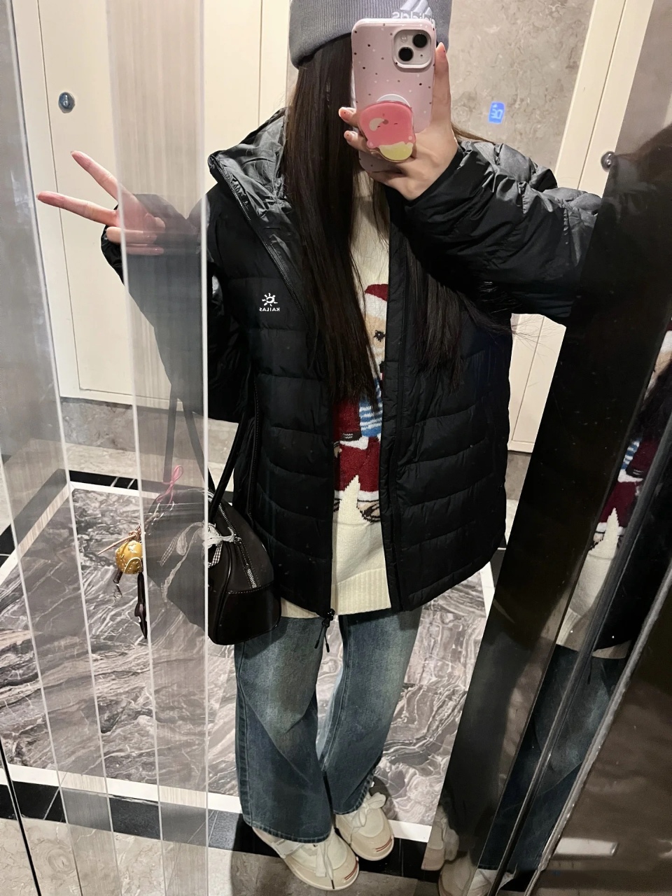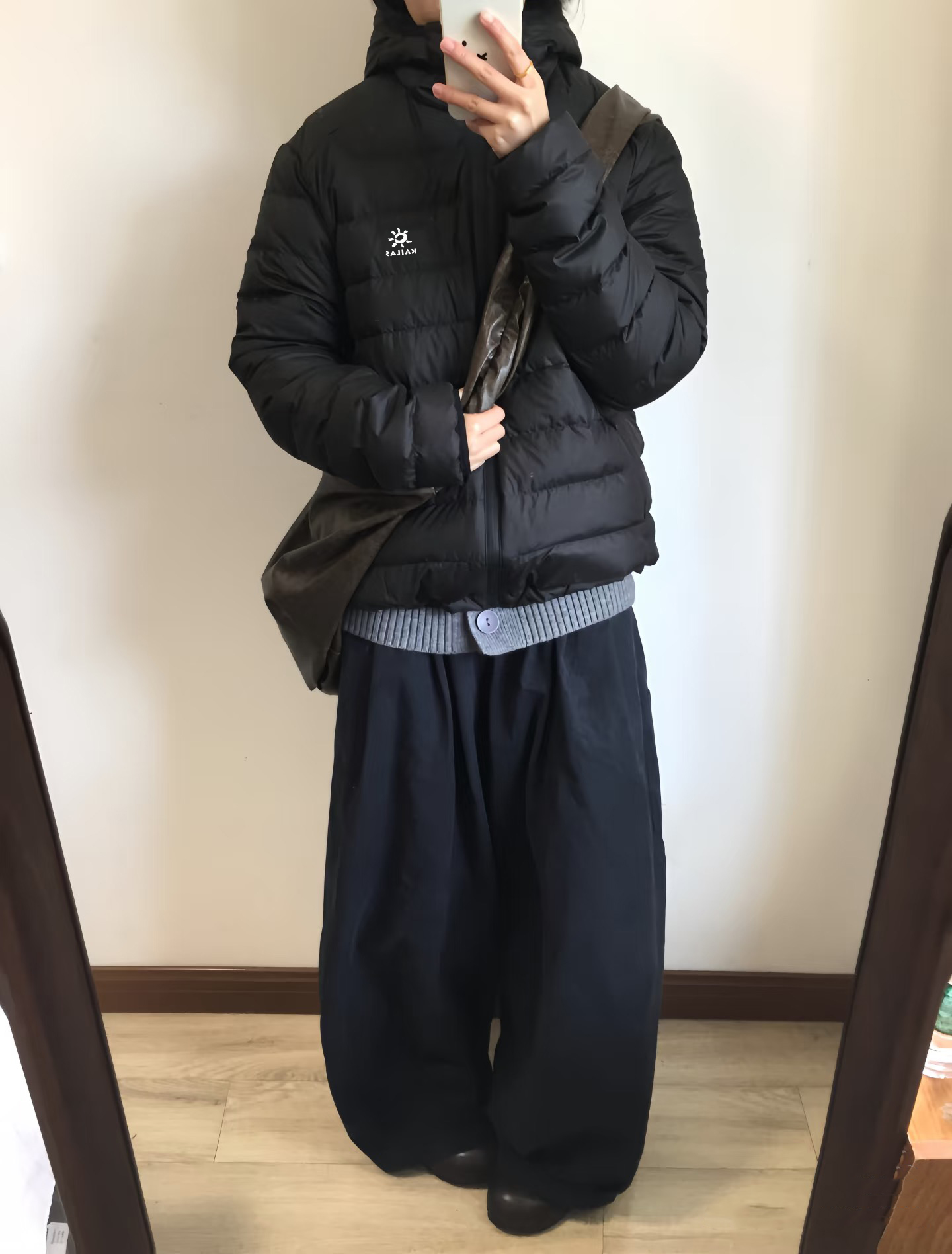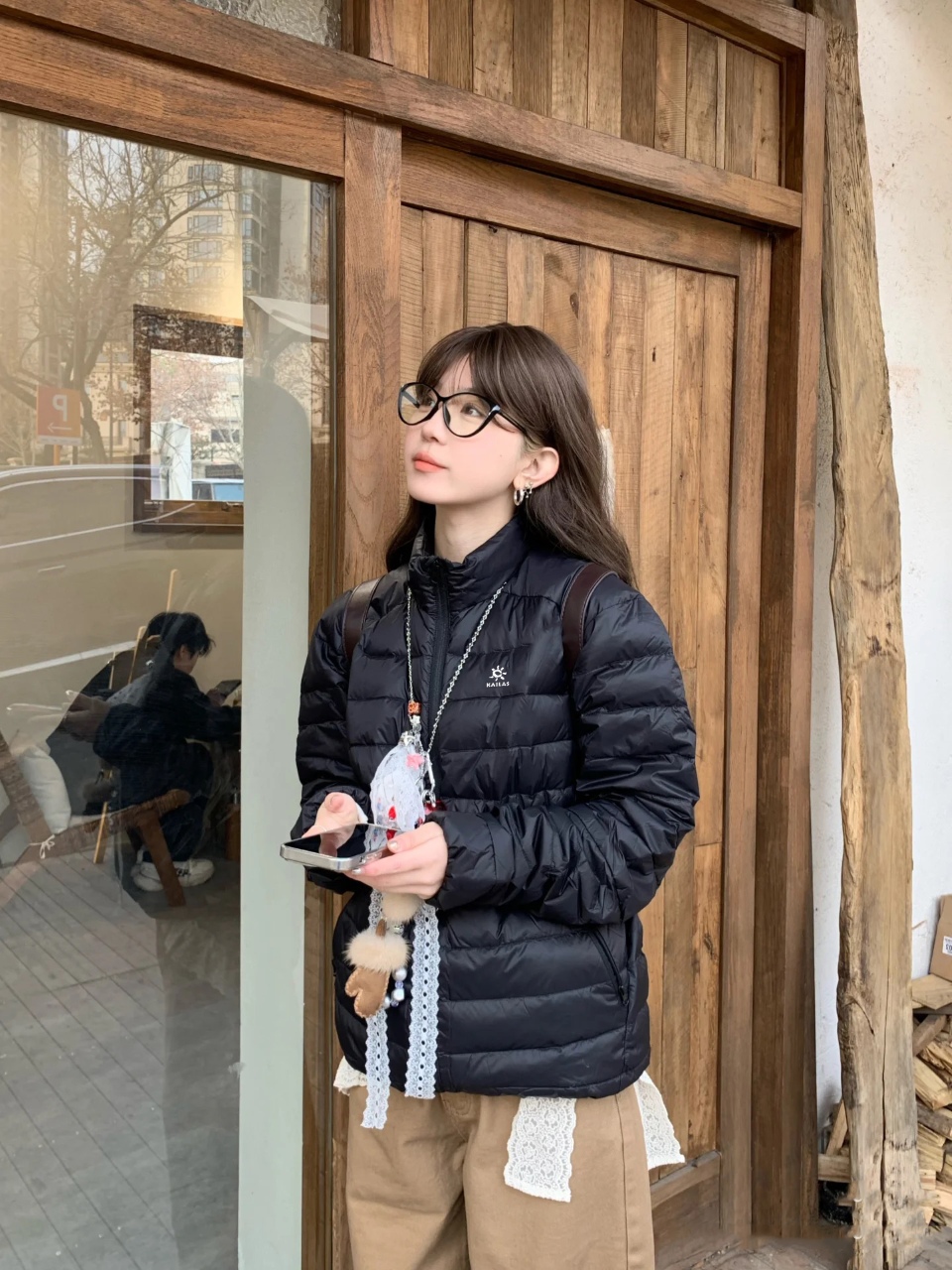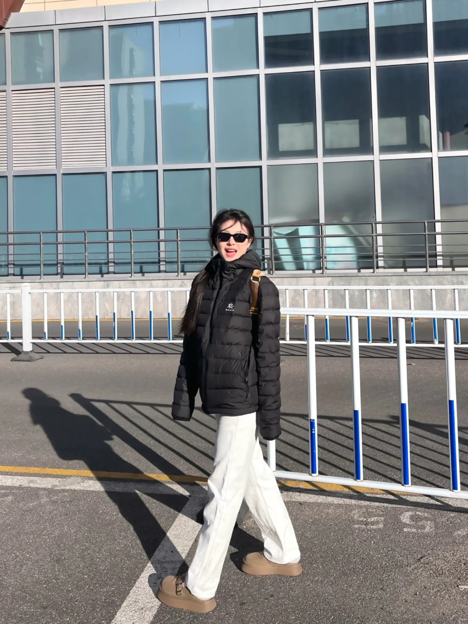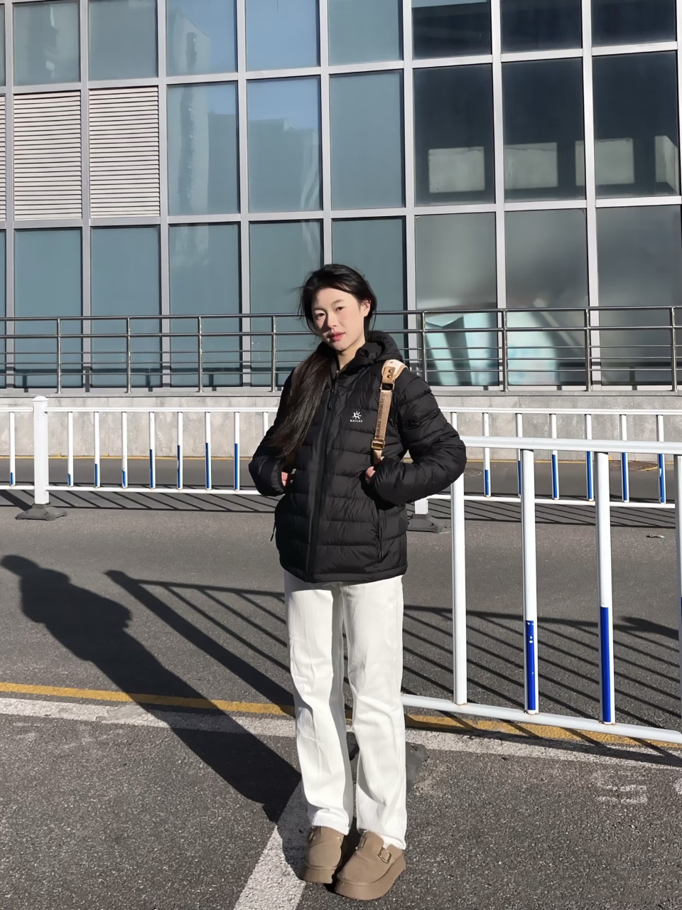 citywalk 风 搭蓝色直筒牛仔裤 小白鞋 内搭灰色连帽卫衣 羽绒服敞开穿 露出卫衣帽子 肩挎帆布包 逛胡同拍照超出片 原相机直出都有 松弛感 完全看不出是专业户外装备