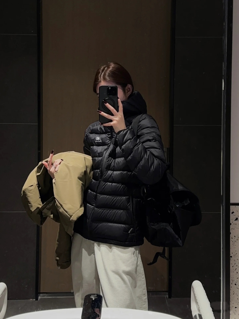 通勤休闲风 配卡其色烟管裤 乐福鞋 内搭白色高领打底 羽绒棉服拉链拉到胸口 戴条银色户外风项链 穿去公司被同事说 你这外套看着就高级 不像户外服