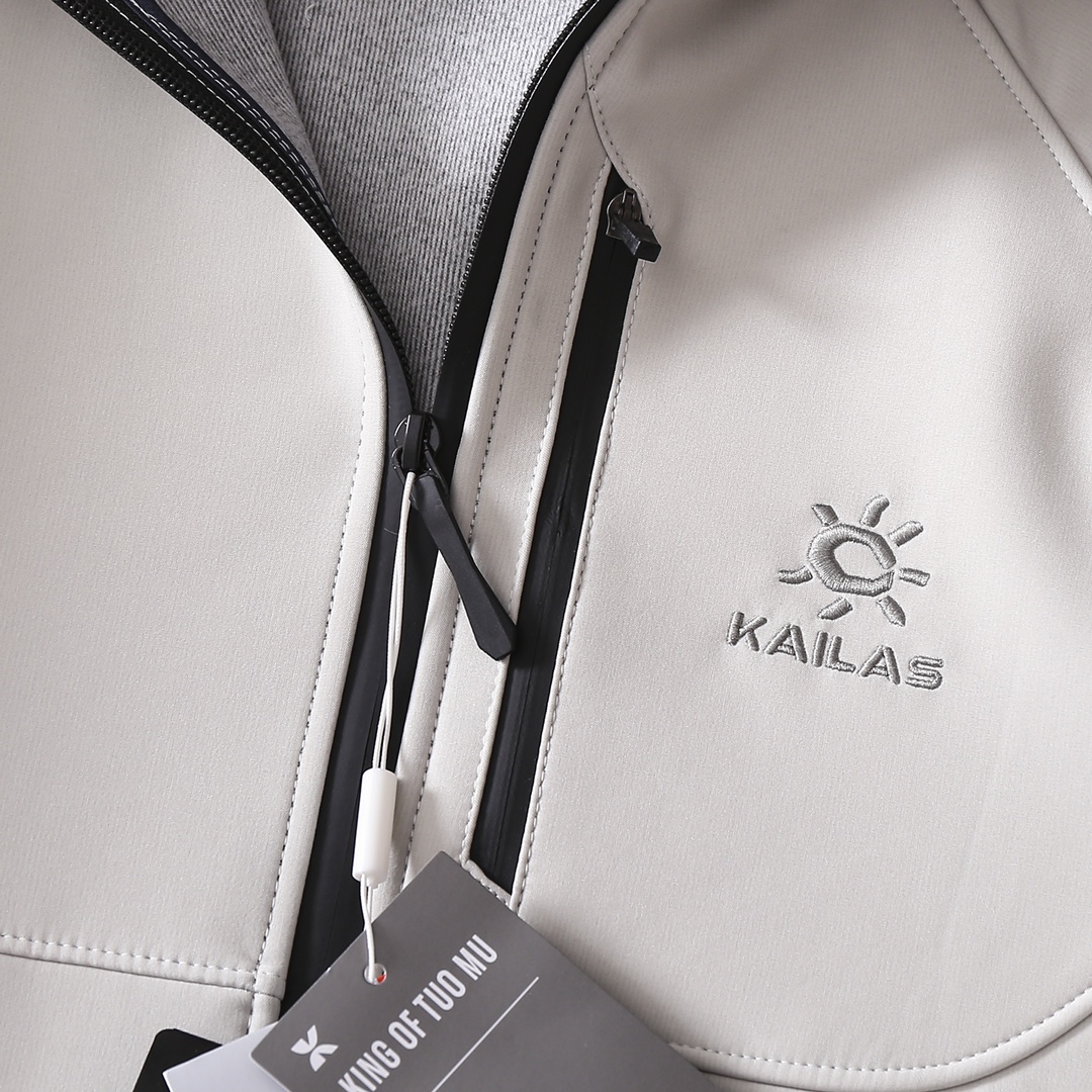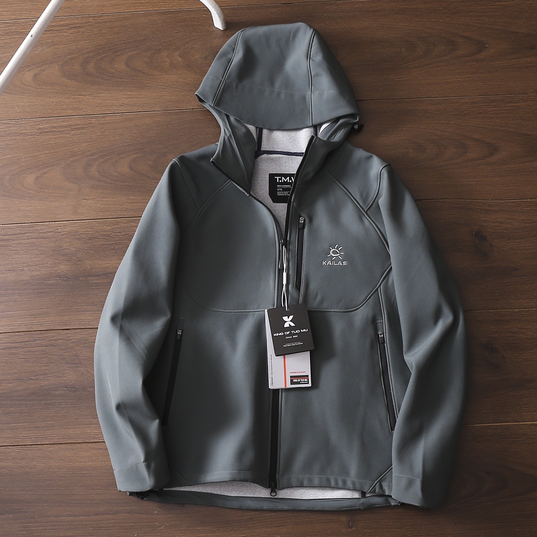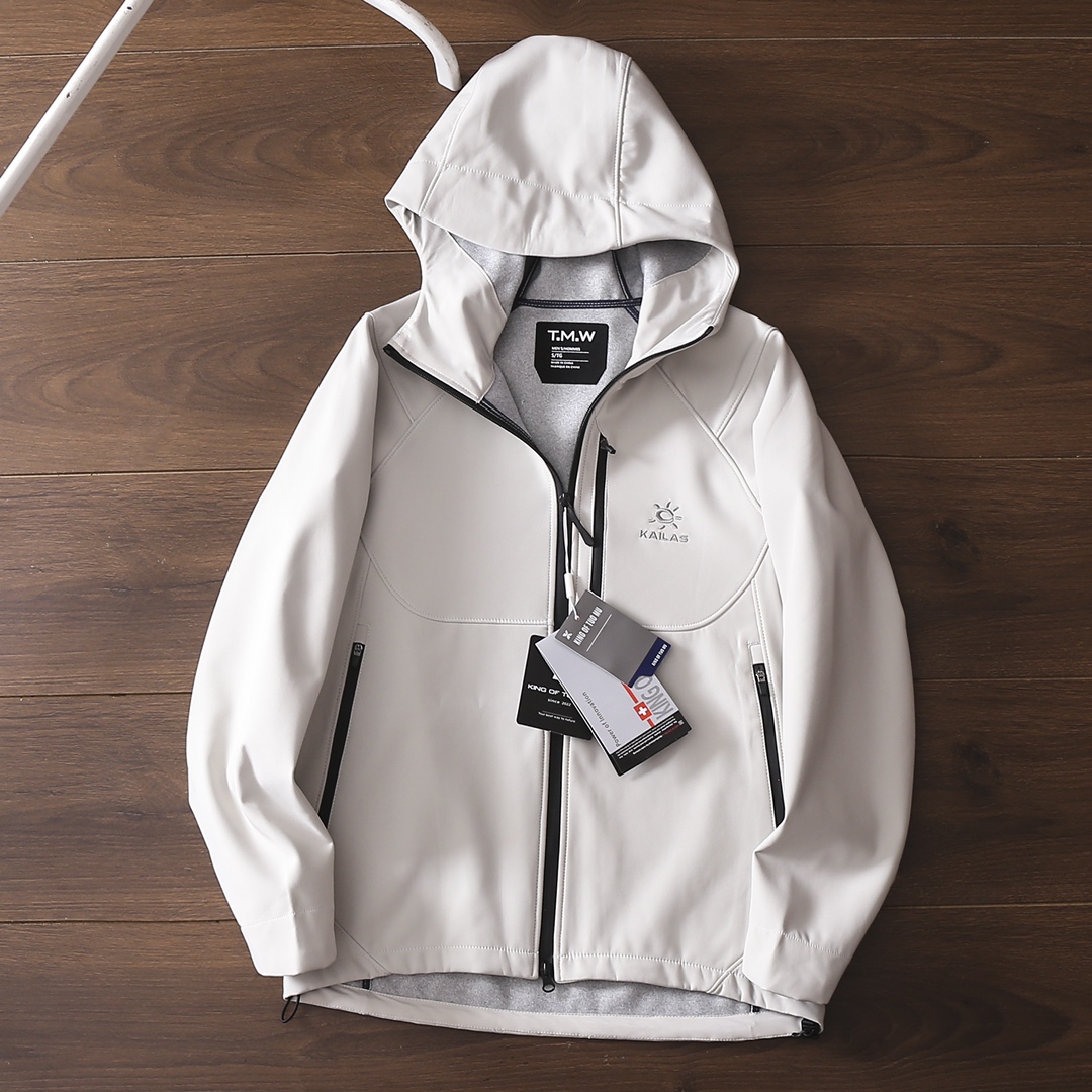 严选好货 凯乐石Kaillas新款男女连帽冲锋衣夹克外套 户外休闲都可驾驭 客供软壳科技防风防水面料 耐磨耐穿 舒适保暖 3D立体裁剪版型 胸前拉链口袋设计 重工小标logo刺绣 精致饱满 拼接弹力袖口 双开拉链门襟 内里包边包条 做工细节都无可挑剔 上身效果一级棒 可配情侣 喜欢的不要错过 颜色 米白色 黑色 深蓝色 灰绿色 红色 尺码 S一4XL