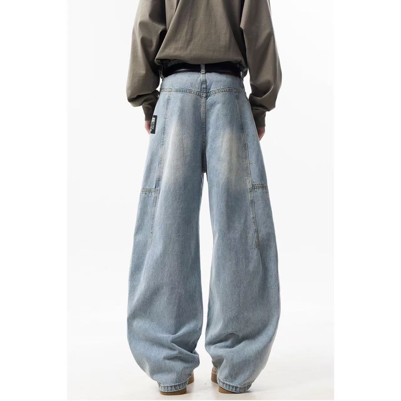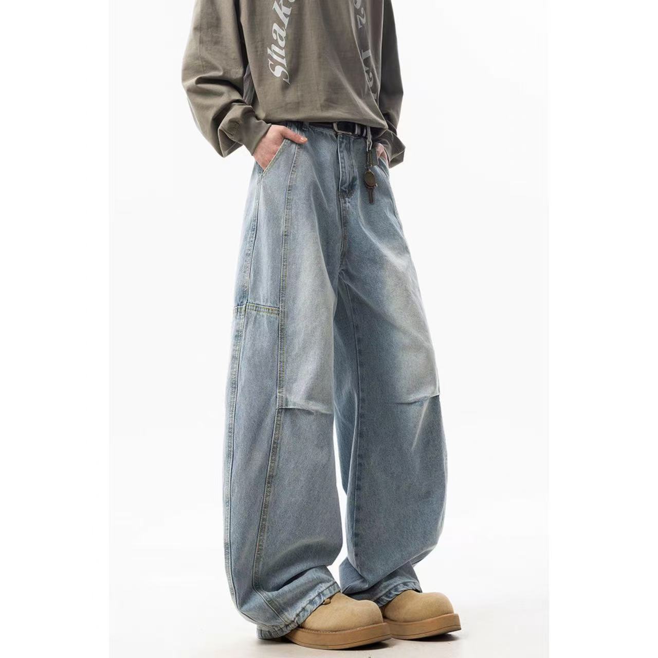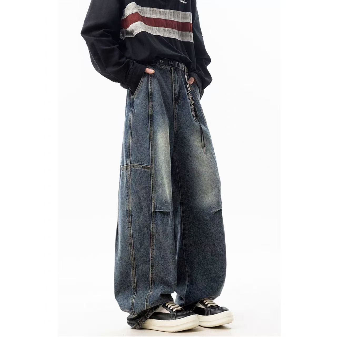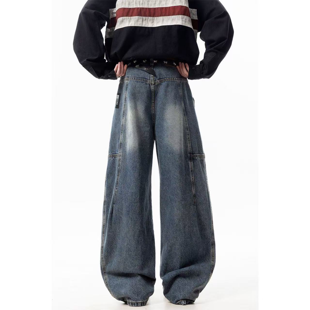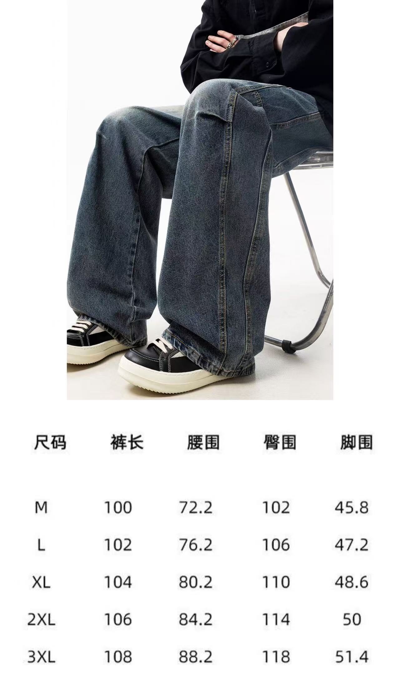 甄选原单复刻牛仔布面料 搭配复古水洗工艺 每一件都是反复多次水洗才能达到最佳的色彩 裤型采用多处不规则个性褶皱拼接工艺 简约又不简单