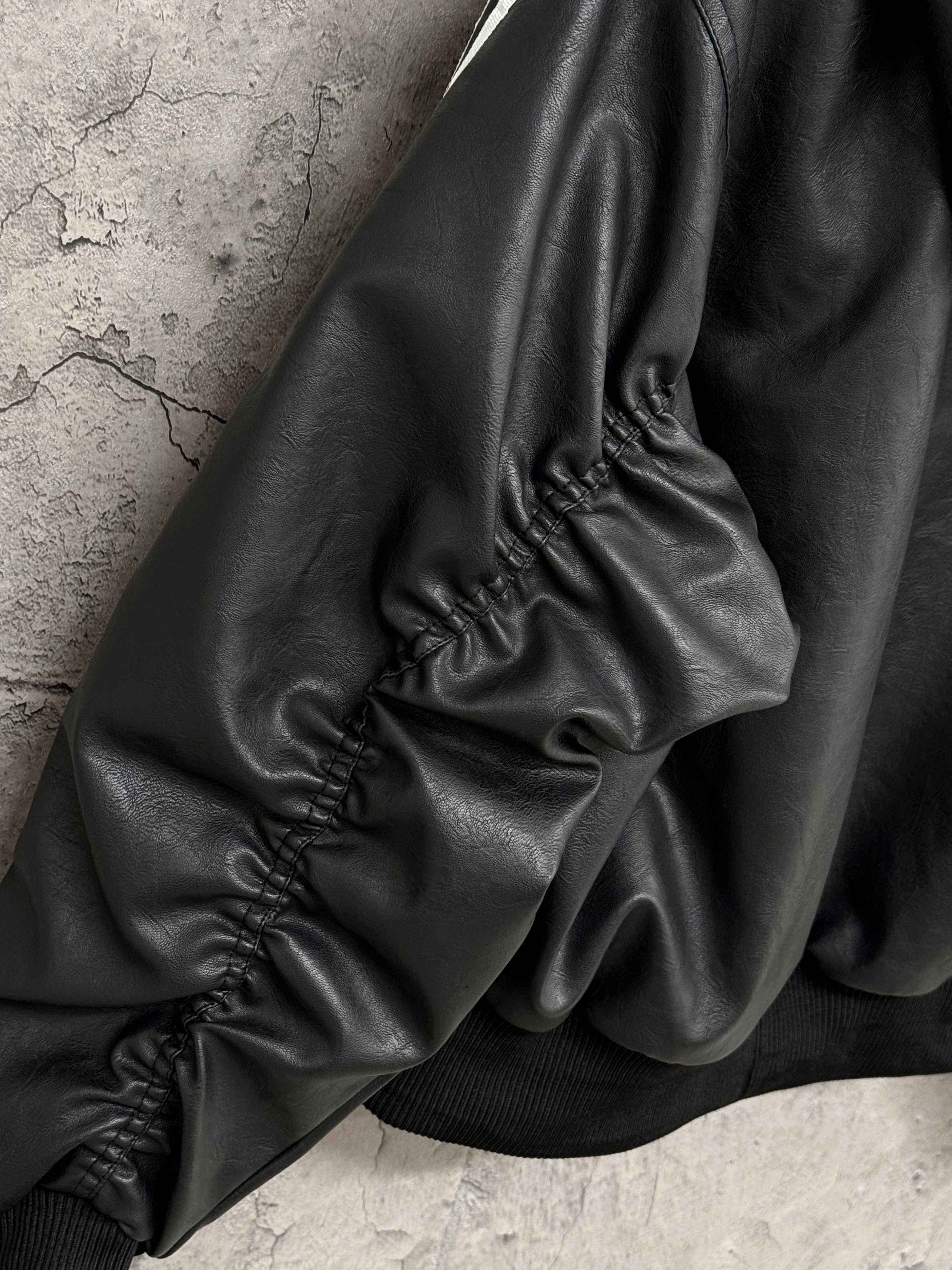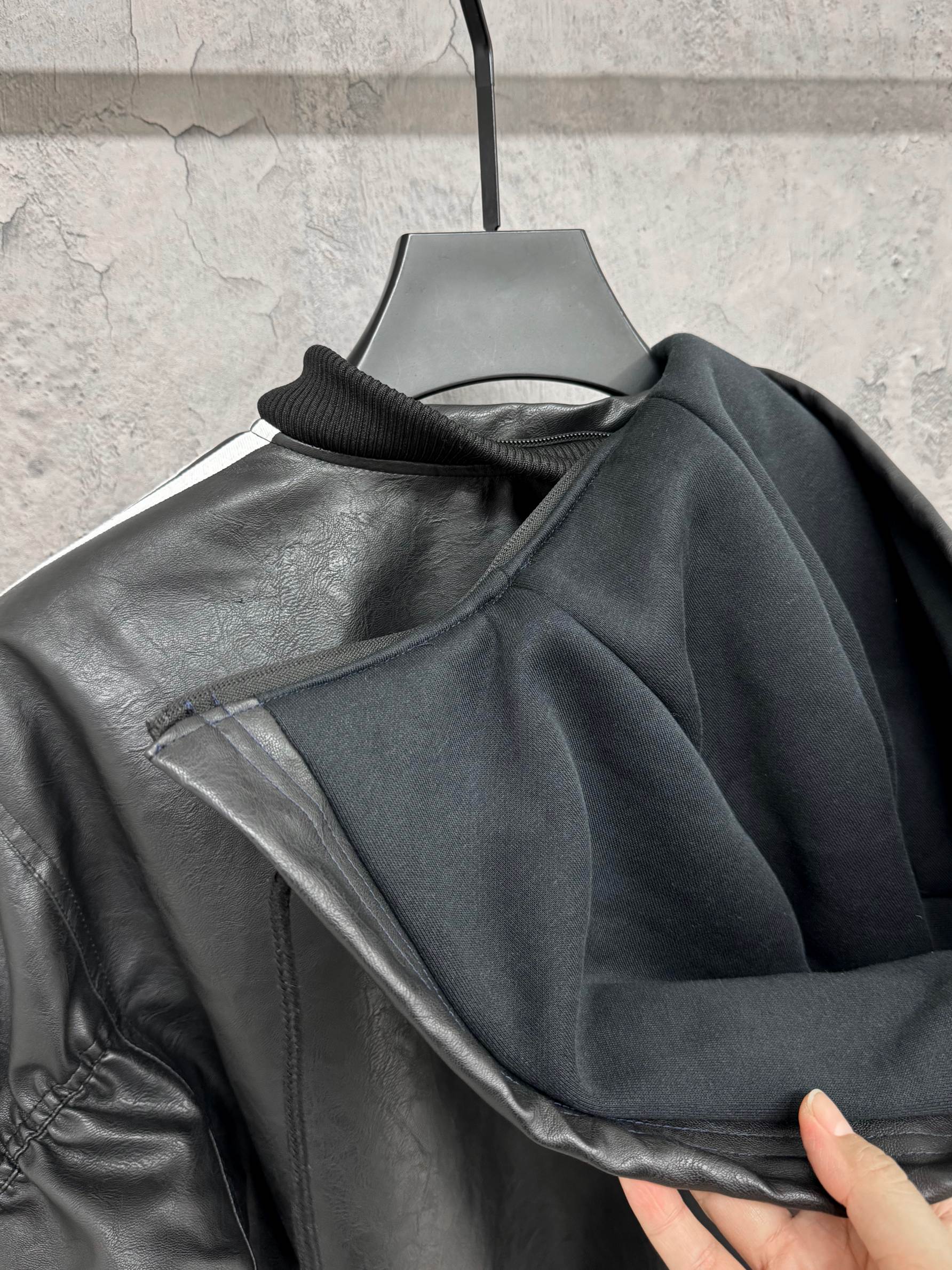 上衣 可拆卸连帽皮衣 小高腰设计 谁还会说皮衣显臃肿 挂面处理确保拉链顺滑门襟不会褶皱 底部弹力螺纹设计 适合更多身型 里部拉链安全袋 袖子做了褶皱处理工艺更加复杂 面料柔软 复古做旧纹路 质感直接拉满帽子可拆卸 真的非常实用