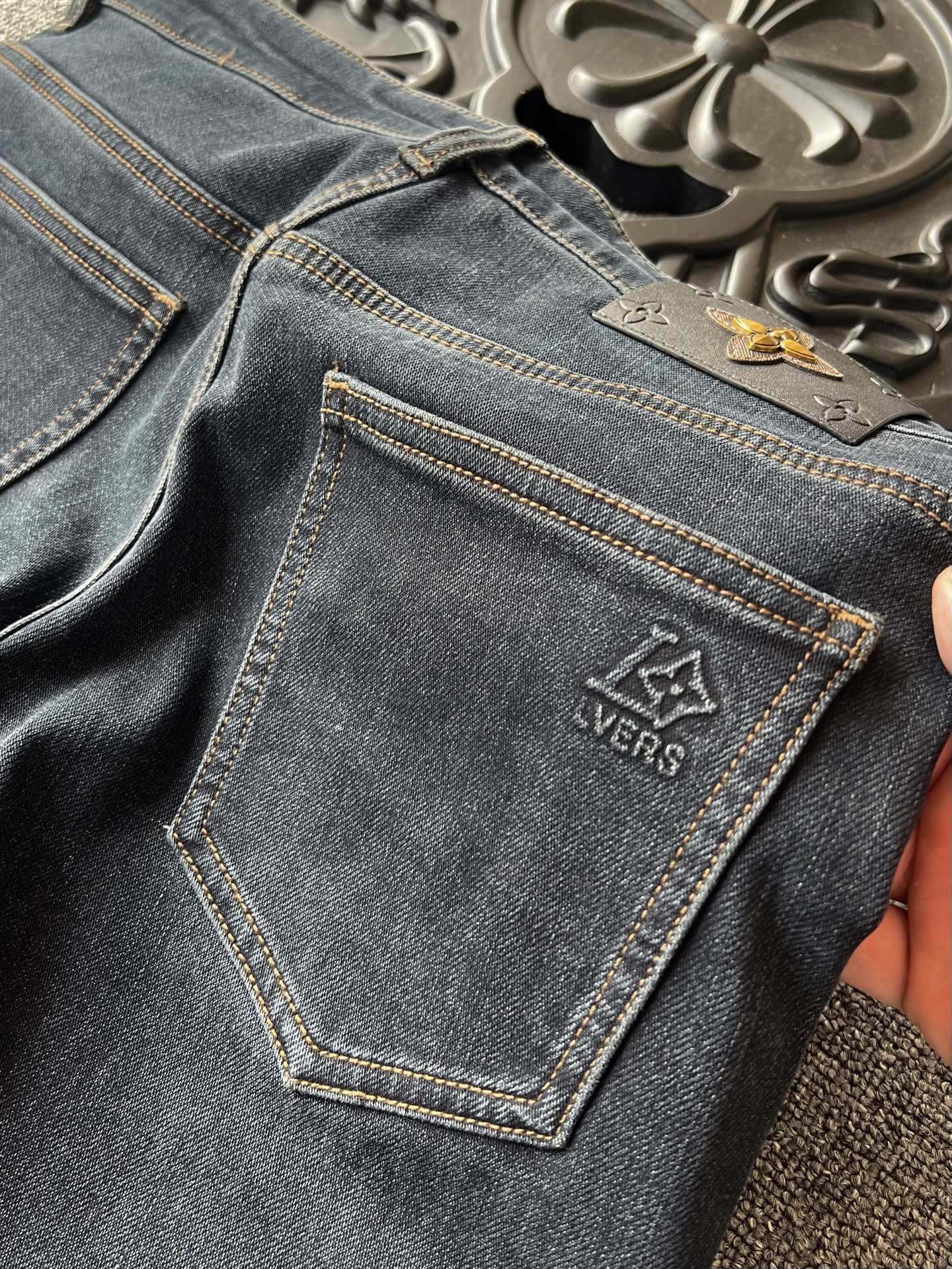 细节细节再细节 LV家商场新款重工水洗牛仔裤 蓝灰色调颜色特别显得高级 经久耐看 裤前多层次立体打磨工艺 腰口三层组合LV四叶草金属皮标同时又做了钢印压花工艺 十分精致 口袋做了四叶草凹凸高频工艺 内里精湛做工 业界天花板
