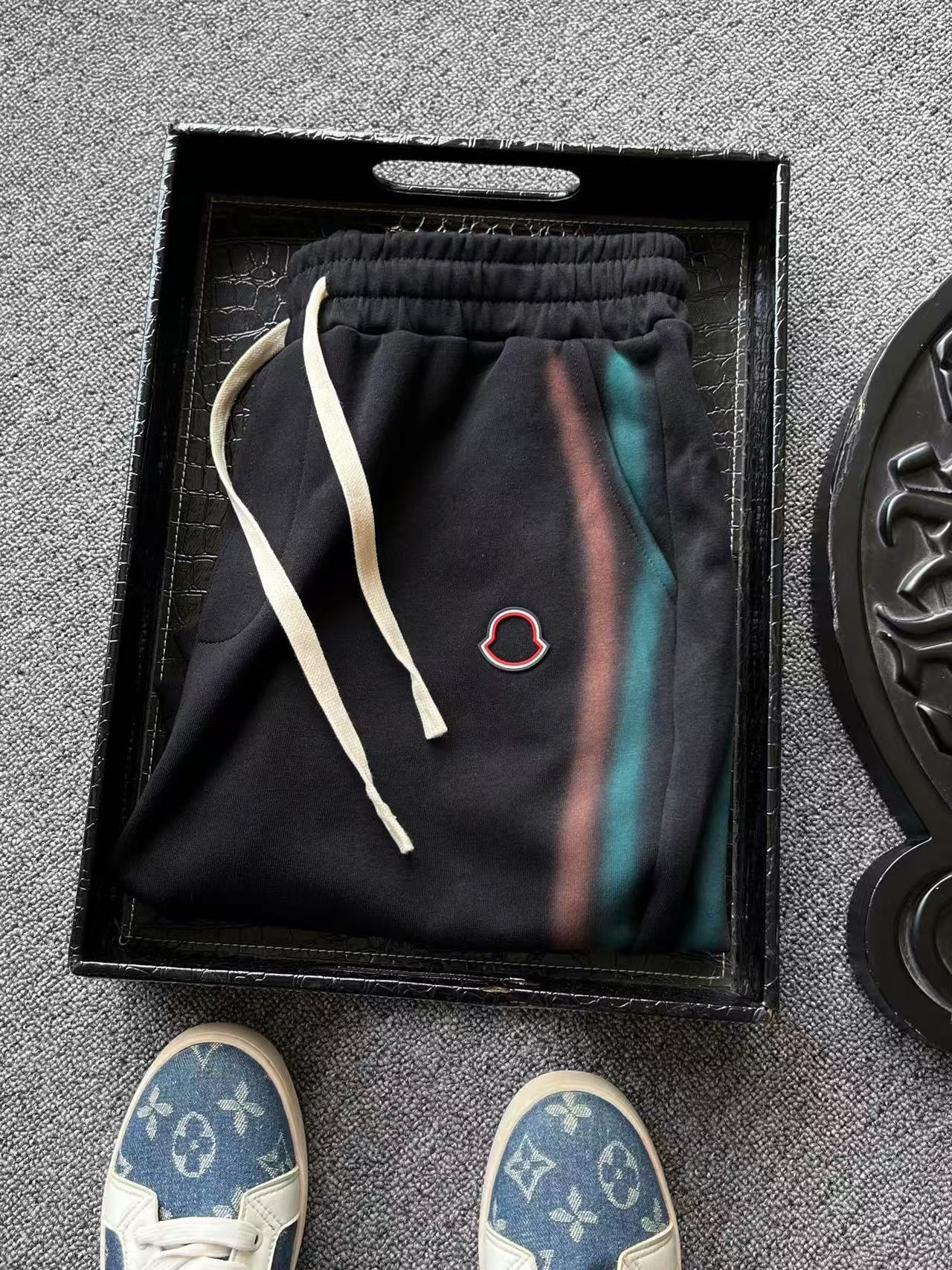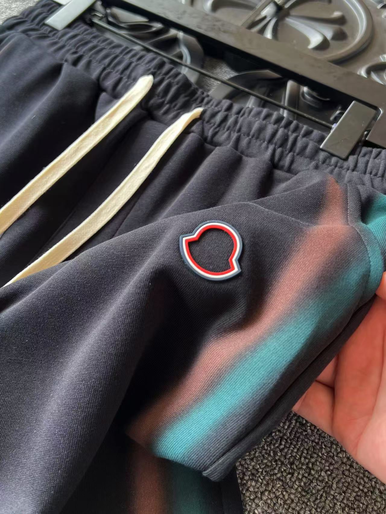 细节细节再细节 Moncler家专柜新品长绒棉短裤 艺术品级顶尖设计图纸 双色涂鸦线条扎染工艺配合黑色大身组合特别好看 裤前采用3D立体进口软质硅胶为原料 经过3次固色兰白红分开激光切割调色 十分精细 内里全包边精湛做工 简约精致神裤