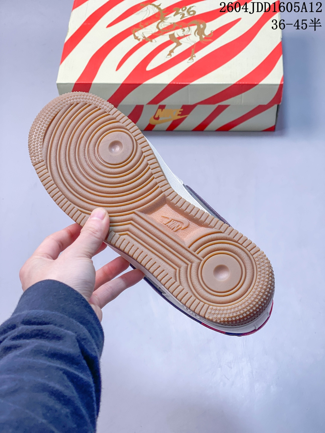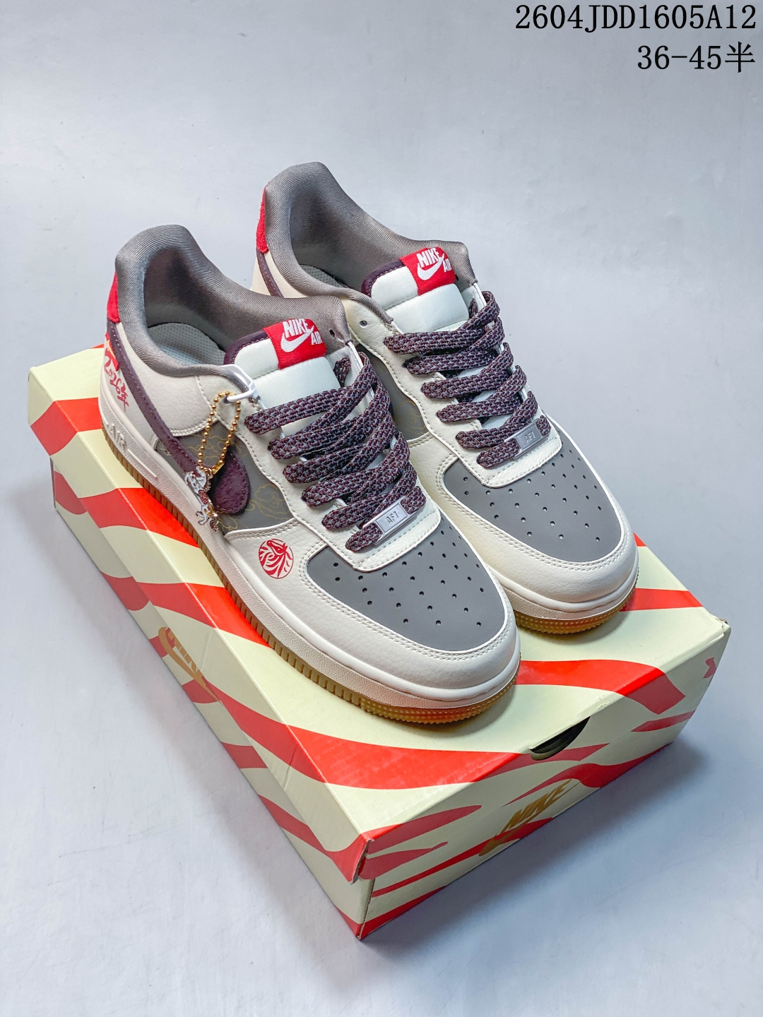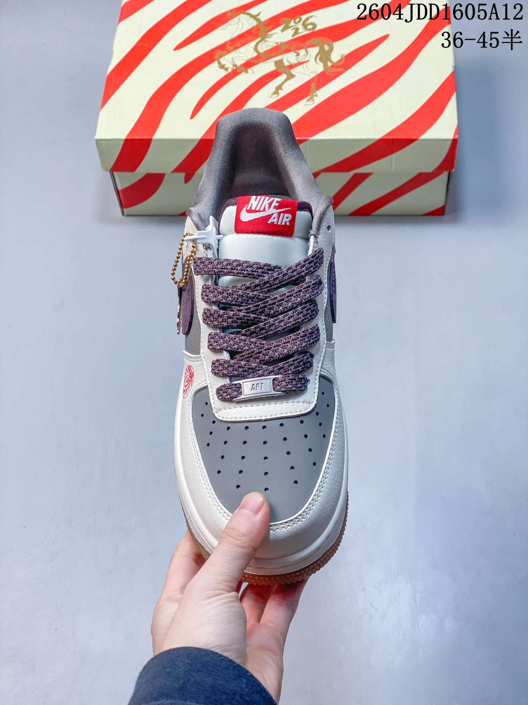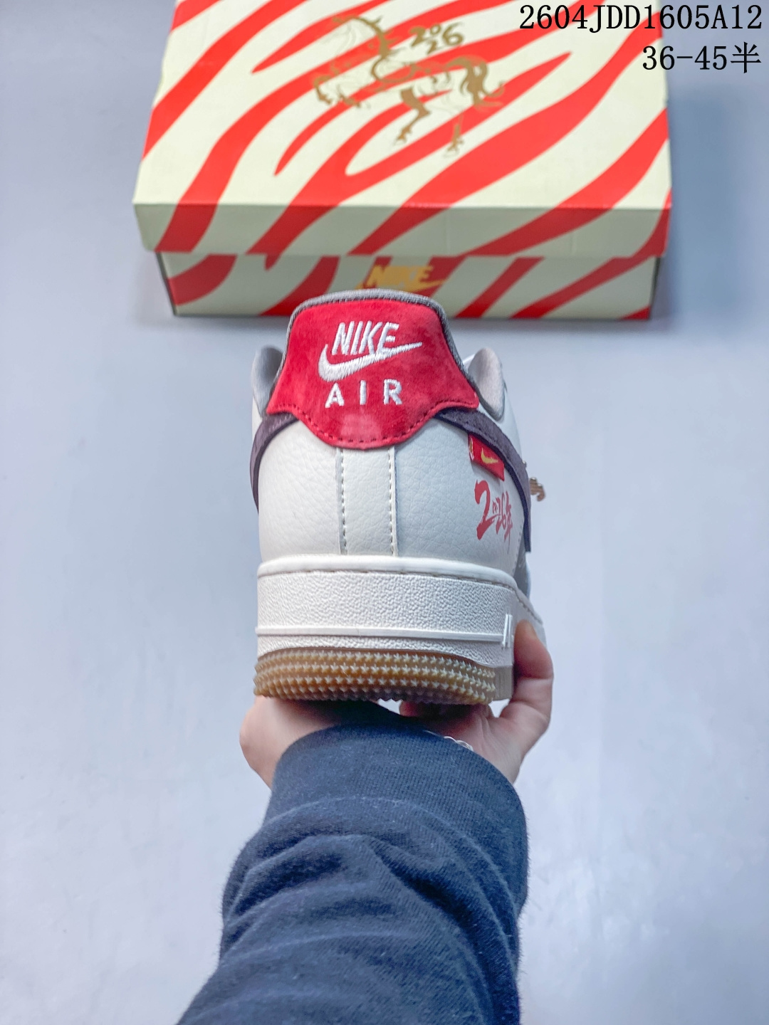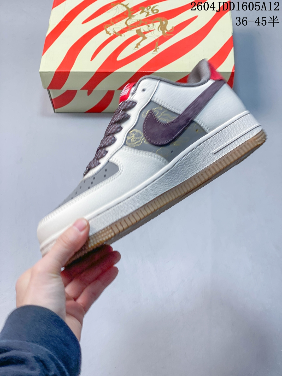 米白荔枝纹搭配浅灰翻毛皮 酒红色勾与黑色中底 材质层次丰富且视觉对比柔和 鞋侧印有黑色 马 字书法与祥云图案 鞋头处的 福 字印章纹样 以及耐克勾上的祥云刺绣 传递 马到成功 福气满盈 的祝福 定制鞋盒 超高清洁度 细节完美