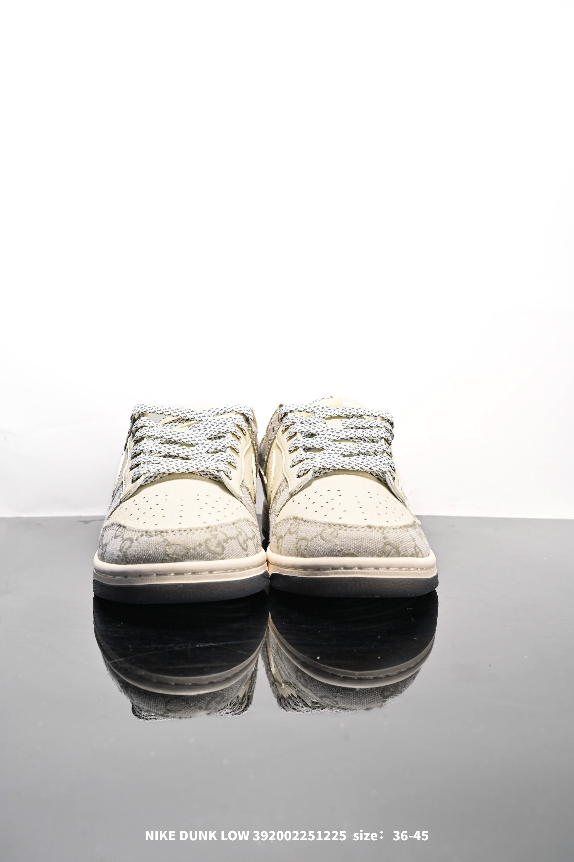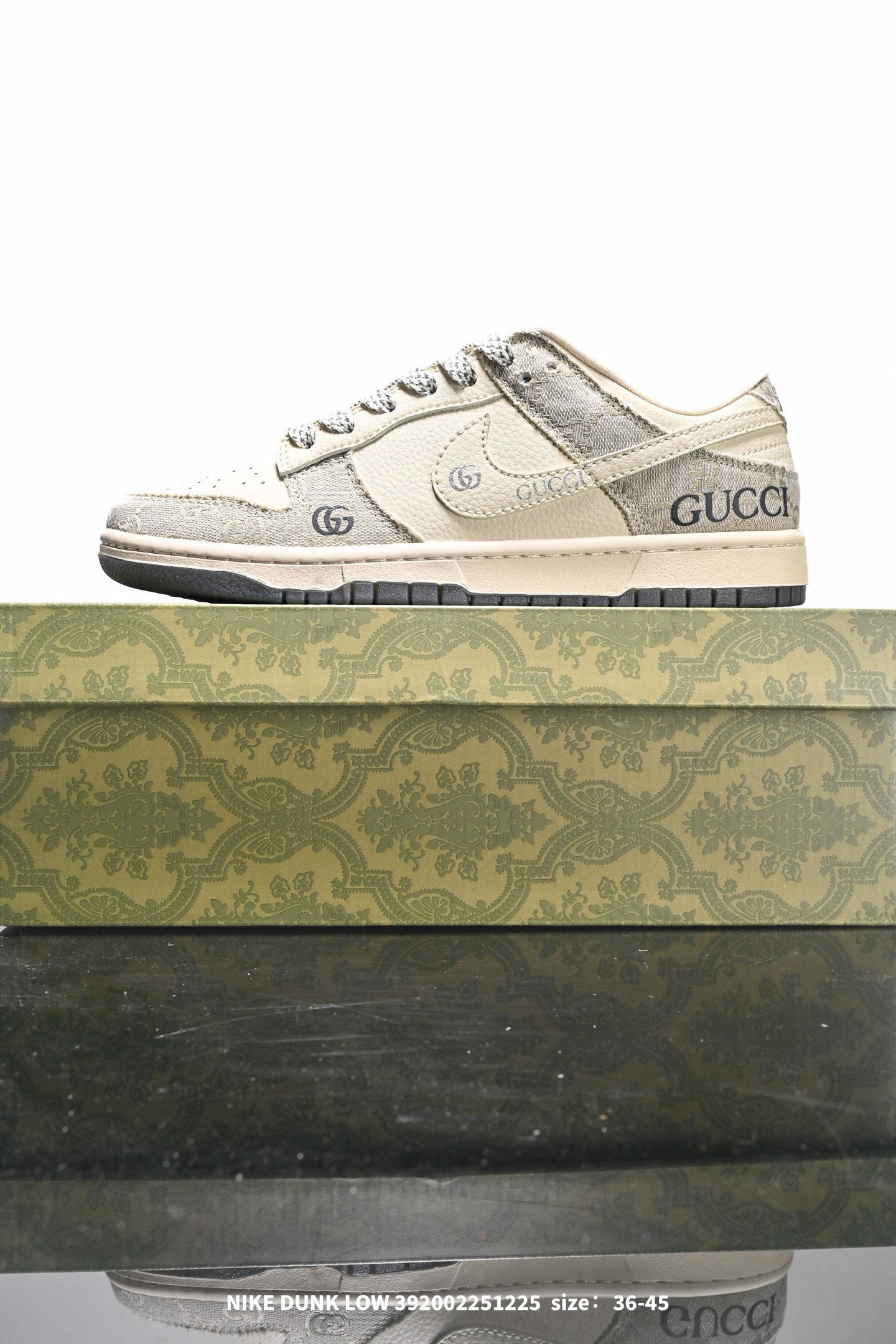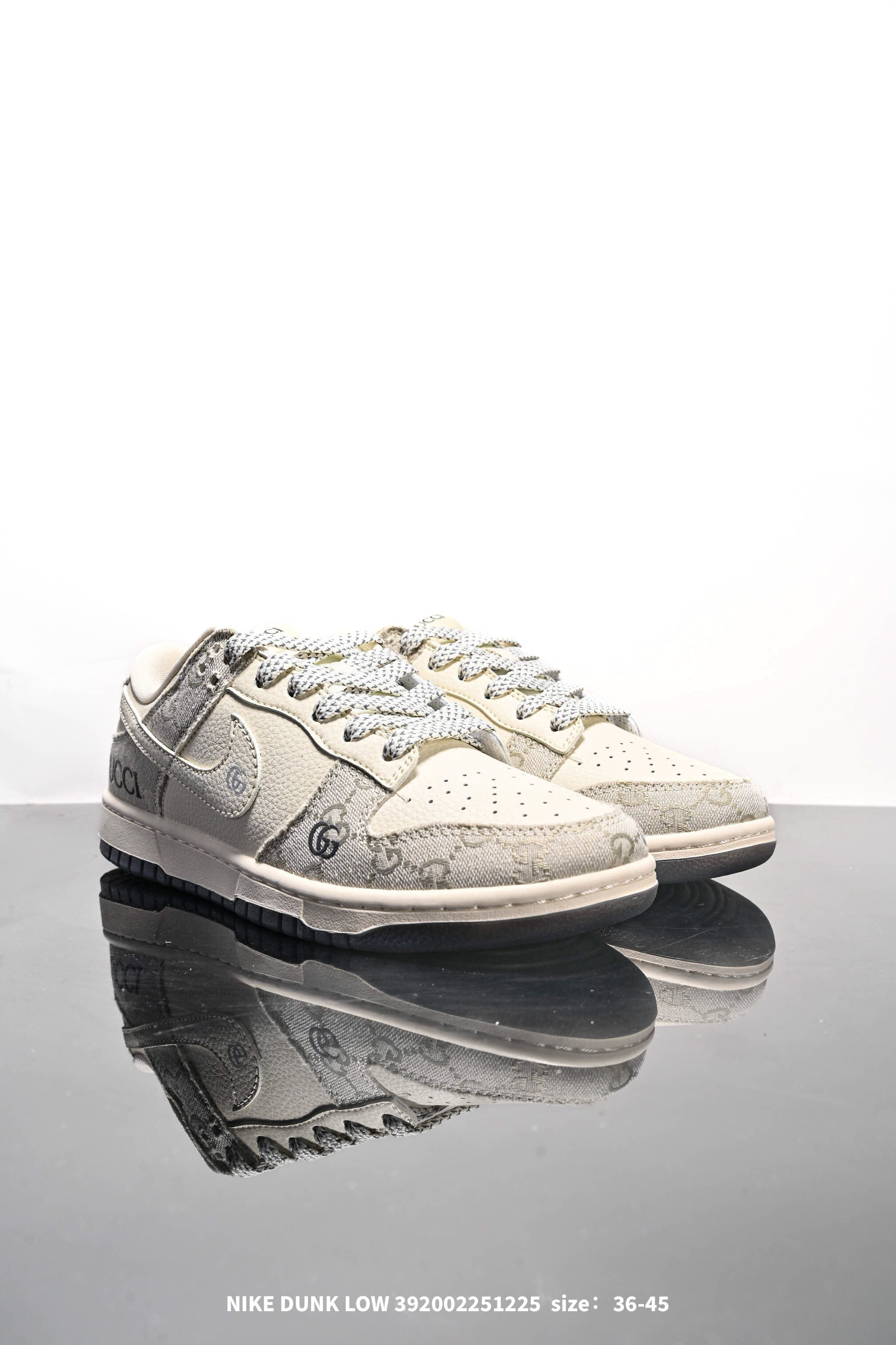 Nike 耐克 男女鞋真标半码制 全新2021版更新数据窄楦翘头版型 采用硬质牛剖革组合GG提花帆布鞋面材质 大厂水平严控清洁度 缜密拉帮中底布 鞋垫嵌EVA缓震物料及背胶 全新窄版翘头耐磨橡胶大底创意定制配色 联乘意大利奢侈品牌 古驰Gucci x Nike SB Dunk Low Esquisite Gucci 扣篮系列低帮休闲运动滑板板鞋 拼接奶白浅白GG布 CF3688 003