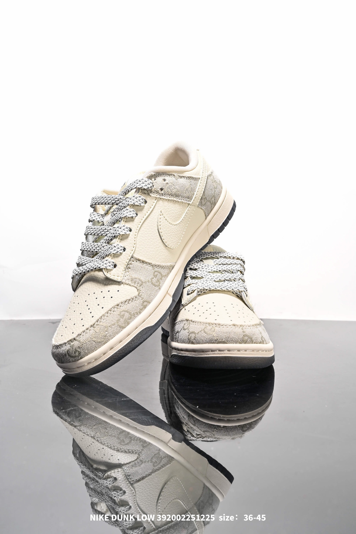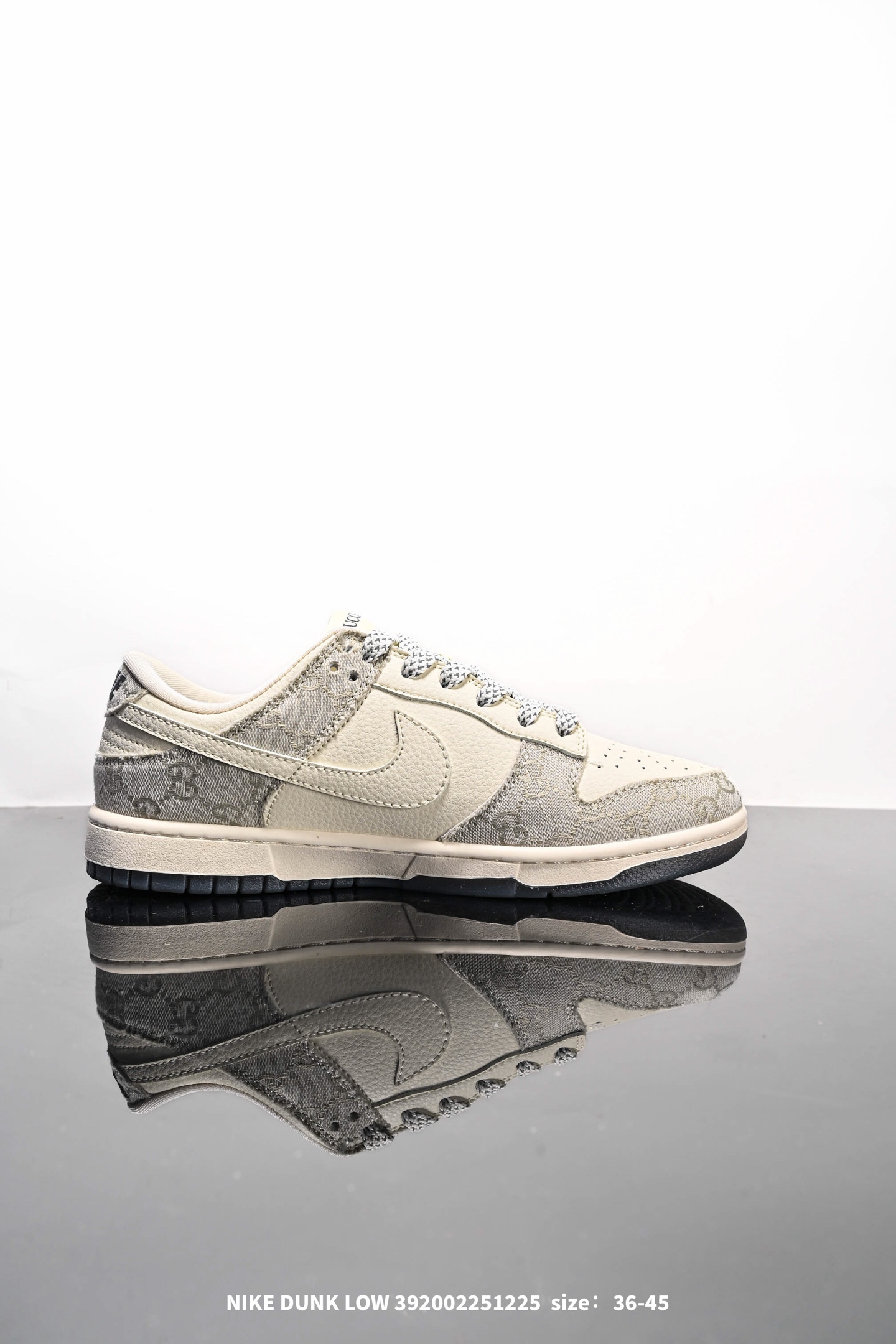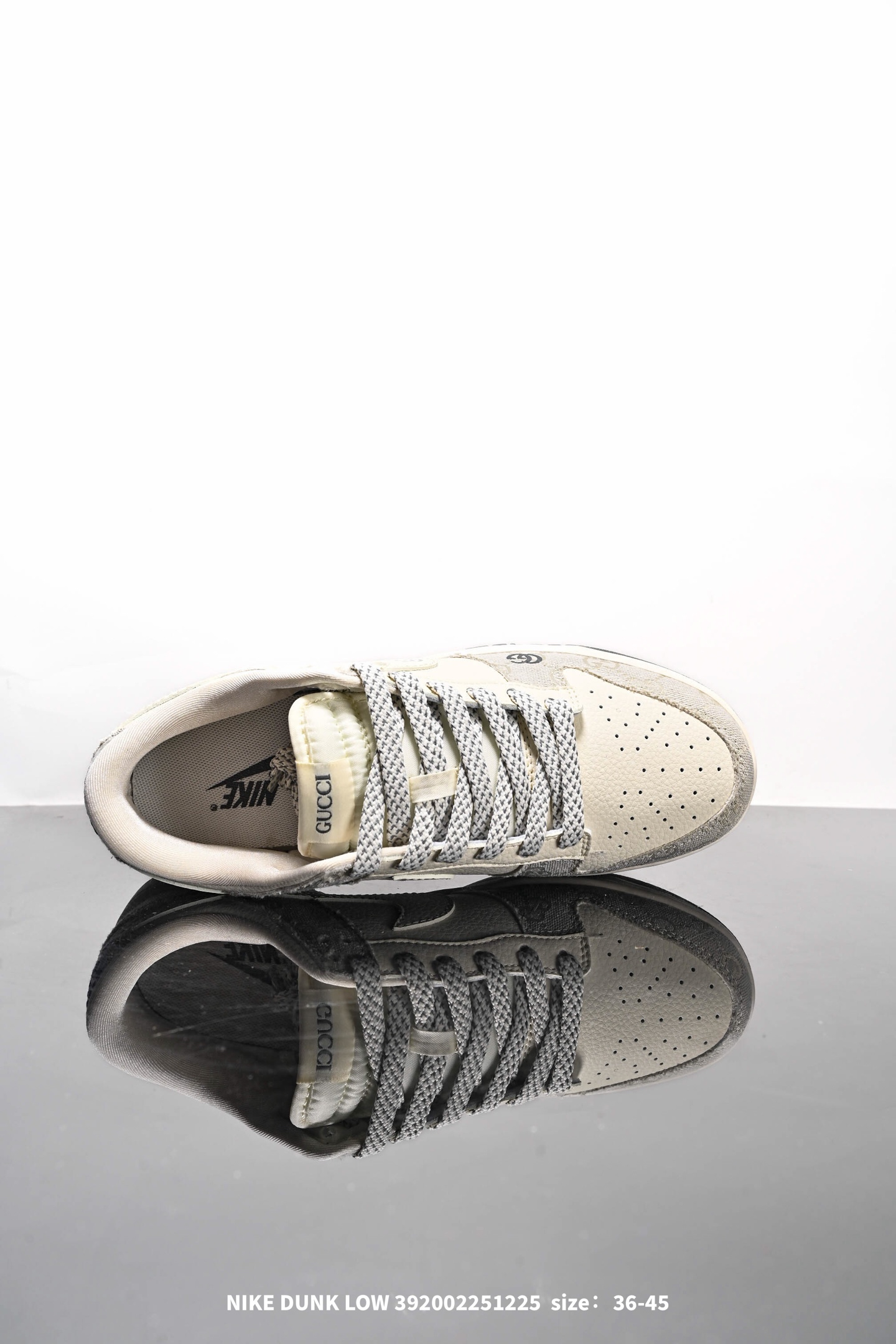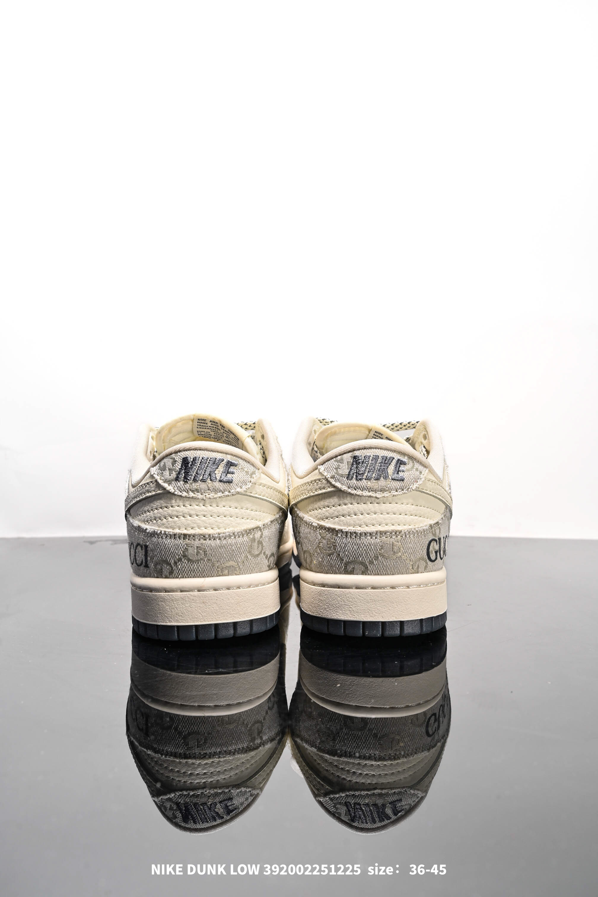 Nike 耐克 男女鞋真标半码制 全新2021版更新数据窄楦翘头版型 采用硬质牛剖革组合GG提花帆布鞋面材质 大厂水平严控清洁度 缜密拉帮中底布 鞋垫嵌EVA缓震物料及背胶 全新窄版翘头耐磨橡胶大底创意定制配色 联乘意大利奢侈品牌 古驰Gucci x Nike SB Dunk Low Esquisite Gucci 扣篮系列低帮休闲运动滑板板鞋 拼接奶白浅白GG布 CF3688 003