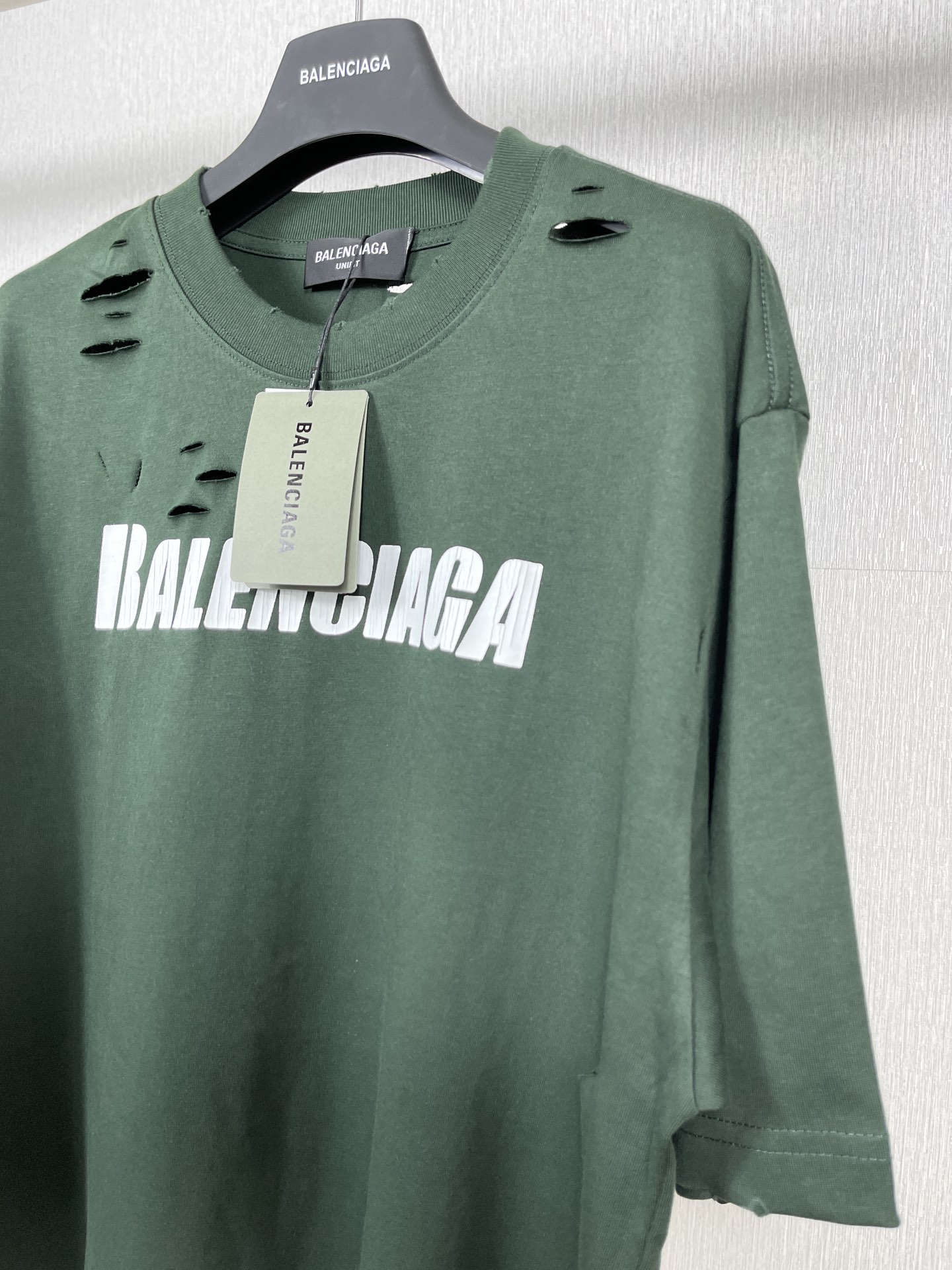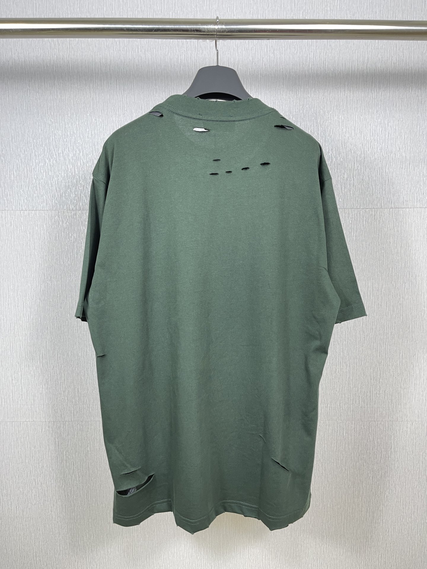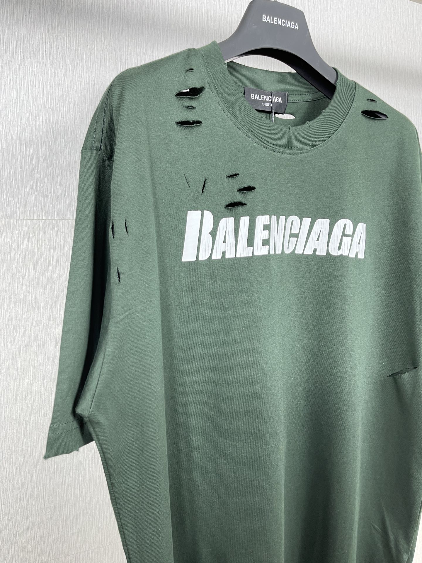 实拍图 顶级版本 官网品质 BALENCI GA 巴黎 经典字母LOGO印花成衣水洗做旧破洞割烂短袖T恤 砖柜同步 面料采用巴黎ZP定织定染全棉双纱紧密棉 克重260克 布面干净 布纹清晰 柔软舒适 螺纹釆用定染无色差 经典图案采用环保进口材料印花 直裂纹拉裂胶浆 精密印花网板 字母清晰 效果立体 还原砖柜 成衣水洗作旧 多位手工磨烂割烂 超重工艺生产 巨别市场通货 欢迎对比 版型釆用OS宽松落肩版型 男女同款