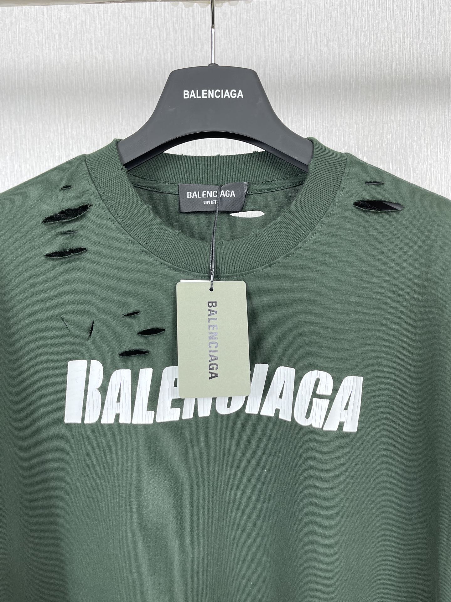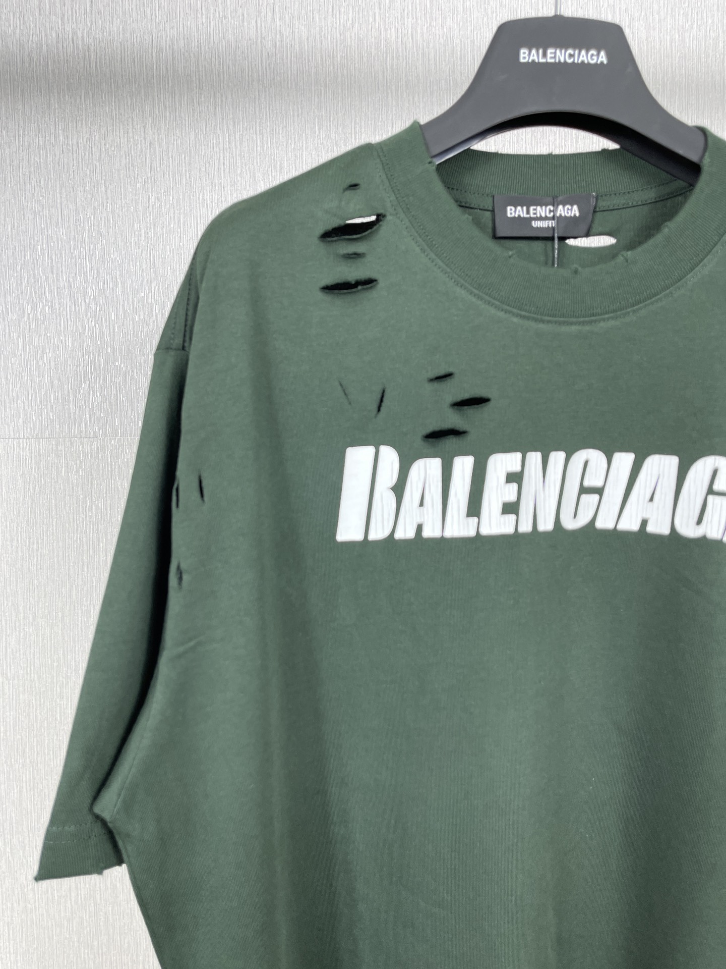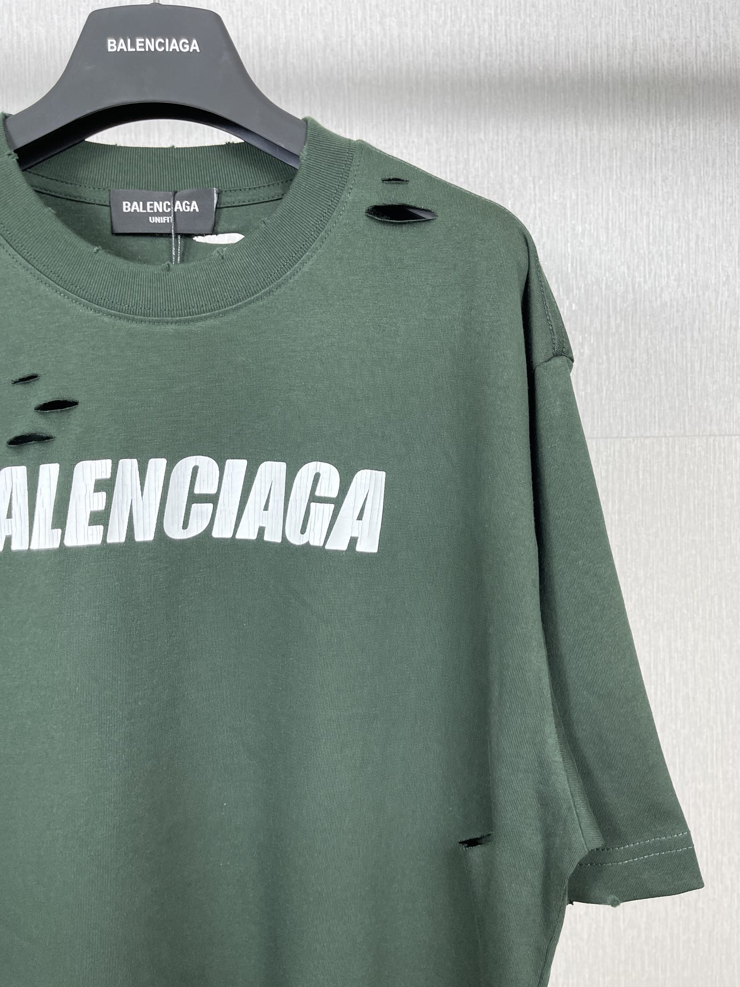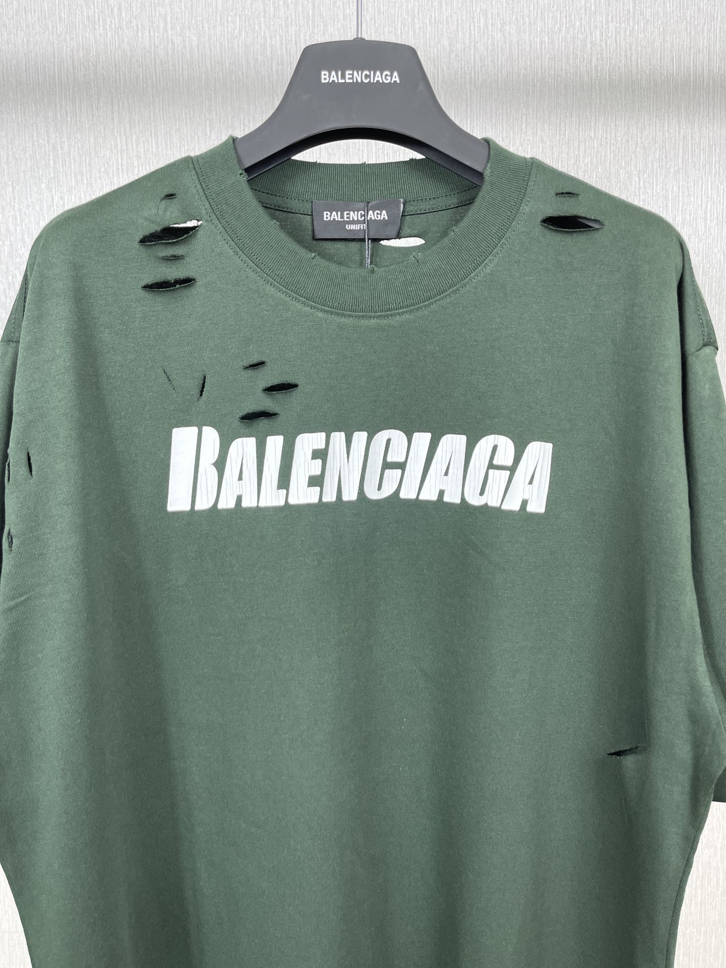 实拍图 顶级版本 官网品质 BALENCI GA 巴黎 经典字母LOGO印花成衣水洗做旧破洞割烂短袖T恤 砖柜同步 面料采用巴黎ZP定织定染全棉双纱紧密棉 克重260克 布面干净 布纹清晰 柔软舒适 螺纹釆用定染无色差 经典图案采用环保进口材料印花 直裂纹拉裂胶浆 精密印花网板 字母清晰 效果立体 还原砖柜 成衣水洗作旧 多位手工磨烂割烂 超重工艺生产 巨别市场通货 欢迎对比 版型釆用OS宽松落肩版型 男女同款