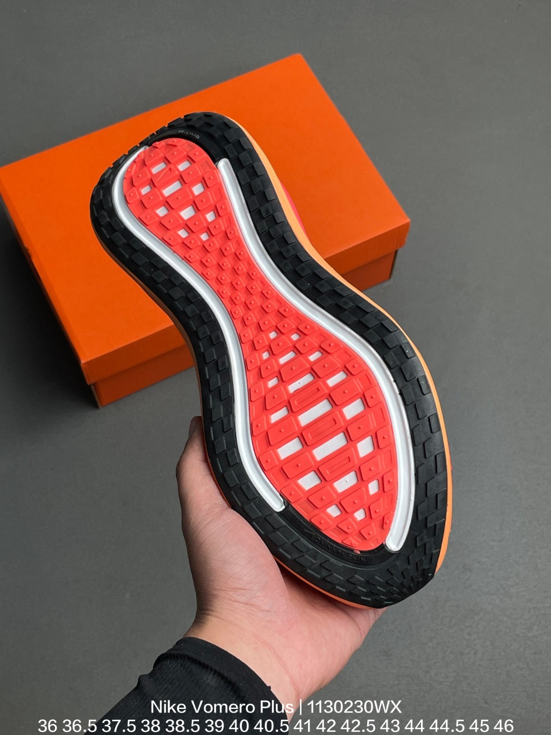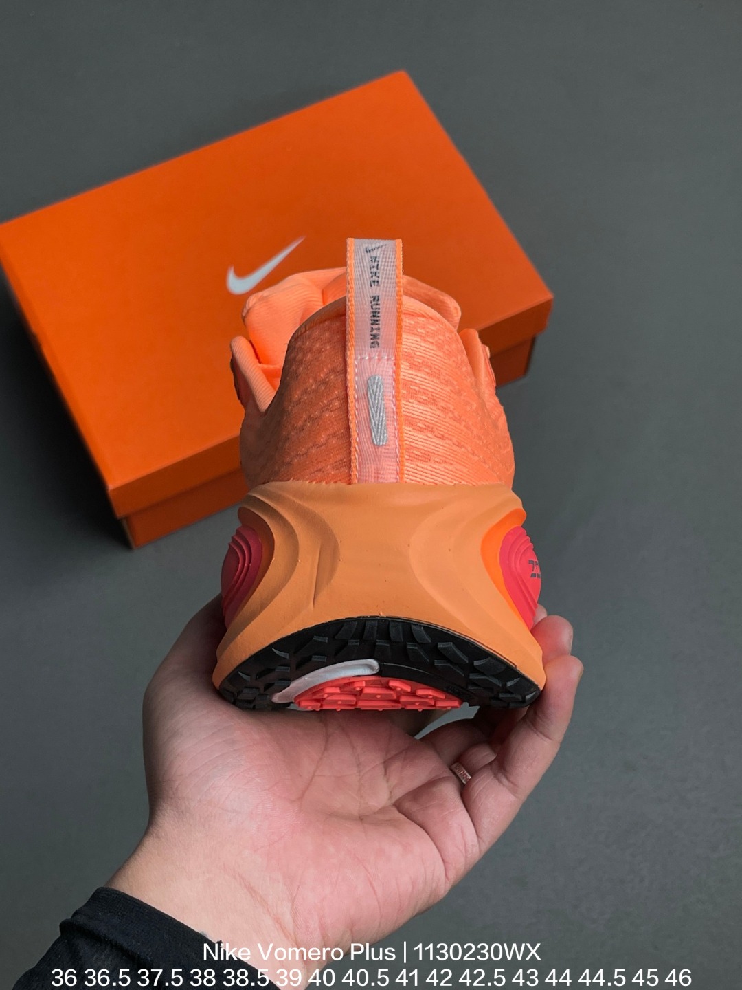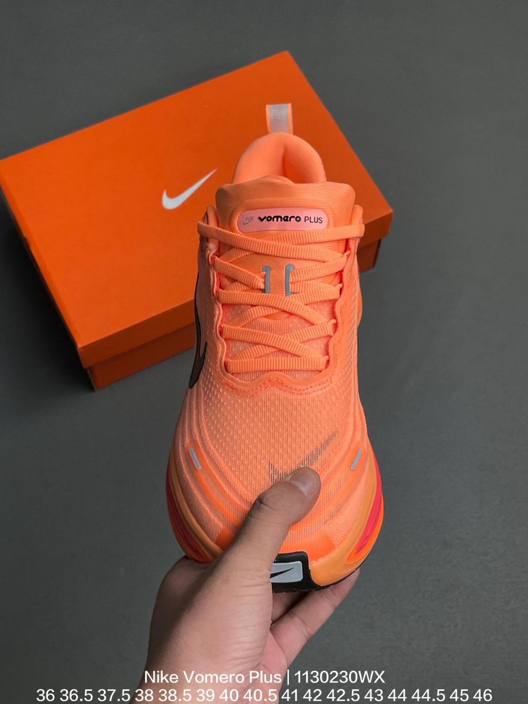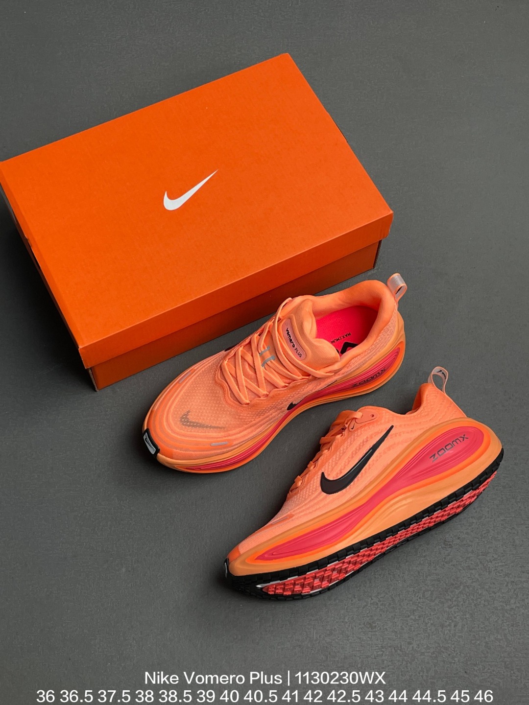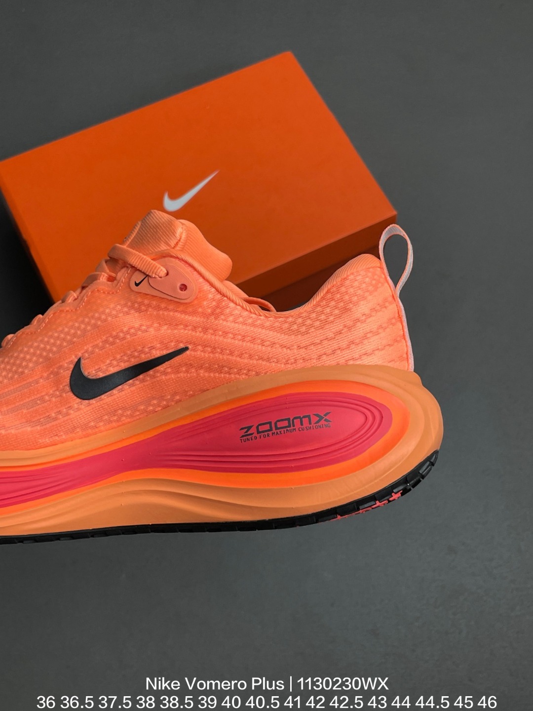Nike 耐克 采用科技织法轻盈织物合成鞋面材质 ZoomX 泡绵中底 外置外置防滑耐磨橡胶底片造舒适迈步体验 助力日常畅跑 耐克Nike Vomero Plus Bright Mango 佛莫罗加强版系列低帮轻质厚底缓震公路透气休闲运动跑步鞋