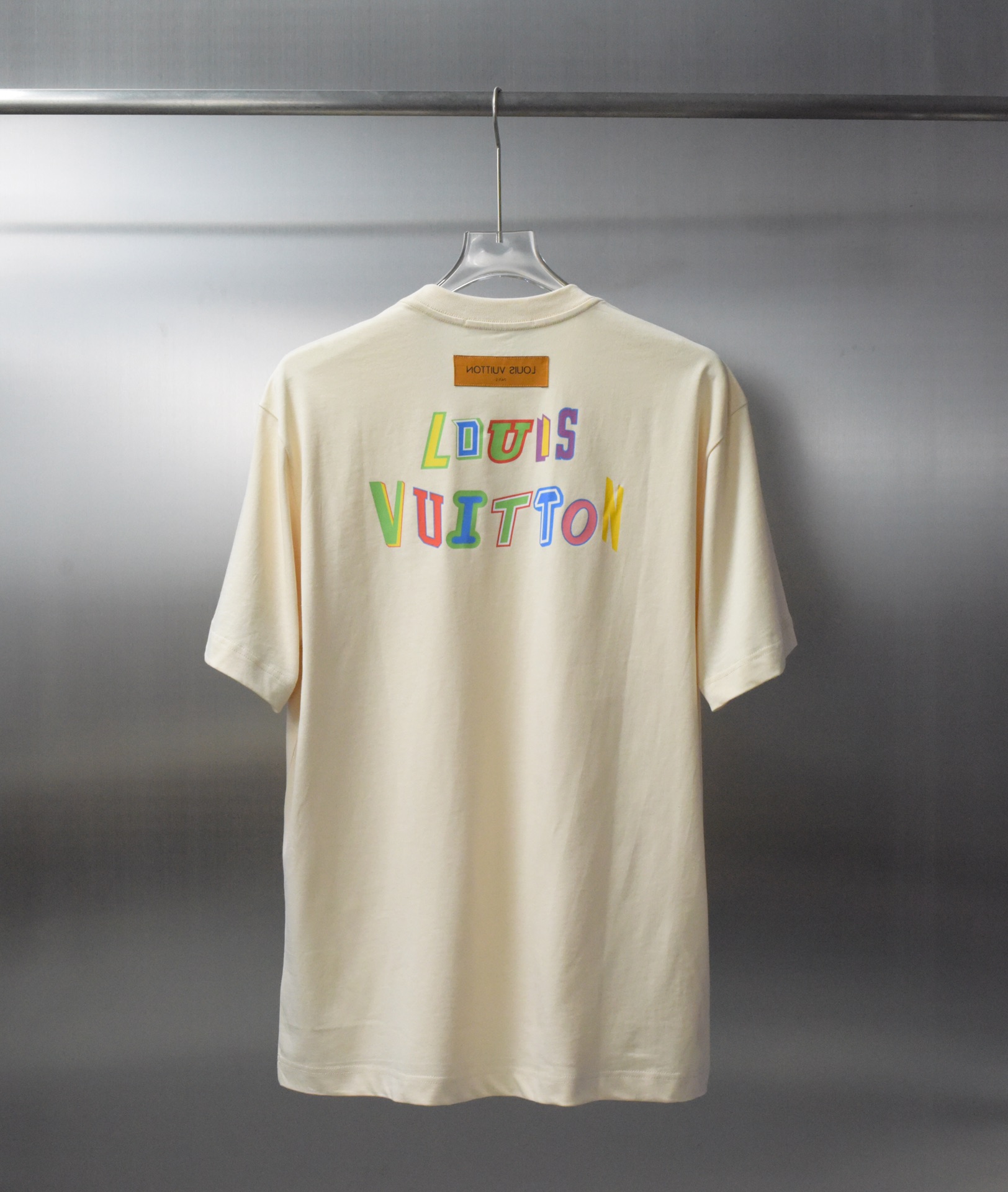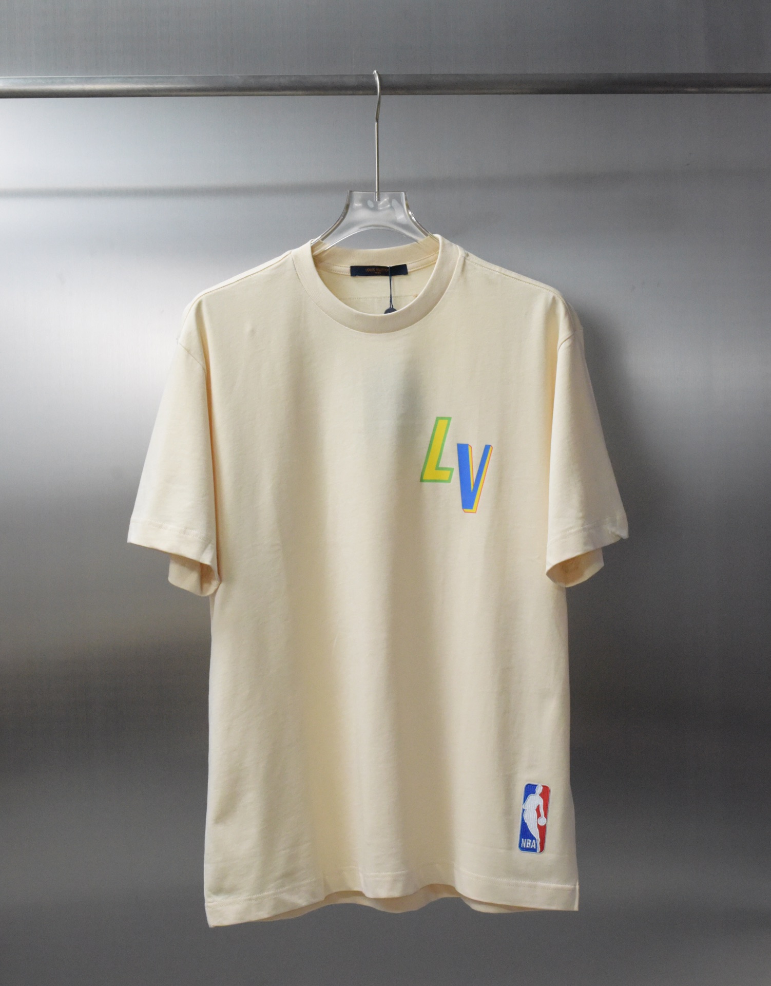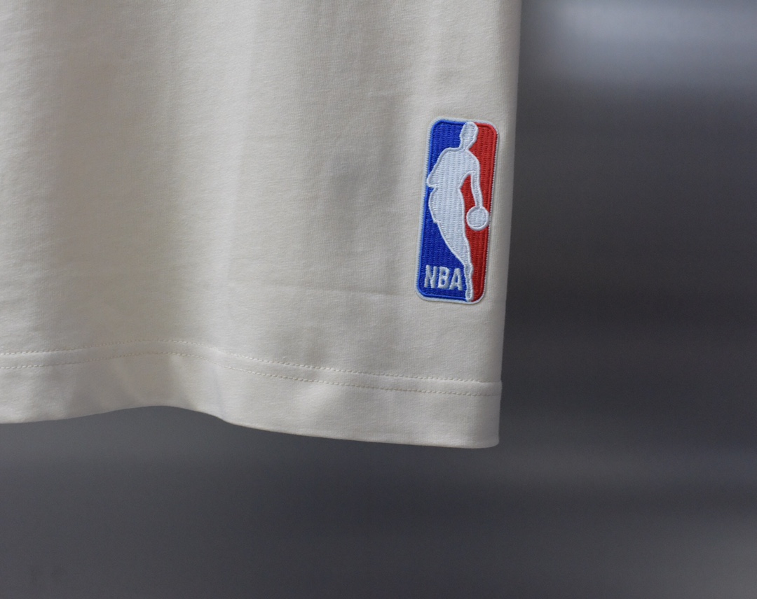 LV NBA联名短袖工艺说明 印花处采用最传统的人工烫画亮面效果成本极高 平车精准定位才能镶接罗纹 男女同款