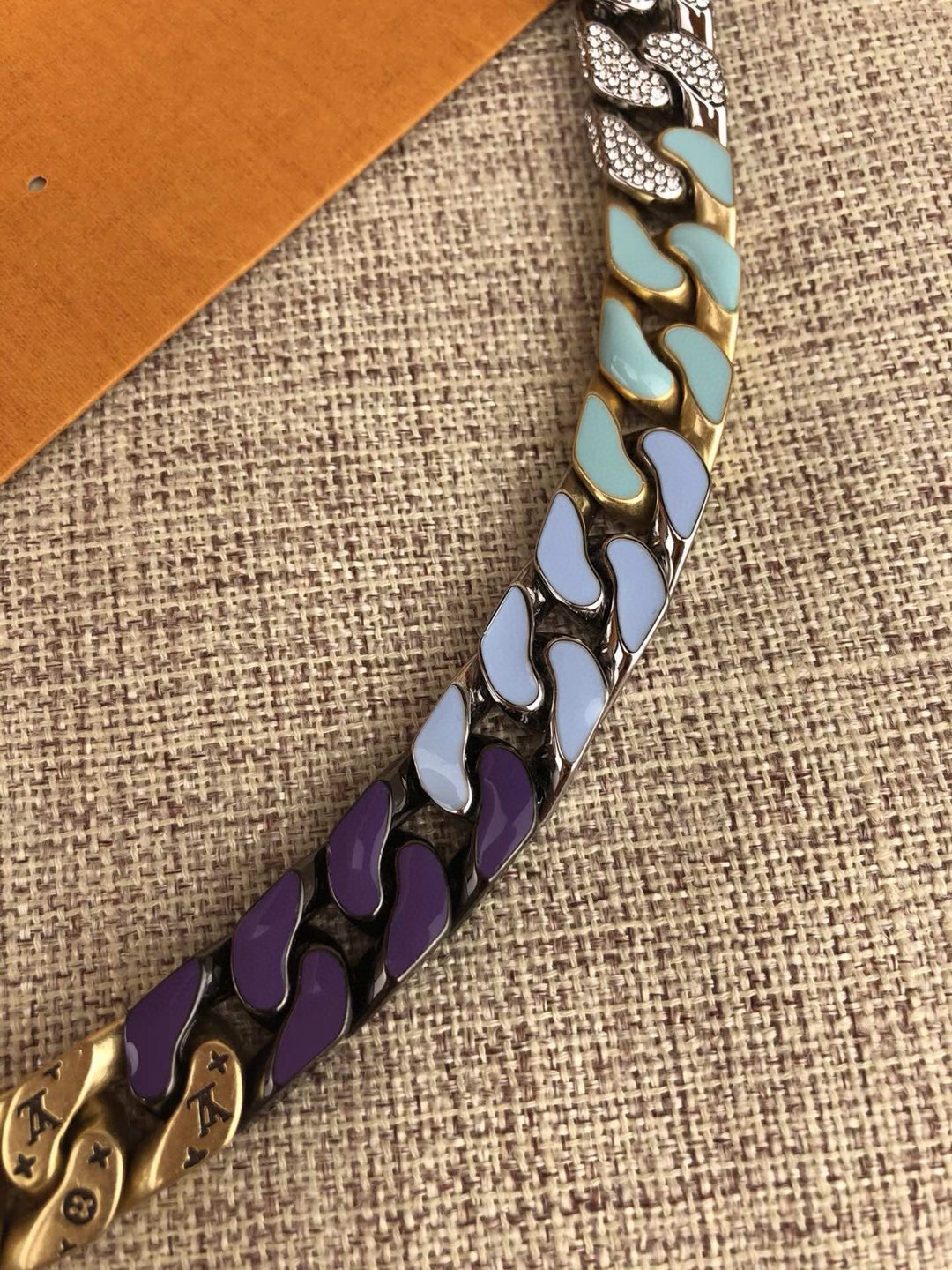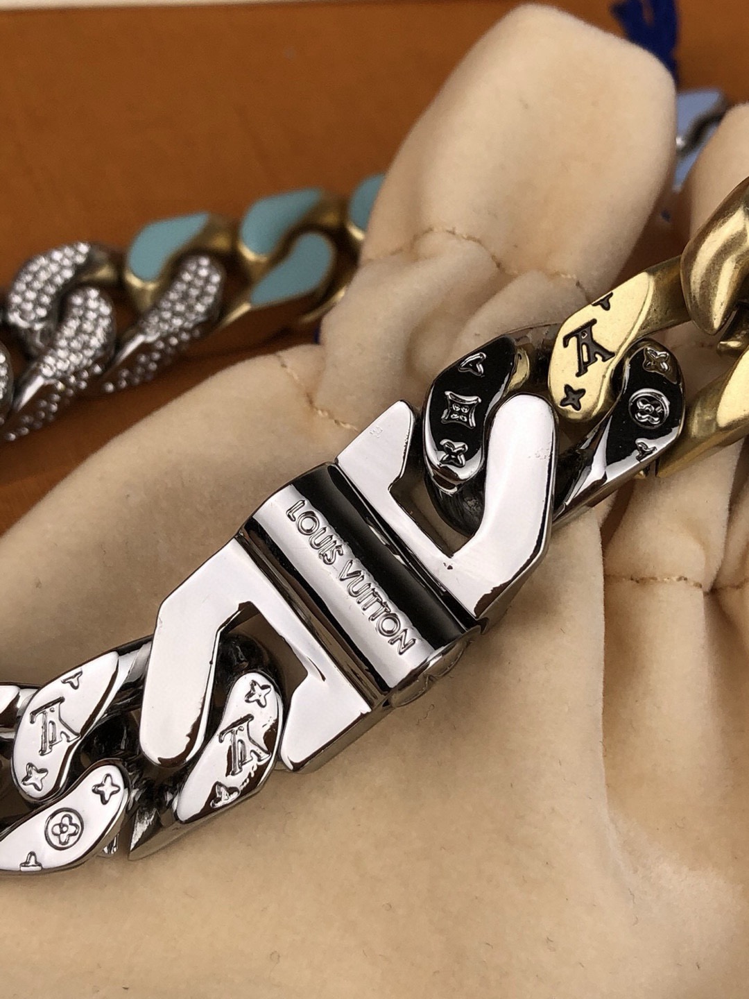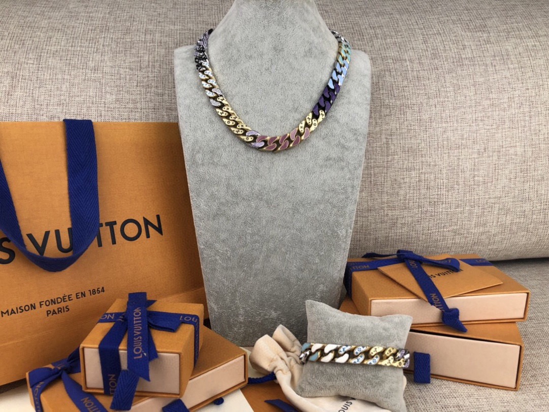 Cuban Chain 项链描摹传统古巴风格饰品精髓 感悟滑板风潮与嘻哈型格带来的时尚影响 金属与珐琅塑造 L 字与 V 字的繁复交错 其上匠心镂刻 Monogram 图案 更有路易威登铭纹点缀创新按压式开合设计