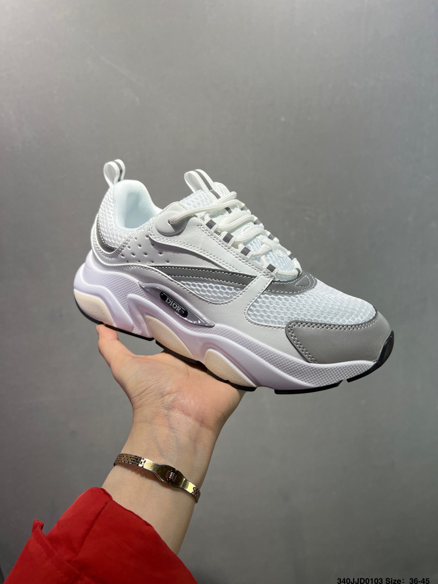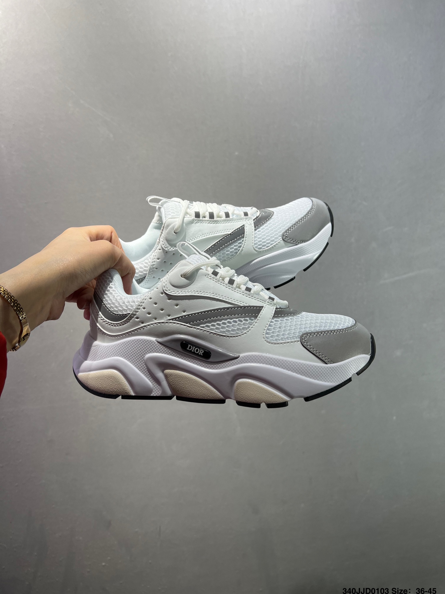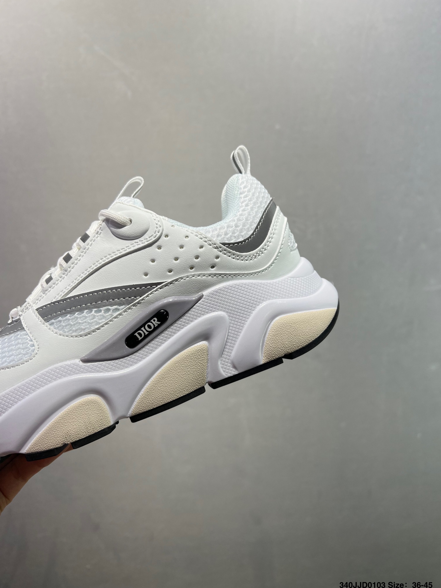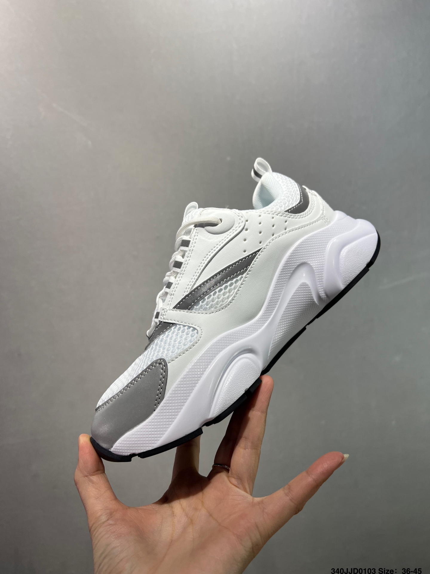 顺应复古市场的趋势的 Dad Shoes风格鞋款鞋舌上的Dior标志 也注明了这双鞋是B30的型号 B30运用了质感细腻的皮革和网眼布面材质拼接成鞋身 鞋身两侧有显眼的字母CD 表明身份 鞋身多处线条勾勒细节 让鞋子看起来不那么单调 复古味十足