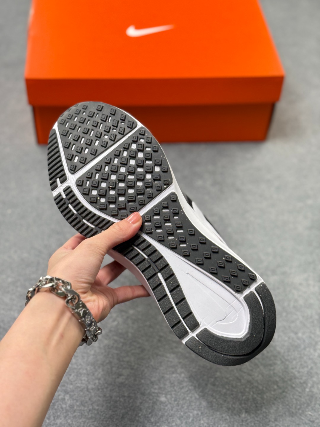 防滑耐磨 橡胶大底采用华夫格设计 纹路较深 提供了良好的抓地力和耐磨性 在一般跑道和城市道路上能应对大多数情况 湿滑地面上也能提供足够抓地力