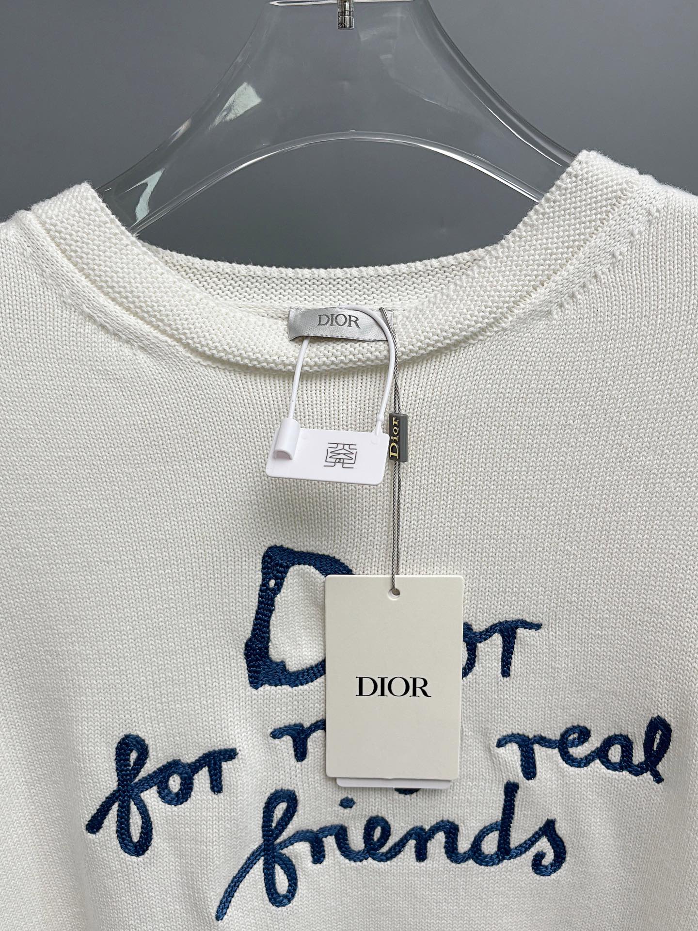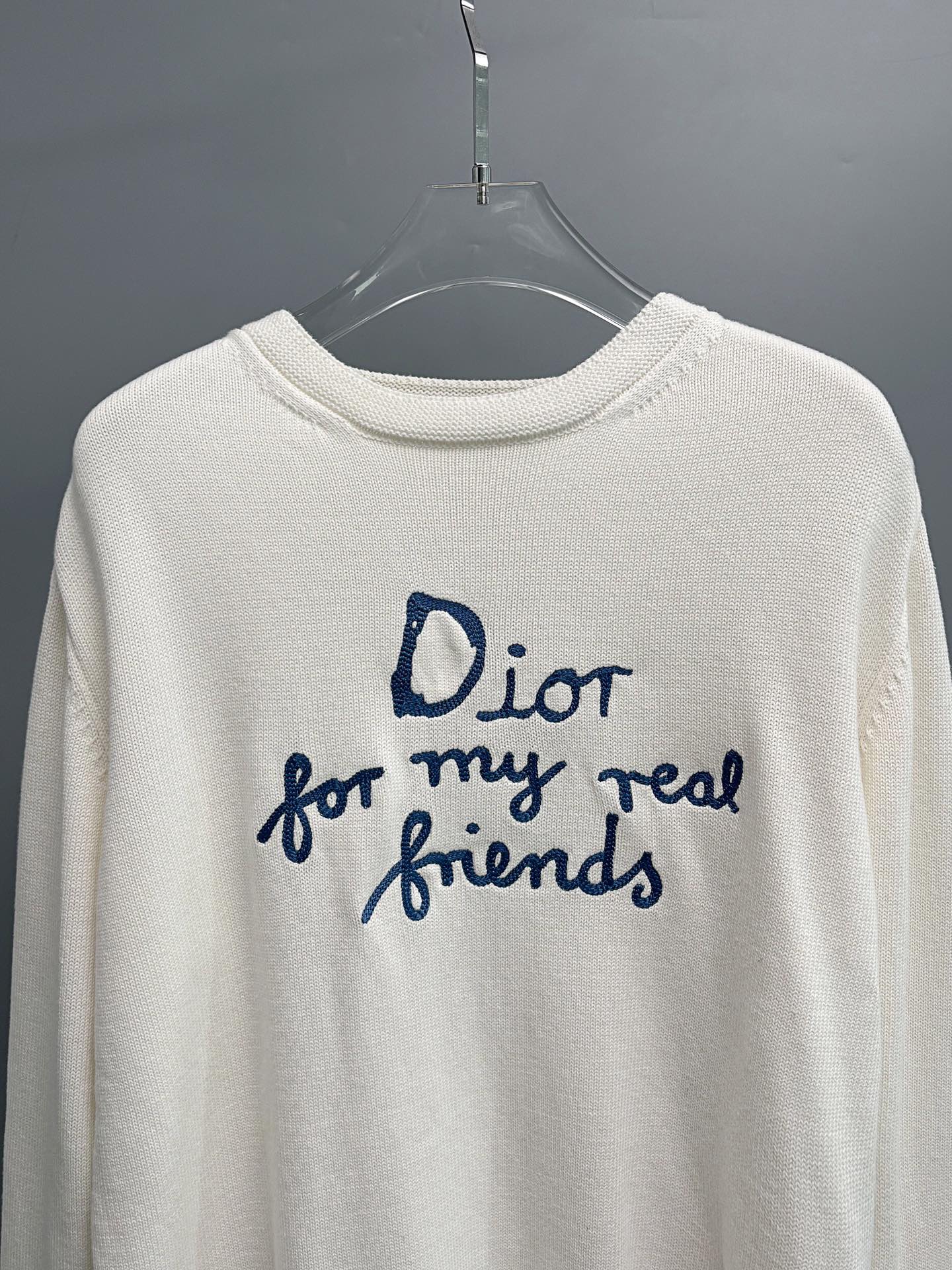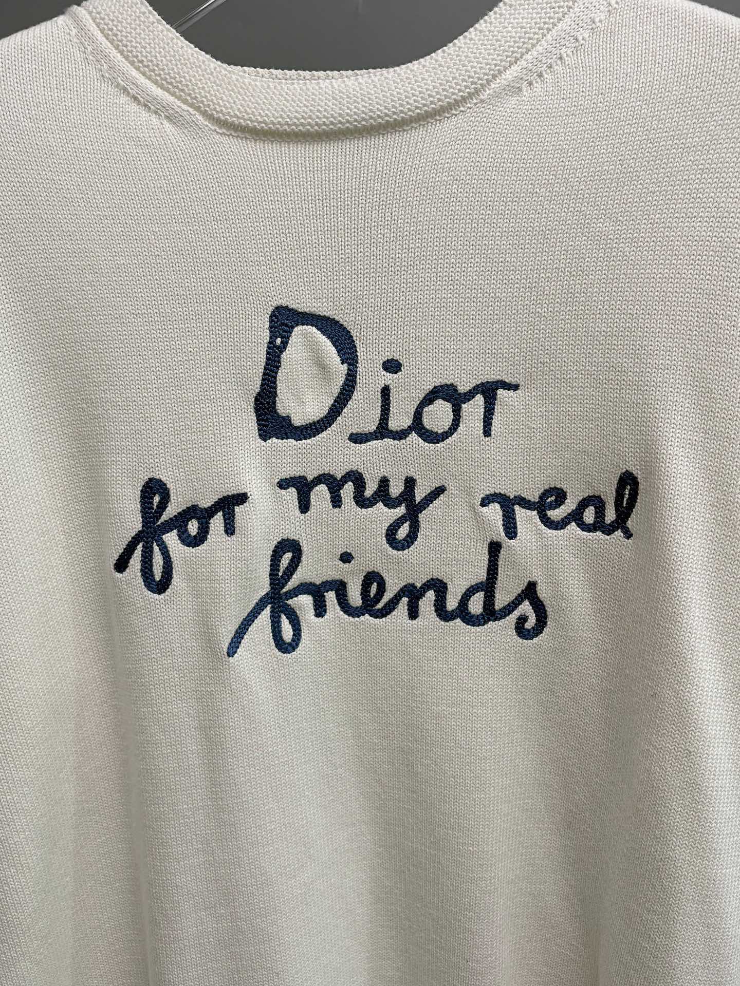 定制优选棉锦羊毛精混针织料 胸前利落的 Dior For My Real Friends 宣言以毛巾绣工艺呈现 形成微妙的肌理层次 让文字成为流动的品牌徽章