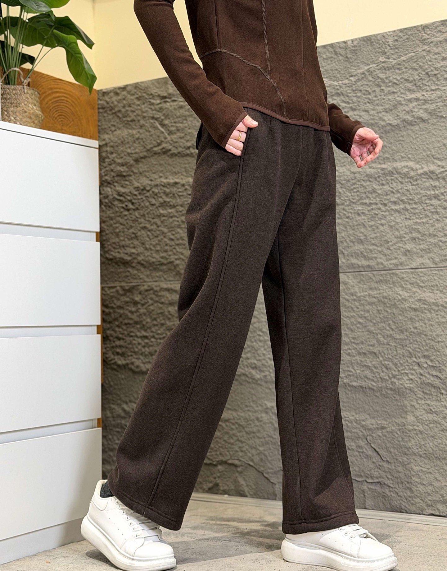 产品特点 采用醋酸天丝羊毛混纺面料 质地厚实软糯有肉感 耐磨抗皱易打理 机洗也不易起球 内里加绒 触肤细腻温暖 亲肤不冰 不鼓包不吸腿 自带垂坠感 久穿仍能保持挺括有型