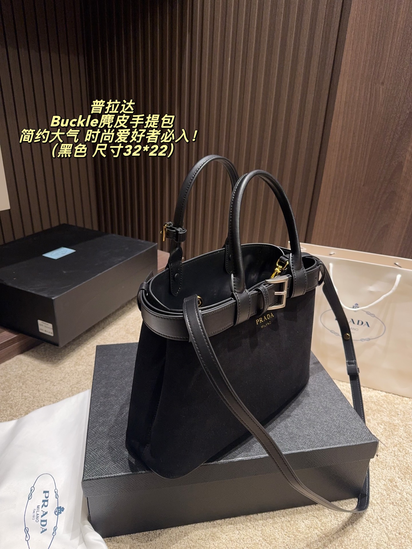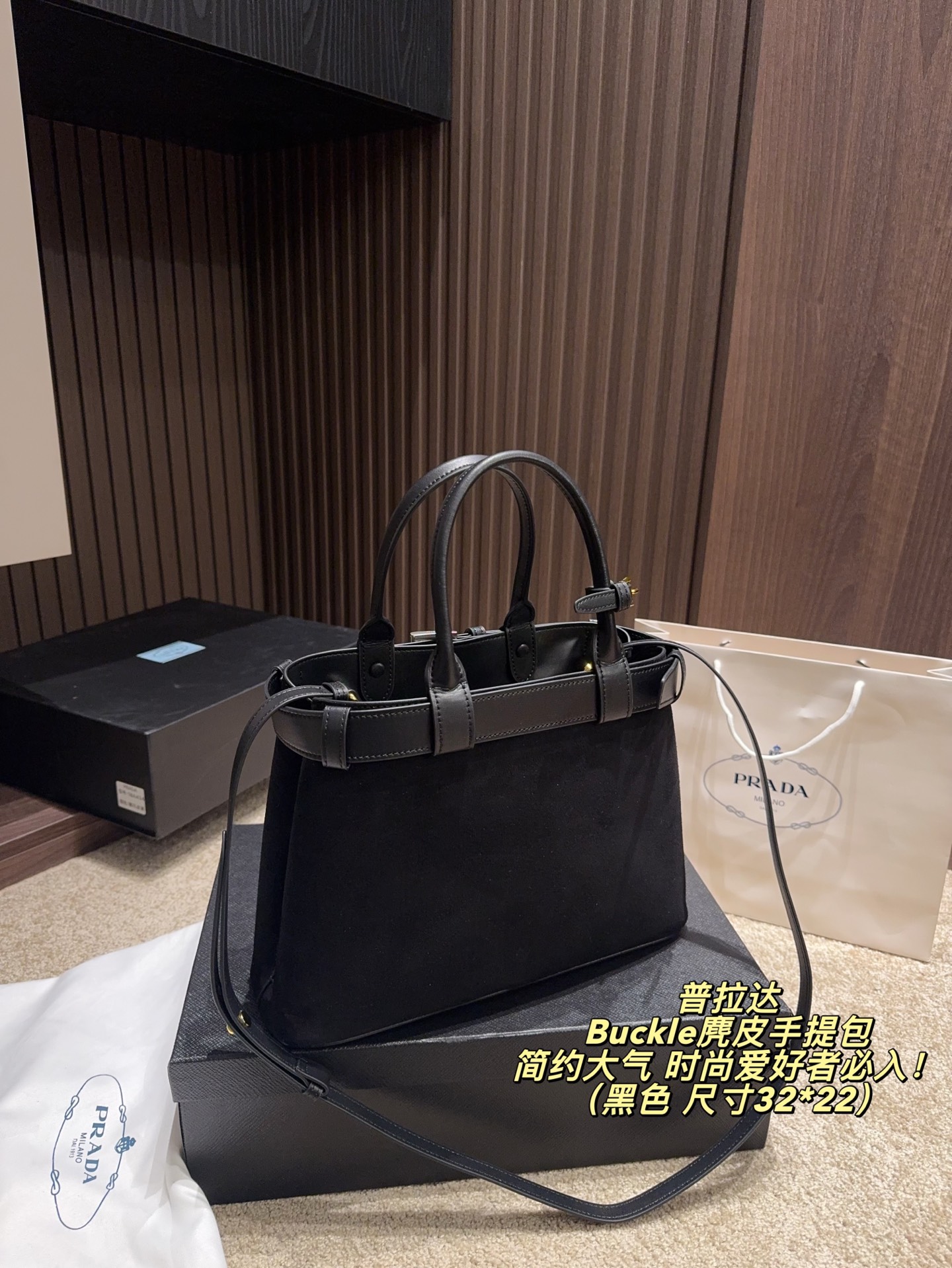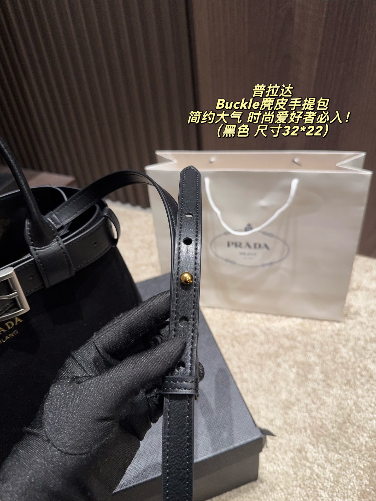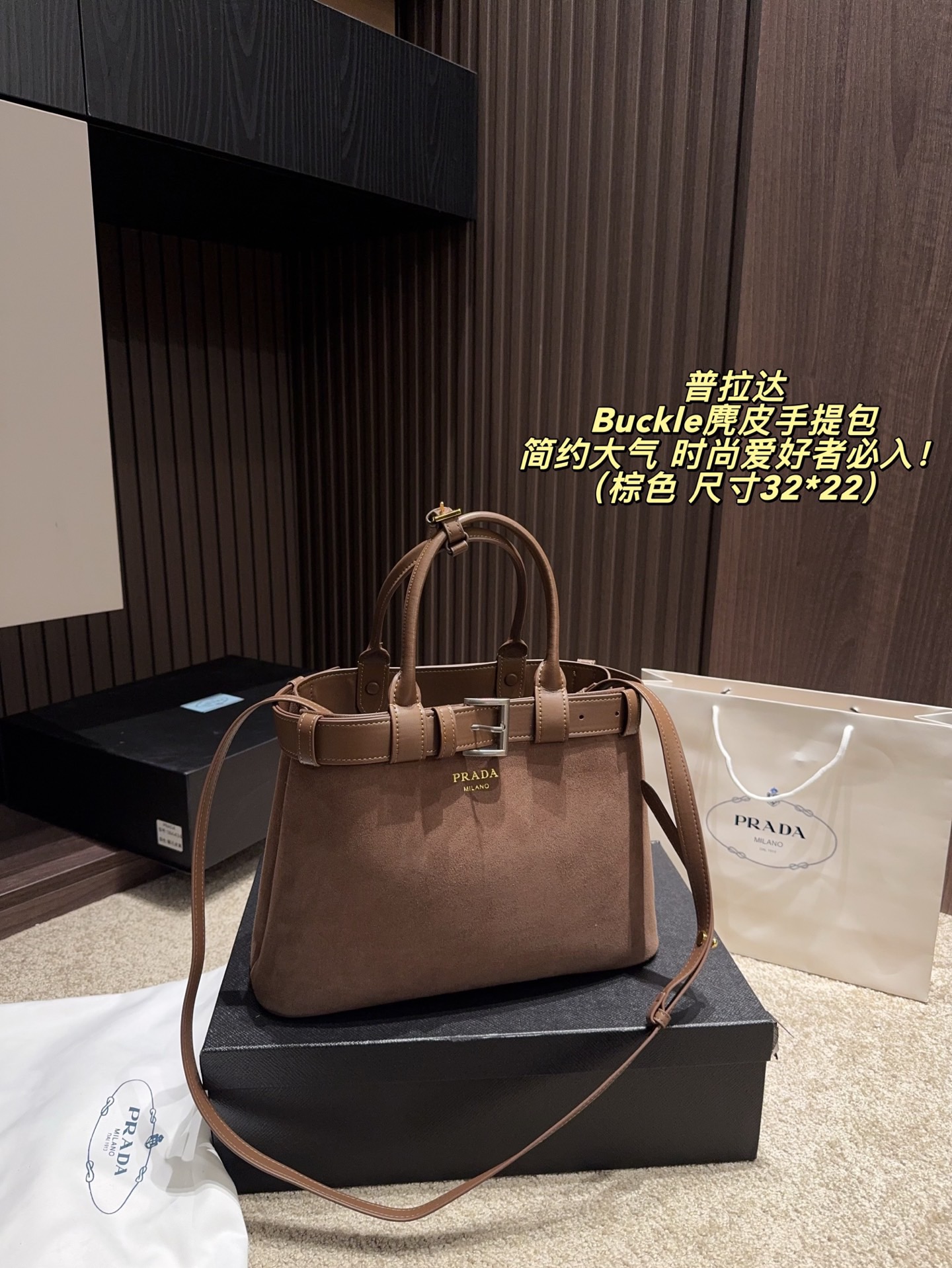 拍折叠盒尺寸32 22 Prada 普拉达 Buckle麂皮手提包 2024春夏系列 采用柔软麂皮 触感细腻 低调哑光质感超有氛围感 标志性金属腰带 三角徽标 辨识度满分 尺寸适中中 通勤休闲都能轻松驾驱 肩带可拆卸调节 手提斜挎随心切换 实用又时髦 简约大气 时尚爱好者必入