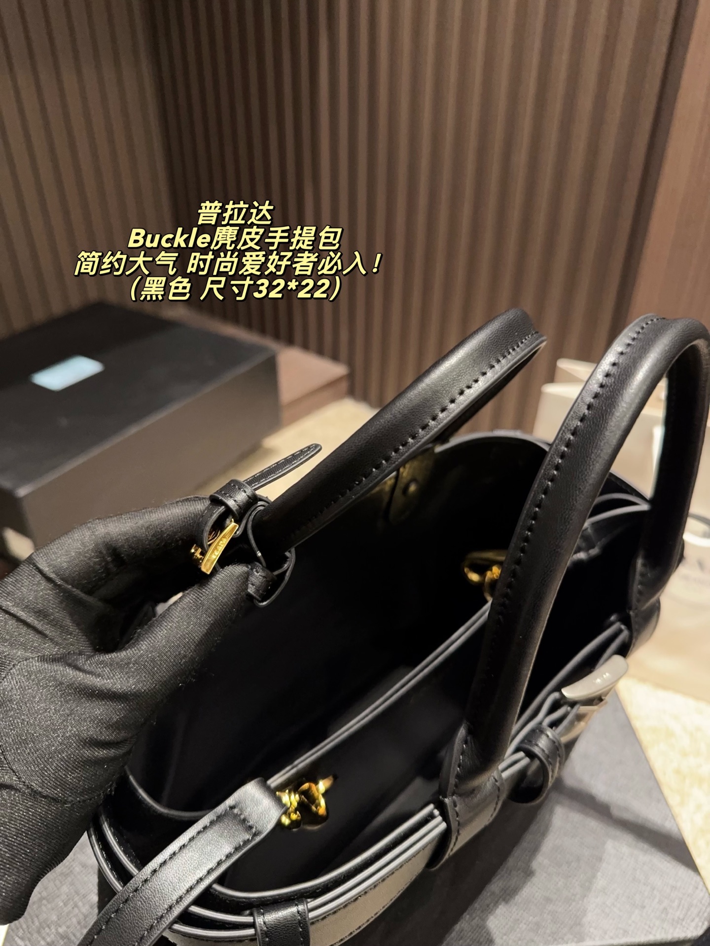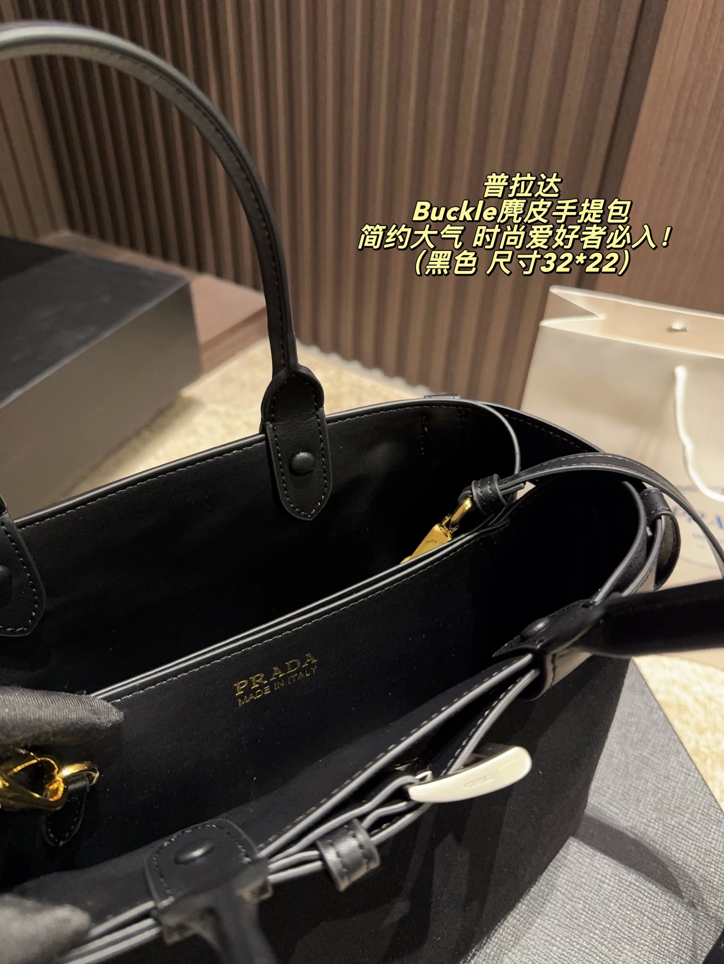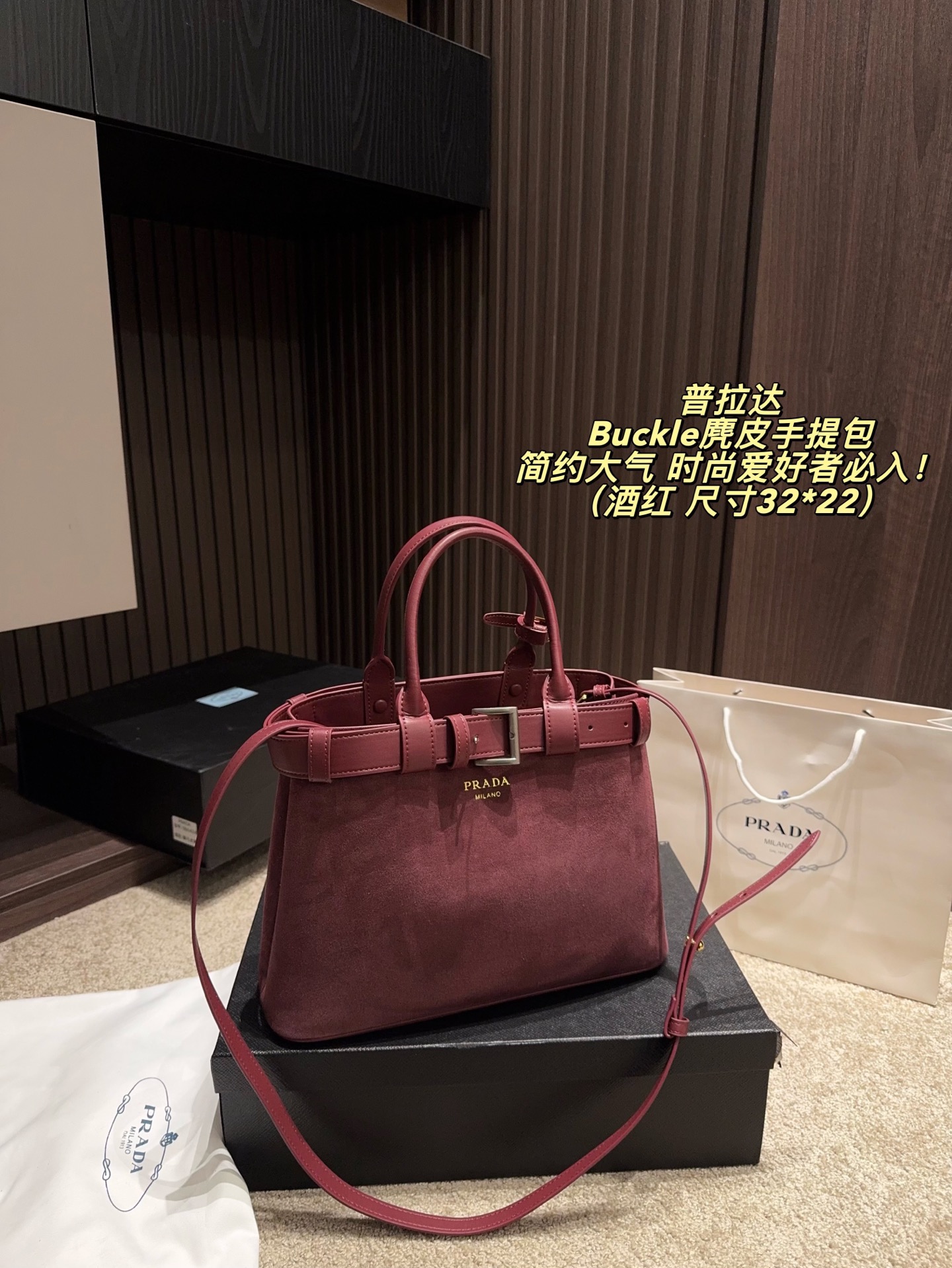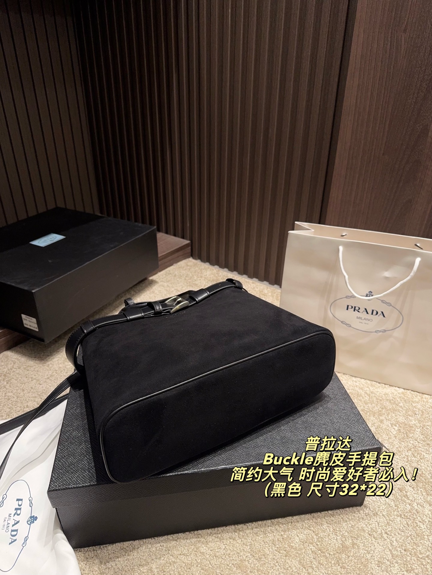 拍折叠盒尺寸32 22 Prada 普拉达 Buckle麂皮手提包 2024春夏系列 采用柔软麂皮 触感细腻 低调哑光质感超有氛围感 标志性金属腰带 三角徽标 辨识度满分 尺寸适中中 通勤休闲都能轻松驾驱 肩带可拆卸调节 手提斜挎随心切换 实用又时髦 简约大气 时尚爱好者必入