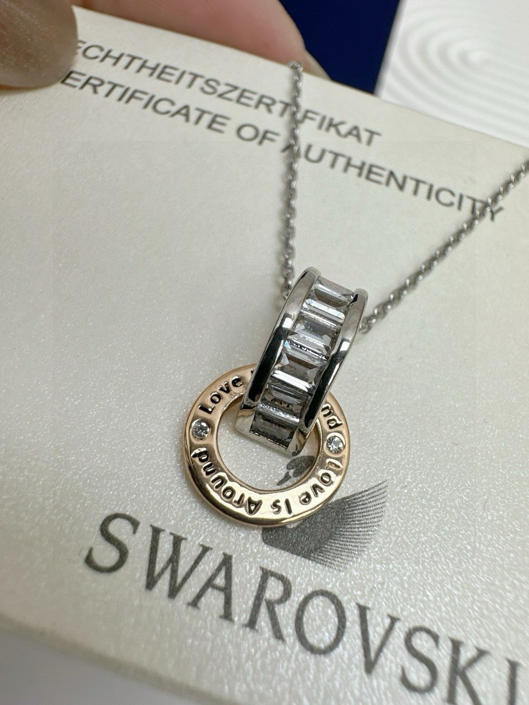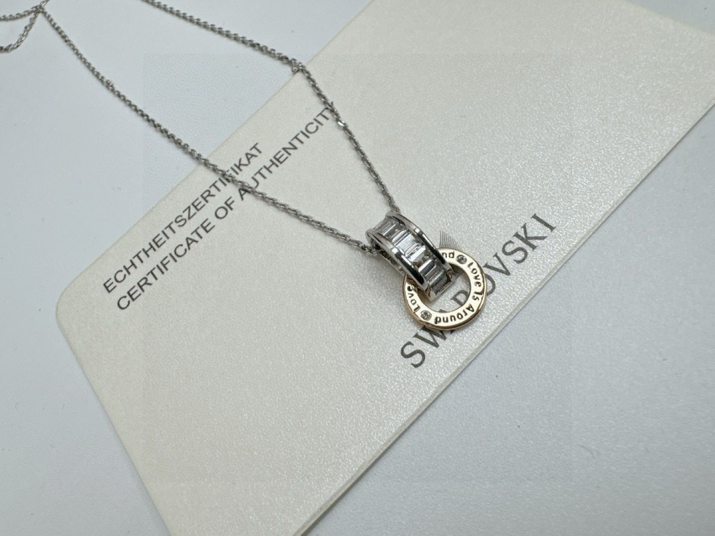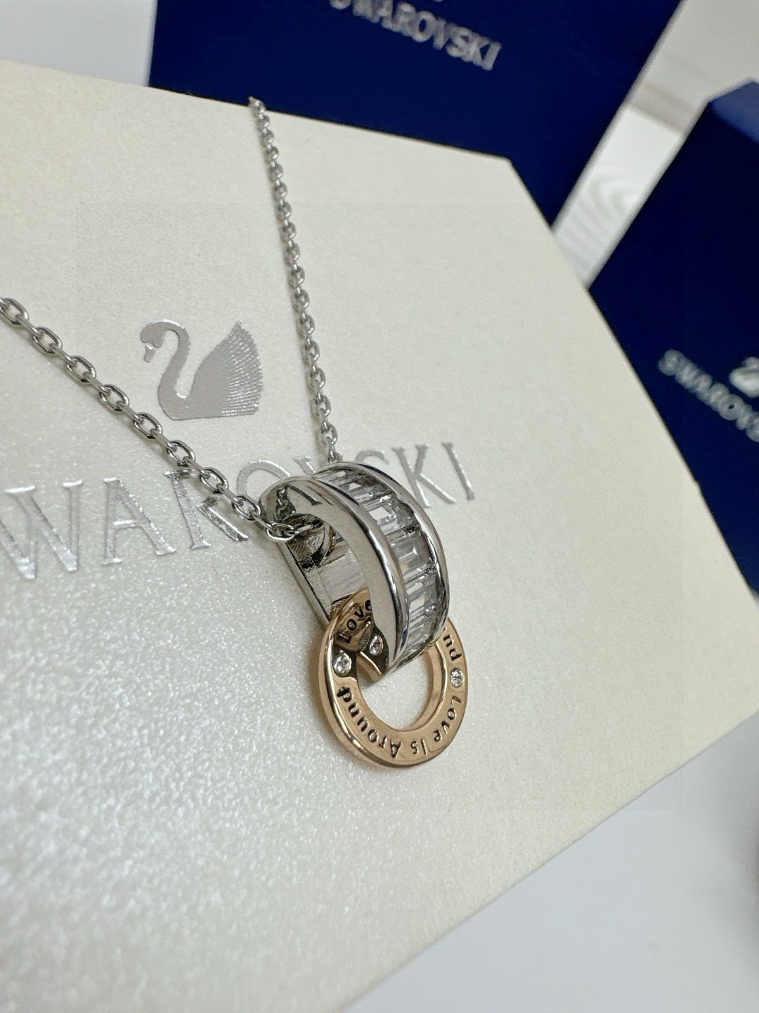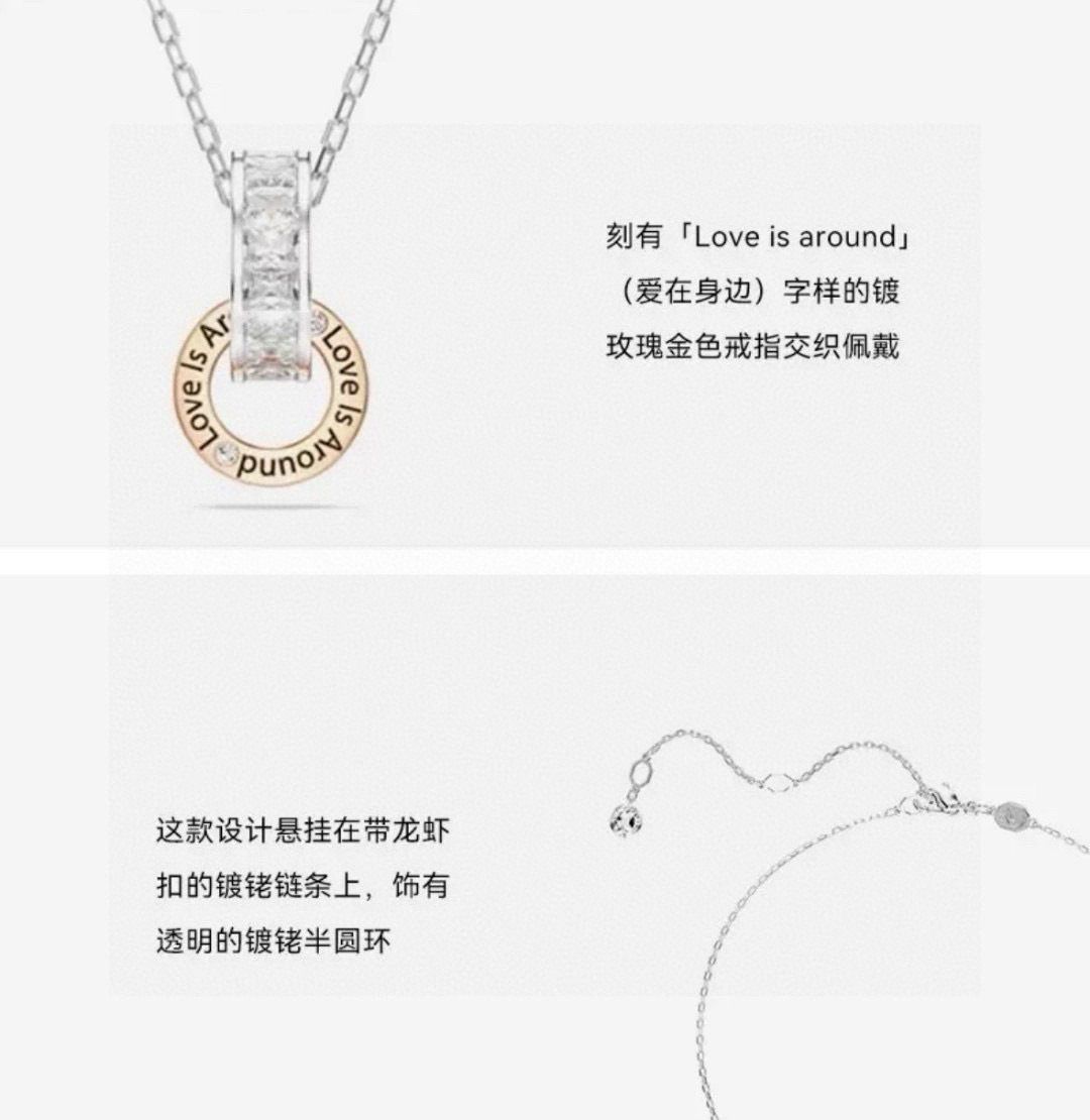 所见所得高品质礼盒全套施华洛世奇Connexus 项链全套包装 专柜700 这款Connexus 链坠别具意义 散发出浪漫气息 这款设计悬挂在带龙虾扣的镀铑链条上 饰有透明长方形切割施华洛世奇立方氧化错的镀铑半圆环 刻有 Love is around 爱在身边 字样